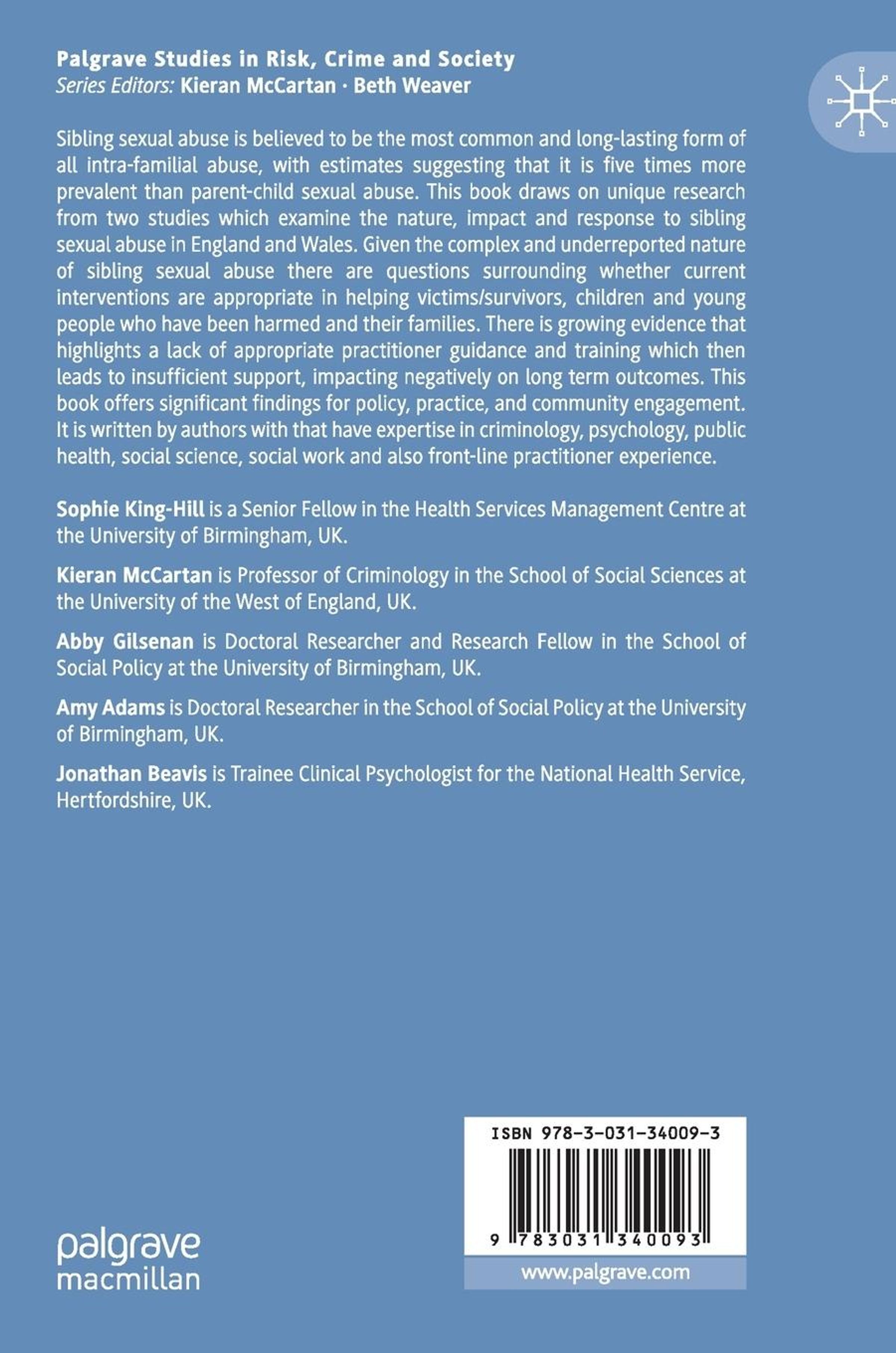 Sibling sexual abuse is believed to be the most common and long-lasting form of all intra-familial abuse, with estimates suggesting that it is five times more prevalent than parent-child sexual abuse. This book draws on unique research from two studies which examine the nature, impact and response to sibling sexual abuse in England and Wales. Given the complex and underreported nature of sibling sexual abuse there are questions surrounding whether current interventions are appropriate in helping victims / survivors, children and young people who have been harmed and their families. There is growing evidence that highlights a lack of appropriate practitioner guidance and training which then leads to insufficient support, impacting negatively on long term outcomes. This book offers significant findings for policy, practice, and community engagement. It is written by authors with that have expertise in criminology, psychology, public health, social science, social work and also front-line practitioner experience.