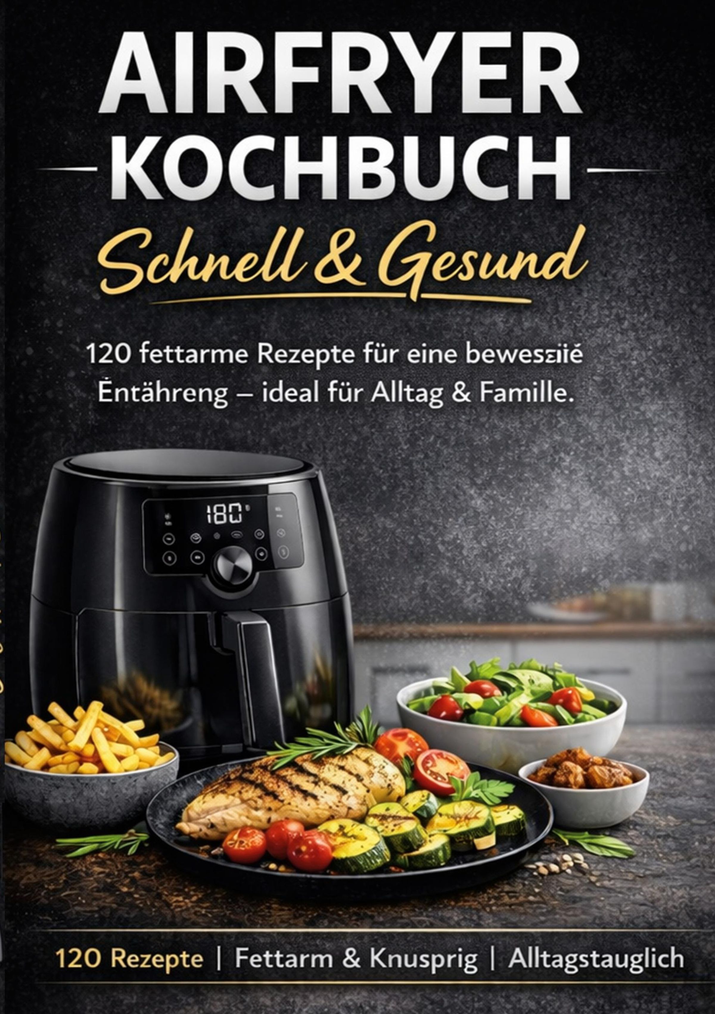 "Airfryer Kochbuch: Schnell & Gesund. 120 fettarme Rezepte für Alltag & Familie. Bild mit Airfryer und gesunden Speisen.", Buch