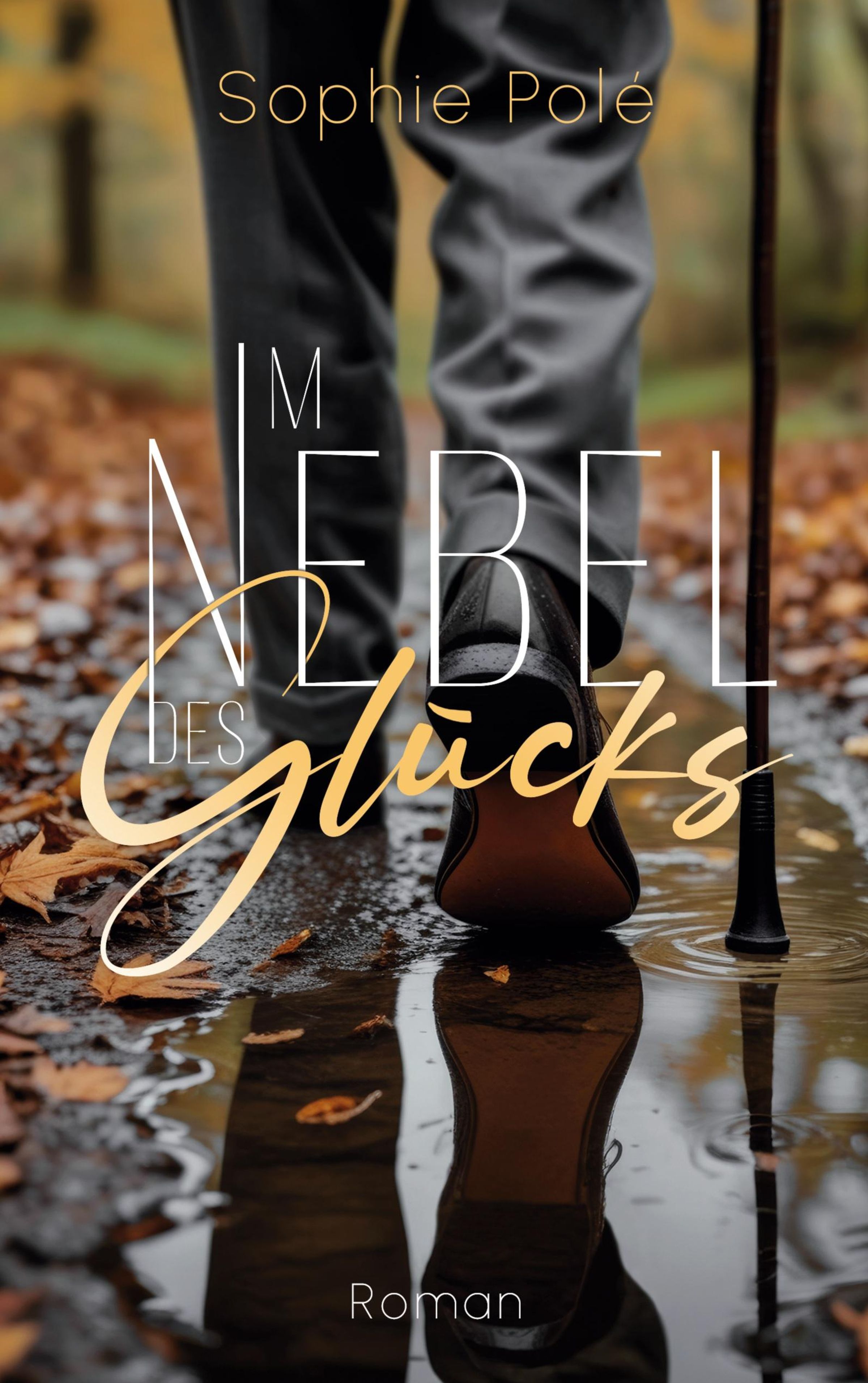 „Sophie Polé - Im Nebel des Glücks“ und „Roman“. Ein Bein, Gehstock auf nasser Blätterstraße., Buch