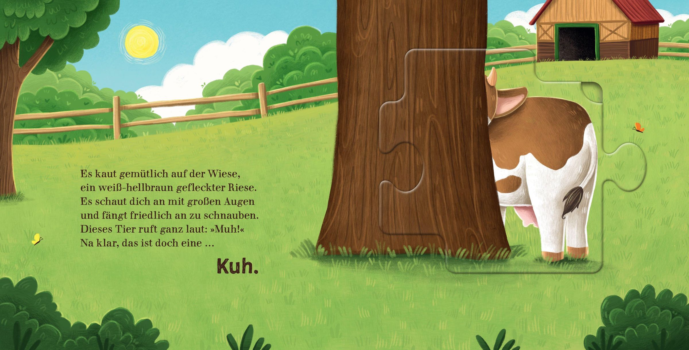 Auf dem Bauernhof ist immer was los, doch heute ist es ganz schön still hier. Wo haben sich die Tiere nur alle versteckt? Ein lustiger Ratespaß beginnt: Was ist weiß, wollig und lugt dort hinter der Hecke hervor? Und welches Tier ist rosa, grunzt und suhlt sich dahinten im Schlamm? Mithilfe von lustigen Reimen können Kinder erraten, welche Tiere sich auf den einzelnen Seiten versteckt haben. Und das Besondere: Sie können sie aus ihren Verstecken herauspuzzeln und am Ende zu einer niedlichen Tierkette zusammenlegen. Welches Tier führt die lustige Bauernhof-Polonaise wohl an? Ist es die Kuh oder doch das Huhn?