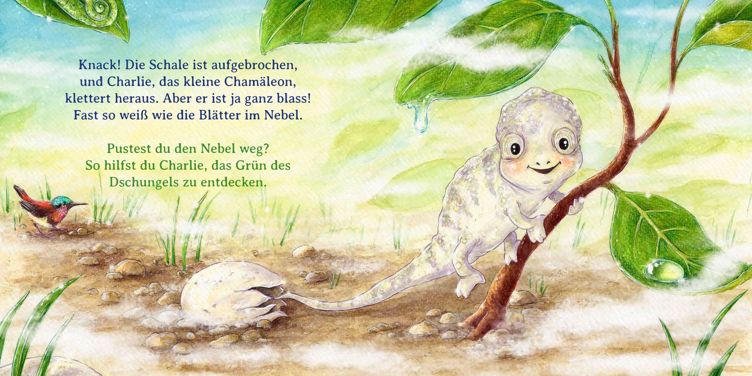 Aus einem weißen Ei schlüpft Charlie, das kleine Chamäleon. Im Dschungel um ihn herum ist alles herrlich bunt - so möchte er auch aussehen! Jetzt sind die Leser: innen gefragt! Sie dürfen Charlie helfen, nach und nach alle Farben kennenzulernen und sie anzunehmen. Grün wie die Blätter der Pflanzen, gelb wie die Sonne, schwarz wie der Panther, gepunktet wie ein kleiner Frosch und gestreift wie die Schlange. Doch am allerschönsten ist der kunterbunte Schmetterling! Ob es Charlie gelingt, auch in allen Farben der Welt zu leuchten?
