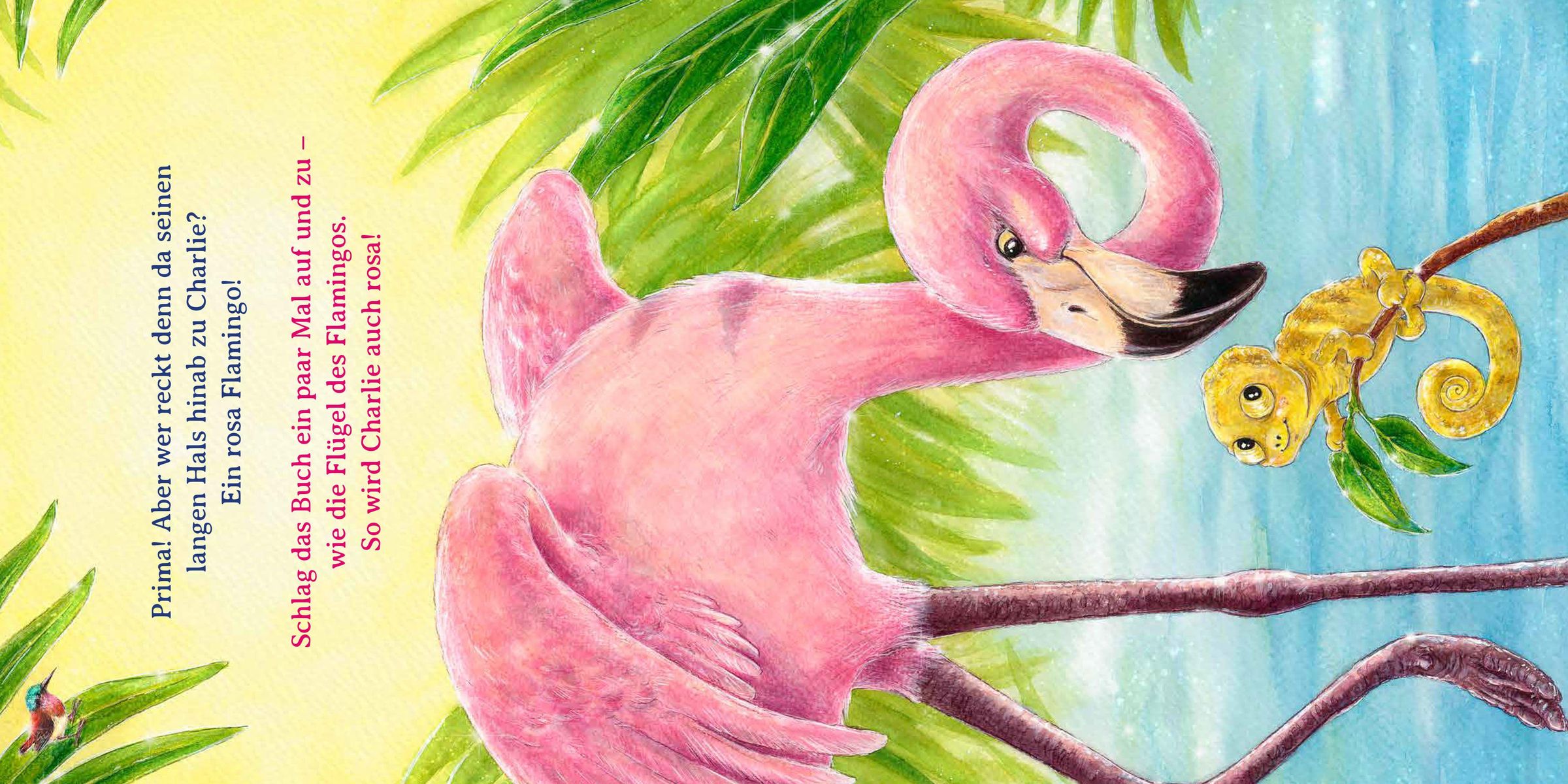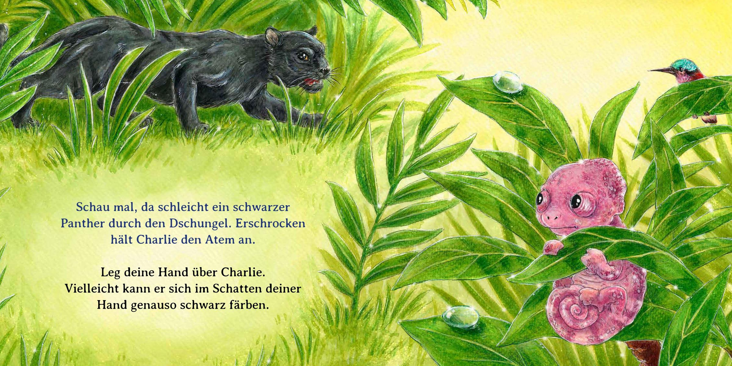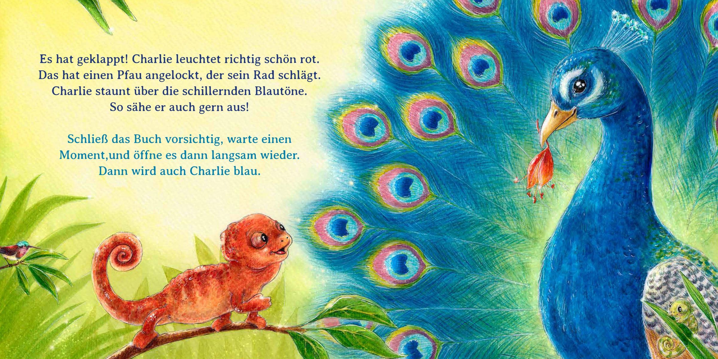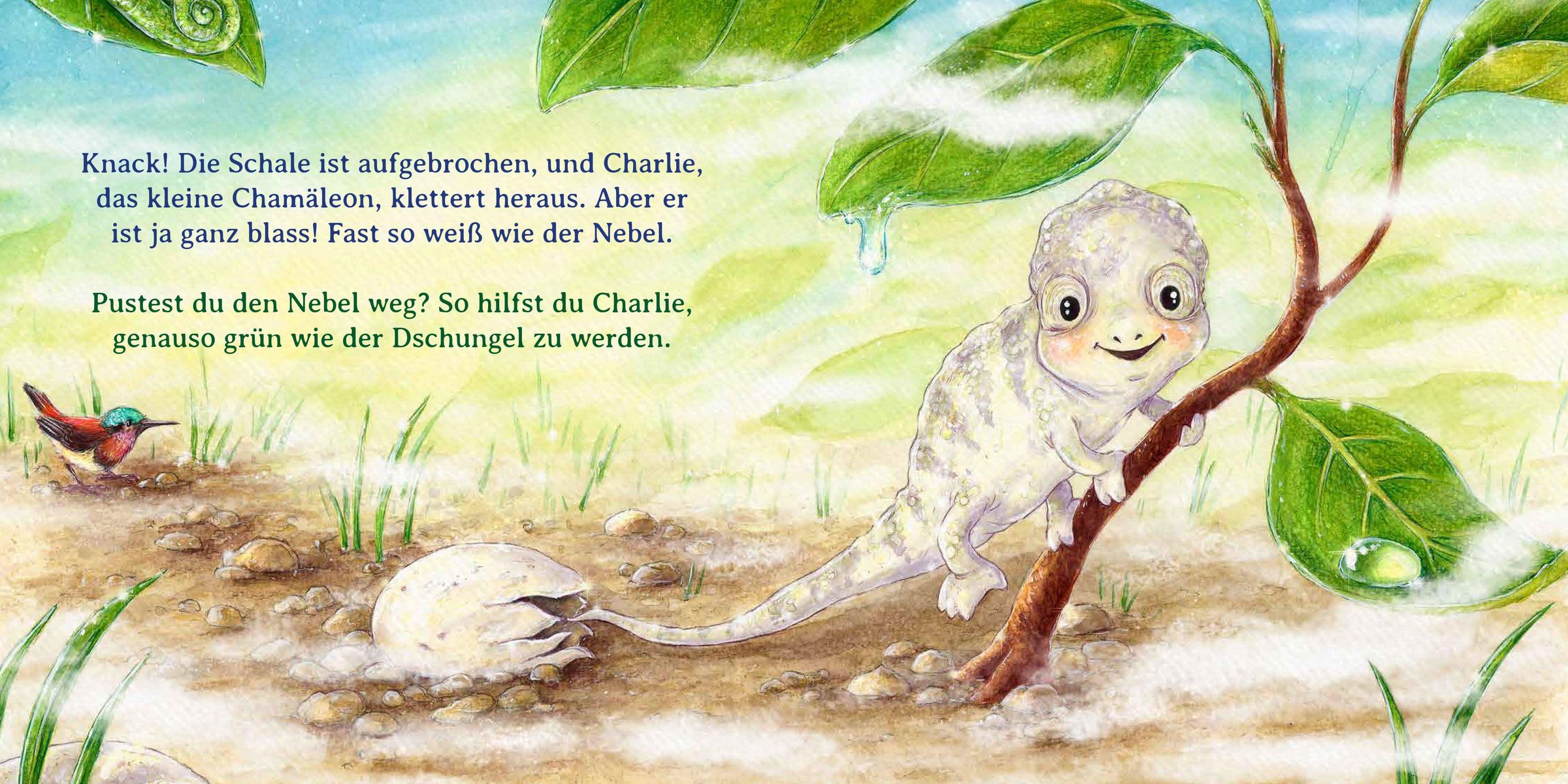Aus einem weißen Ei schlüpft Charlie, das kleine Chamäleon. Im Dschungel um ihn herum ist alles herrlich bunt - so möchte er auch aussehen! Jetzt bist du gefragt! Hilf Charlie, nach und nach alle Farben kennenzulernen und sie anzunehmen. Grün wie die Blätter der Pflanzen, gelb wie die Sonne, schwarz wie der Panther, gepunktet wie ein kleiner Frosch und gestreift wie die Schlange. Doch am allerschönsten ist der kunterbunte Schmetterling! Ob es Charlie gelingt, auch in allen Farben der Welt zu leuchten?