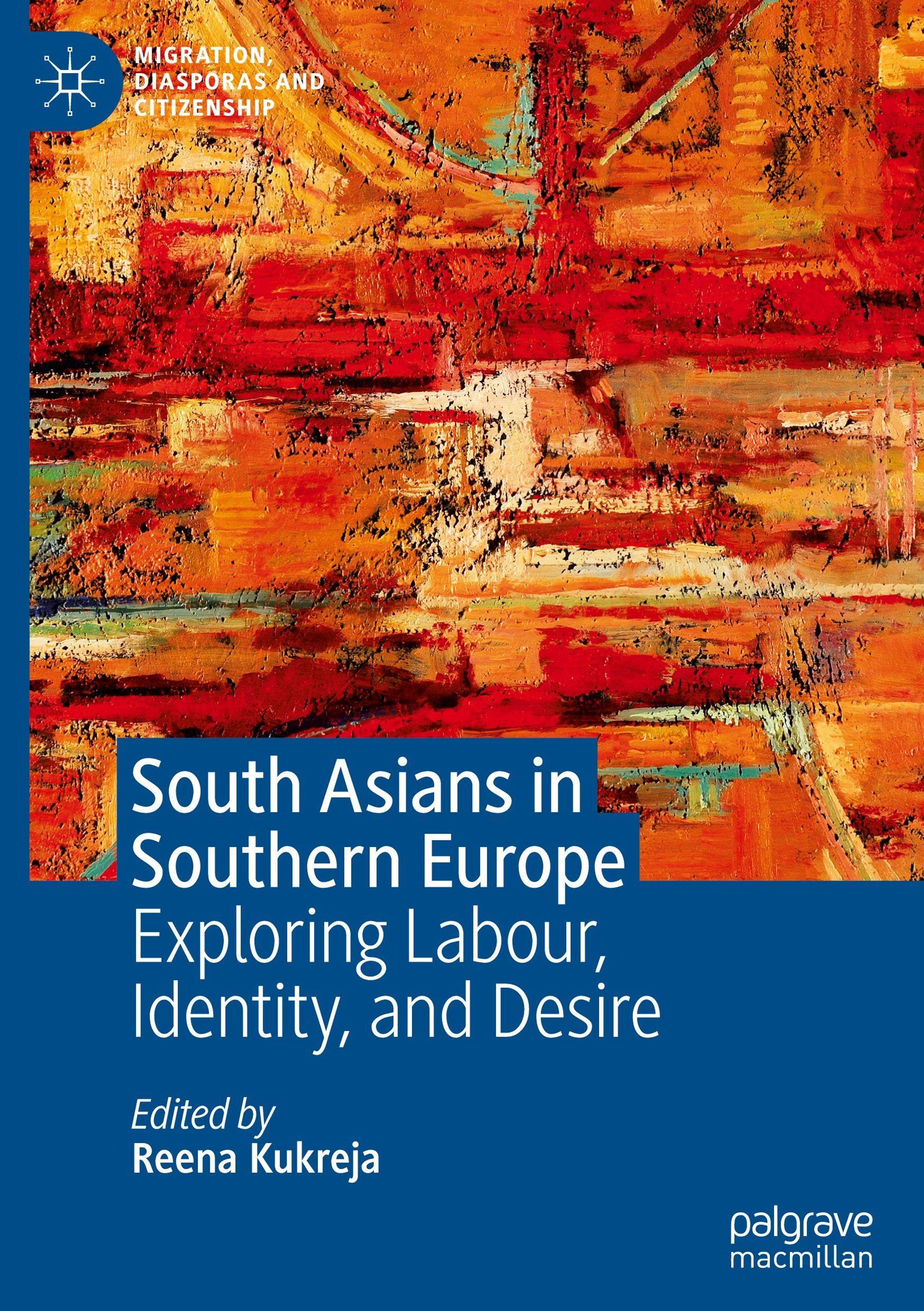 „South Asians in Southern Europe: Exploring Labour, Identity, and Desire“, bearbeitet von Reena Kukreja. Abstraktes Gemälde in Rot- und Orangetönen., Buch