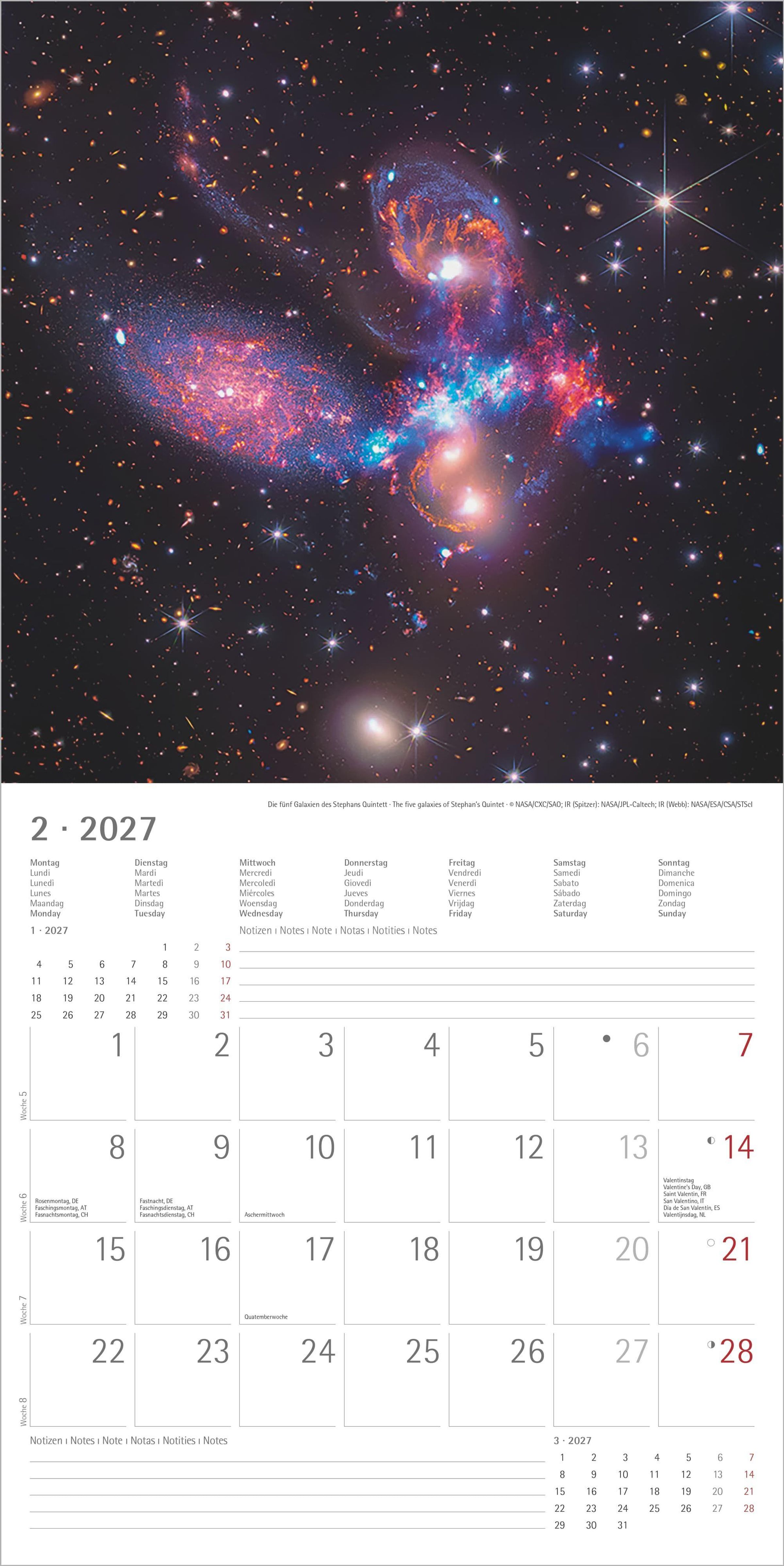 Begeben Sie sich auf eine visuelle Reise durch das Universum -- mit dem „Space 2027" Broschürenkalender. Zwölf farbintensive Aufnahmen von Spiralgalaxien, Nebeln, Planeten und Sternenexplosionen bringen die unendliche Weite des Alls direkt an Ihre Wand.