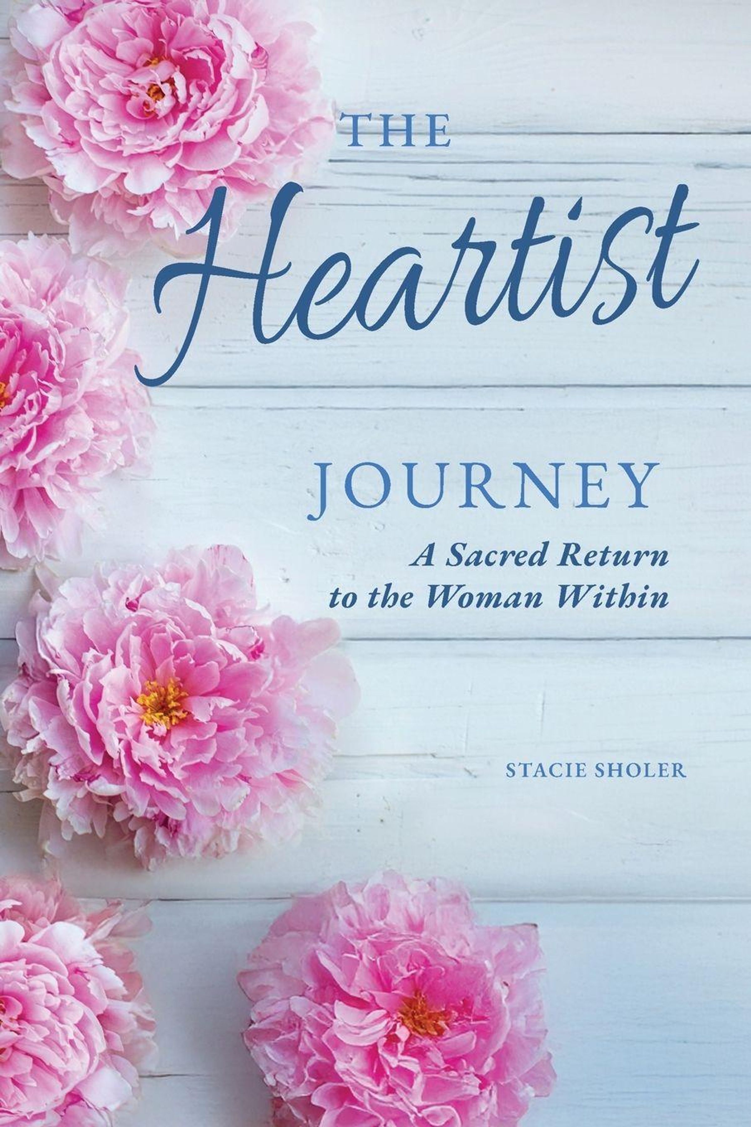 "The Heartist Journey: A Sacred Return to the Woman Within" von Stacie Sholer. Rosa Pfingstrosen auf hellem Holz., Buch