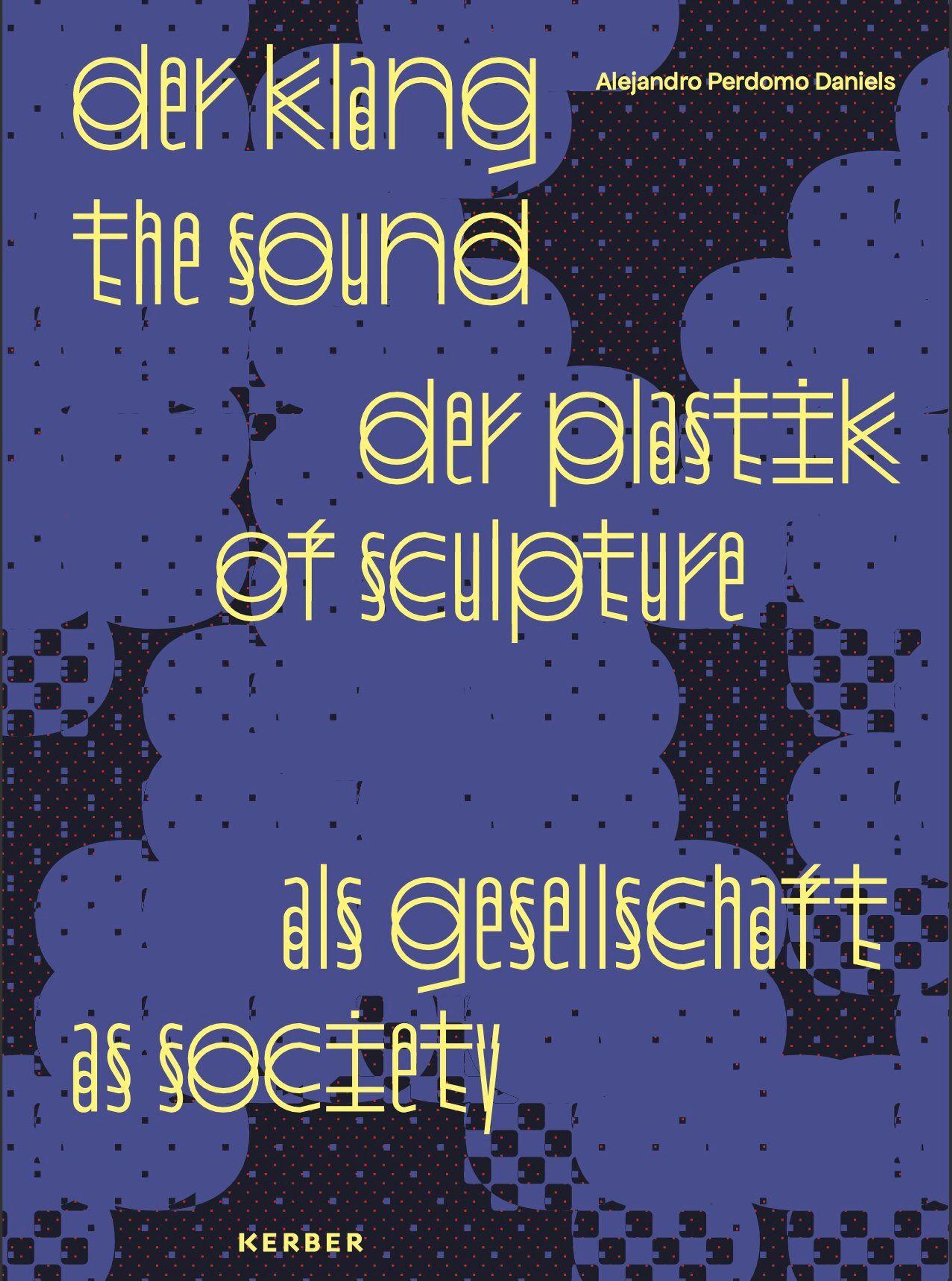 Der Text in gelber Schrift lautet: "der klang the sound der plastik of sculpture als gesellschaft as society". Künstler: Alejandro Perdomo Daniels. Hintergrund: abstrakte Muster in Blau und Schwarz. , Buch
