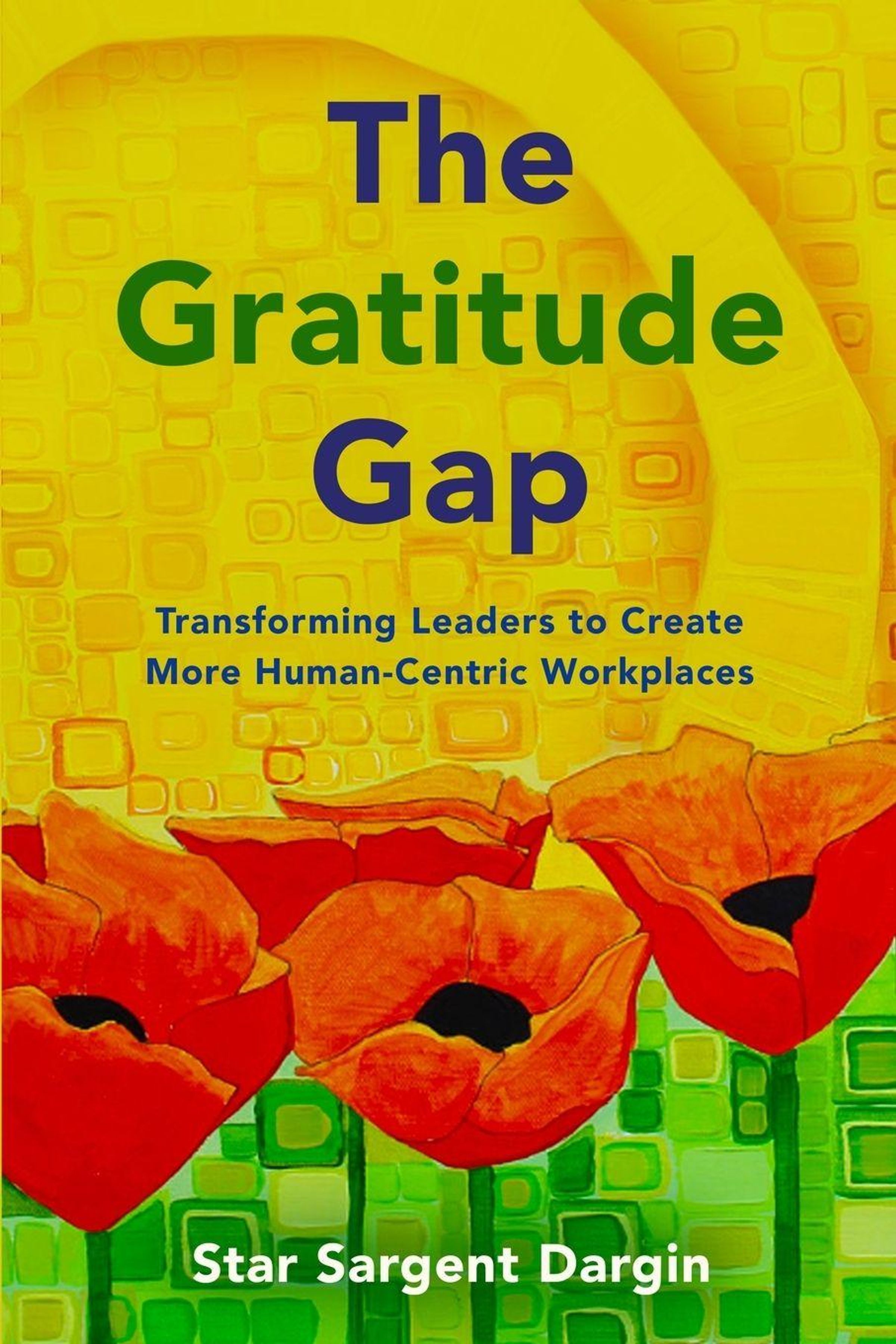 "The Gratitude Gap", "Transforming Leaders to Create More Human-Centric Workplaces". Illustration: Rote Mohnblumen vor gelbem Hintergrund., Buch