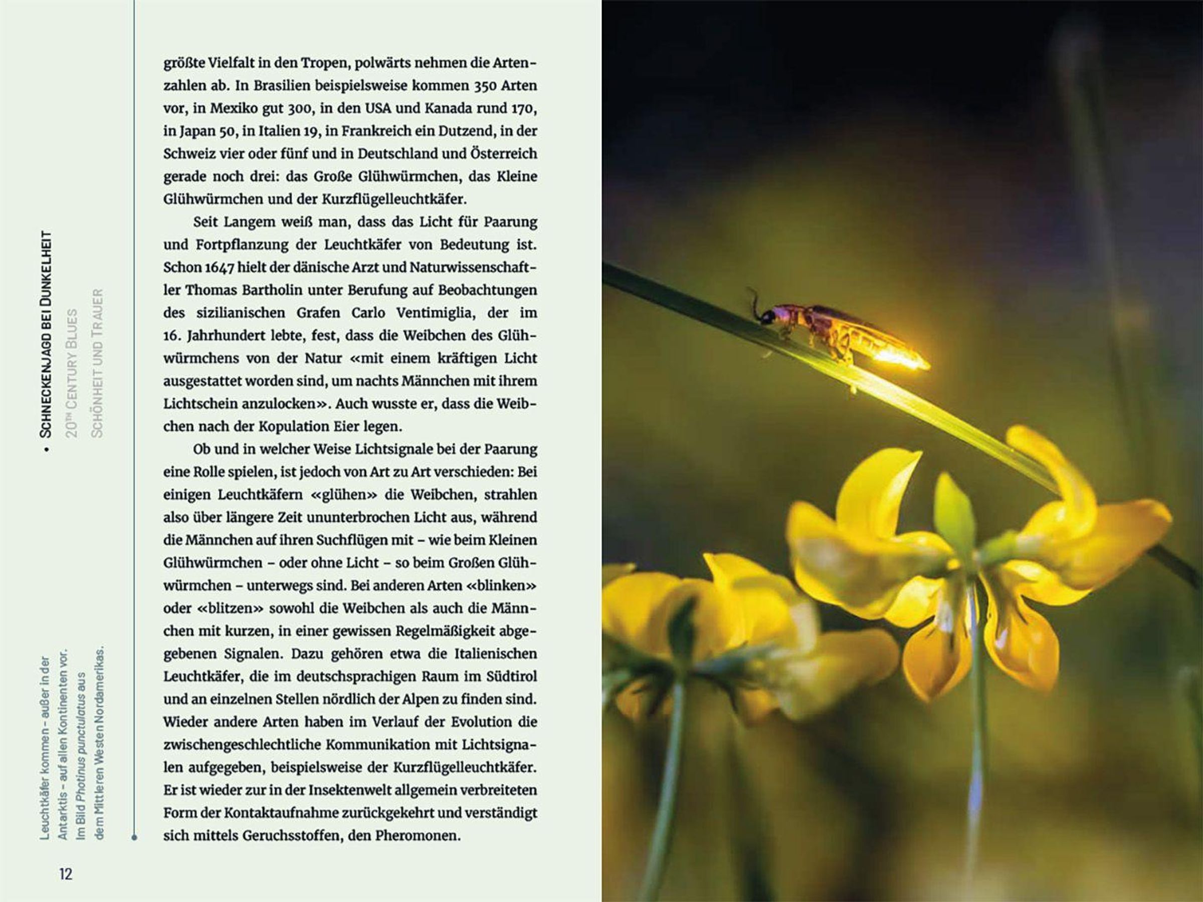 Glühwürmchen verkörpern wie hierzulande kaum ein anderes Tier den Zauber der Natur. Entführt uns der Lichtertanz der paarungsbereiten Leuchtkäfer während der Mittsommerzeit in eine Märchenwelt, so wird das Aufleuchten der giftigen und unappetitlich schmeckenden Glühwürmchenlarven von vielen Fressfeinden als Warnung verstanden. Leuchtkäfer geraten in Europa und weltweit nicht zuletzt durch die zunehmende Lichtverschmutzung in Bedrängnis - sie können aber in Wäldern und sogar im Siedlungsraum mit naturnahen Unterhaltmethoden auch gefördert werden. Glühwürmchen lösen seit langer Zeit vielfältige Assoziationen aus: Ihr Erscheinen wies schon in der Antike darauf hin, dass es Zeit war für die Saat der Hirse oder den Schnitt der Wiesen. Galten sie in der von Industrie und Verstädterung geprägten Belle Époque als Verkörperung einer romantischen Natur und als nächtliche Begleiter verliebter Pärchen, so stellte das Verschwinden der Glühwürmchen für den italienischen Schriftsteller und Filmemacher Pier Paolo Pasolini 1975 nicht nur eine ökologische, sondern auch eine gesellschaftliche Katastrophe dar. Und in Japan steht das Aufblinken der Leuchtkäfer in der Dämmerung seit Jahrhunderten für die Flüchtigkeit und Vergänglichkeit des Lebens.