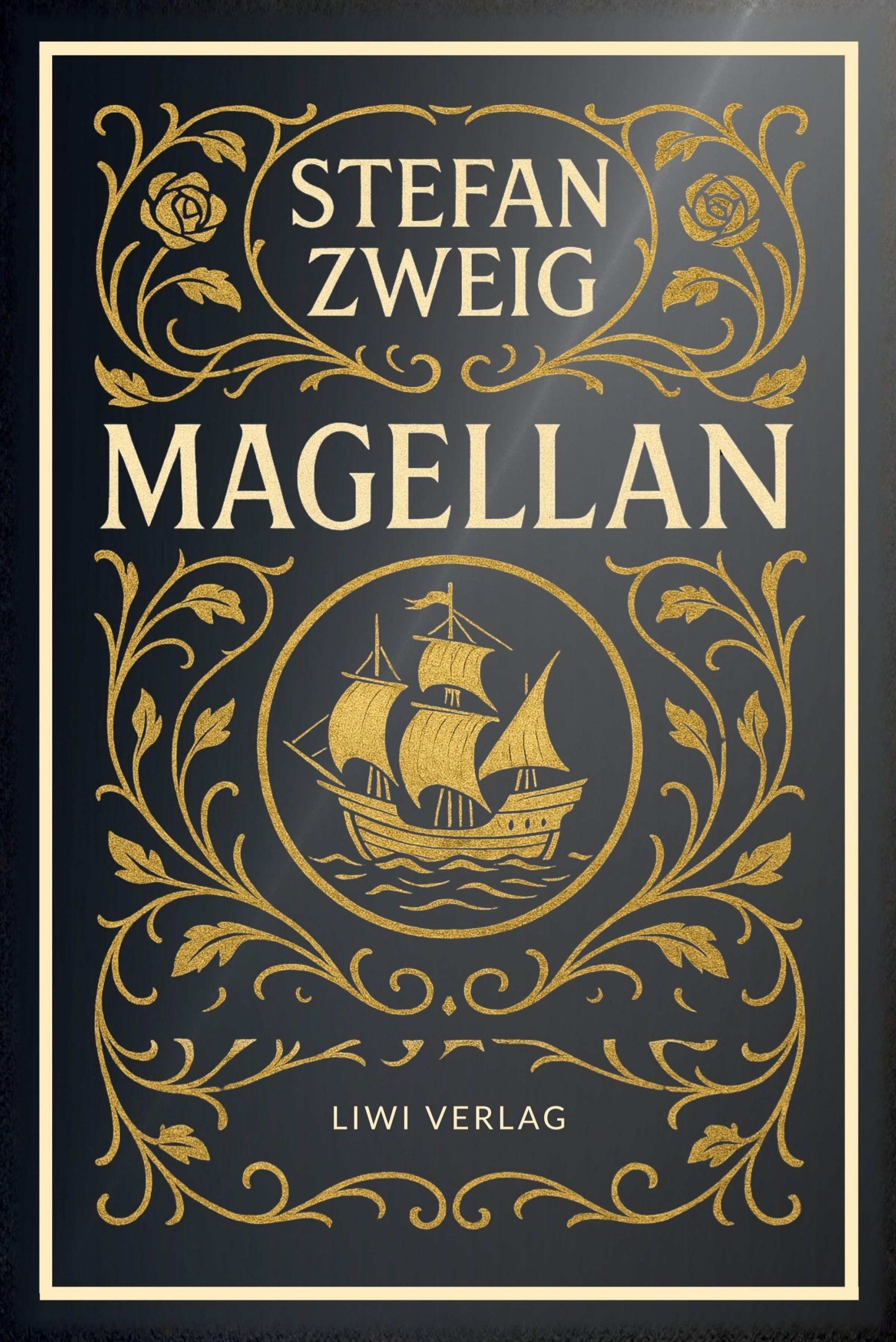 "STEFAN ZWEIG MAGELLAN LIWI VERLAG" in goldener Schrift, umgeben von floralen Mustern mit einem Segelschiff in der Mitte., Buch