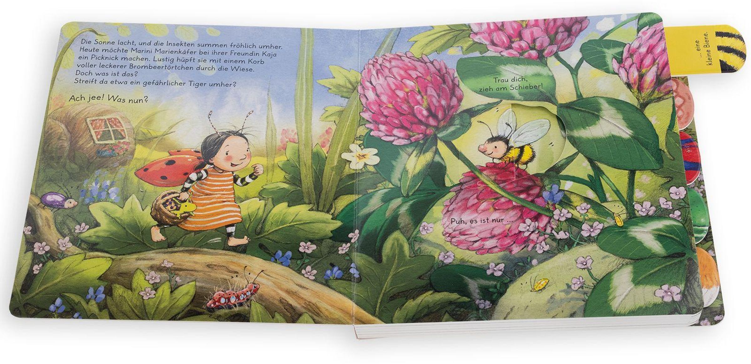 Marini Marienkäfer ist es ganz mulmig zumute: Gibt es hier auf der Wiese etwa wilde Tiere? Durch die Verwandelschiebertechnik zeigt sich, dass ihre Sorge unbegründet ist. Da streift nicht etwa ein wilder Tiger umher, sondern das schwarz-gelb schimmernde Muster hinter den Blättern gehört zu einer freundlichen Biene. Hinter jedem Schieber verbirgt sich etwas ganz Harmloses. Die "gefundenen" Wiesenfreunde begleiten sie nach und nach bis zu ihrer Freundin Kaja, die auf der anderen Seite der Wiese wohnt.