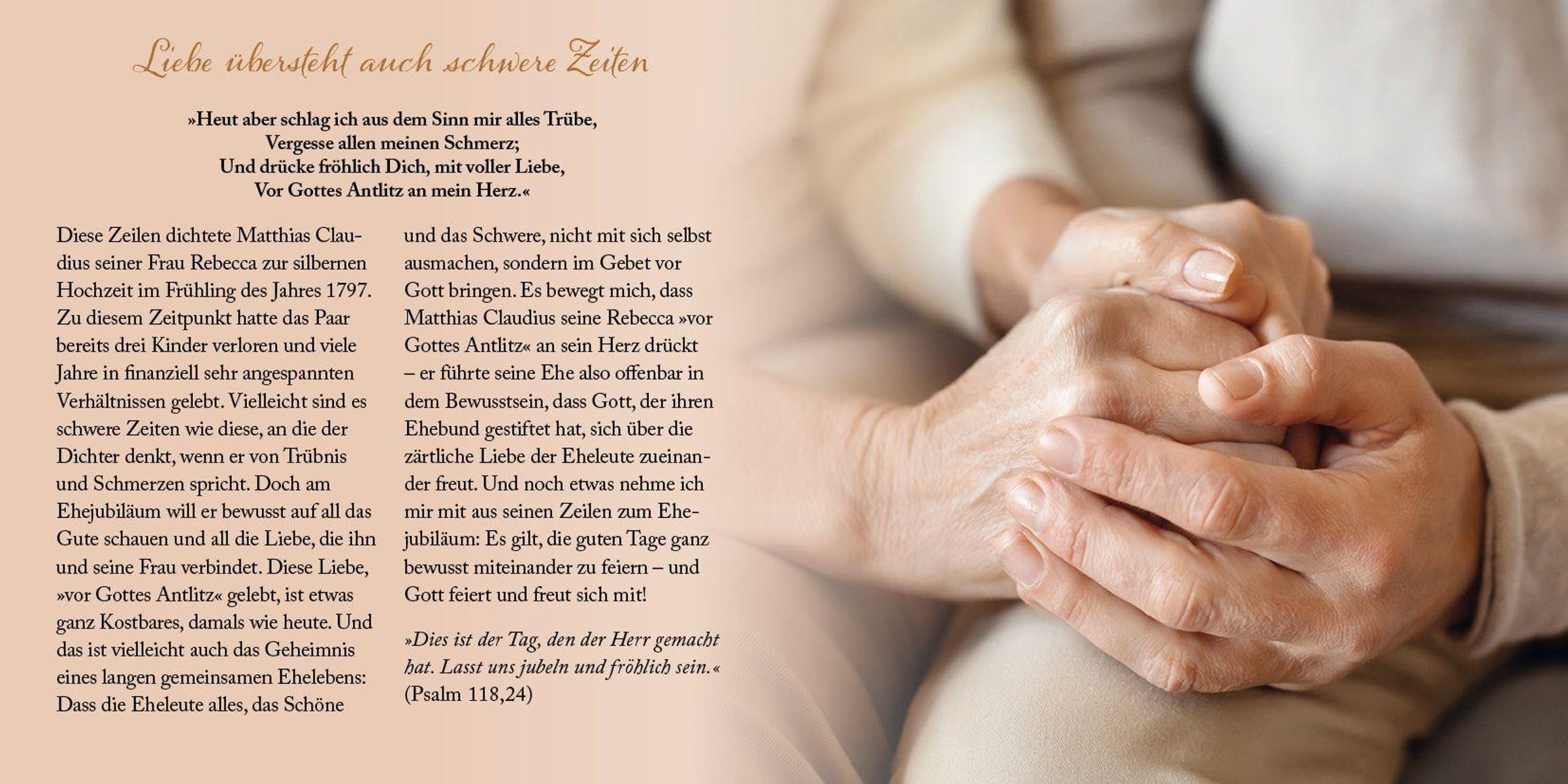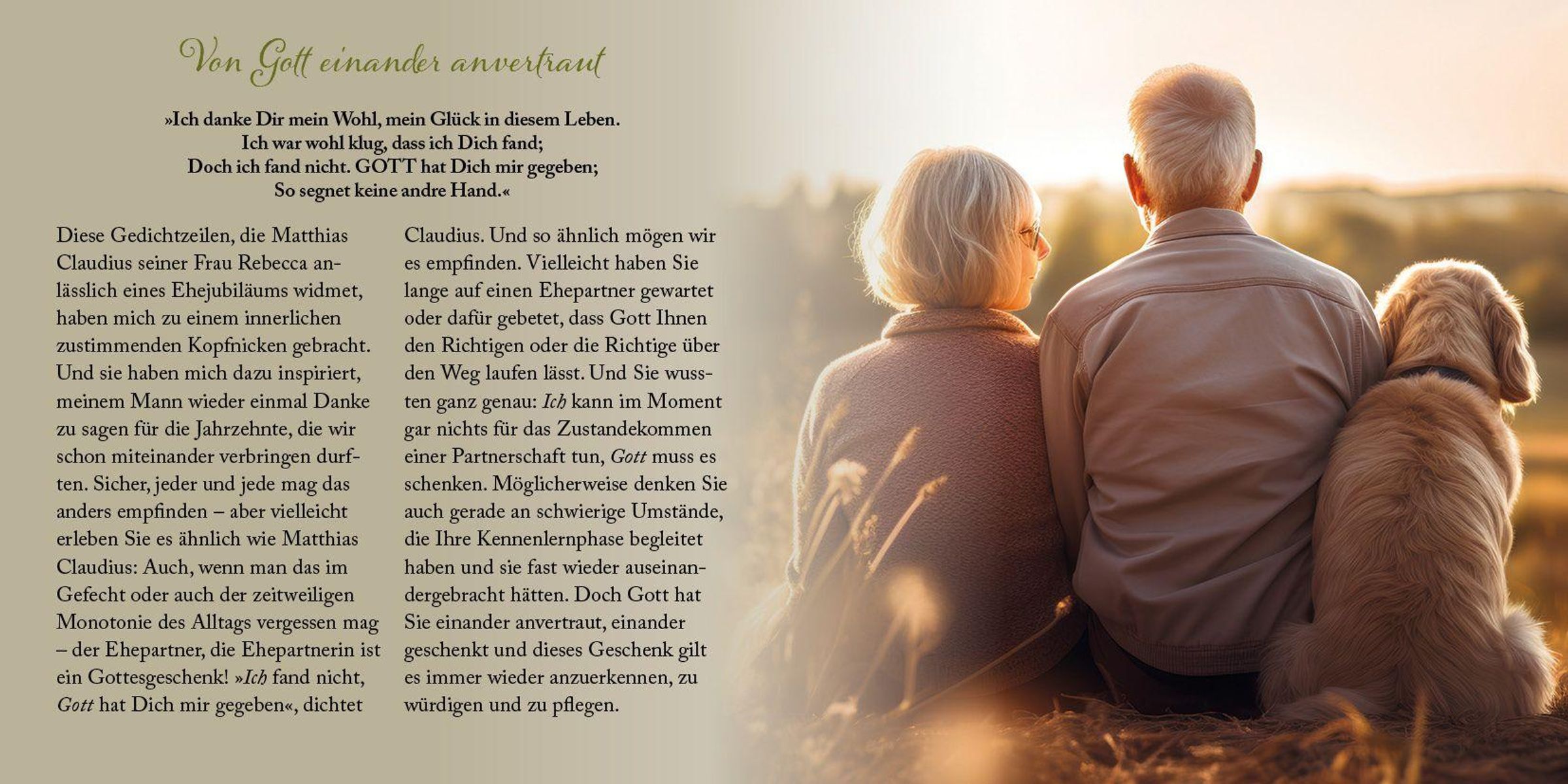 Fünfzig Jahre gemeinsames Leben, in guten wie in herausfordernden Zeiten - das ist Grund zum Staunen. Zur Freude. Zum dankbaren Erinnern an viele wundervolle Momente. Zum nachdenklichen Rückblick auf schwere Zeiten, gemeistert im Vertrauen auf Gott und in Treue zueinander. Zum erwartungsvollen und hoffnungsfrohen Vorausblick auf - möge Gott es schenken - noch viele weitere gesegnete gemeinsame Jahre. Dabei begleiten die Impulse in diesem Heft: biblisch, einfühlsam, lebensnah und inspirierend.