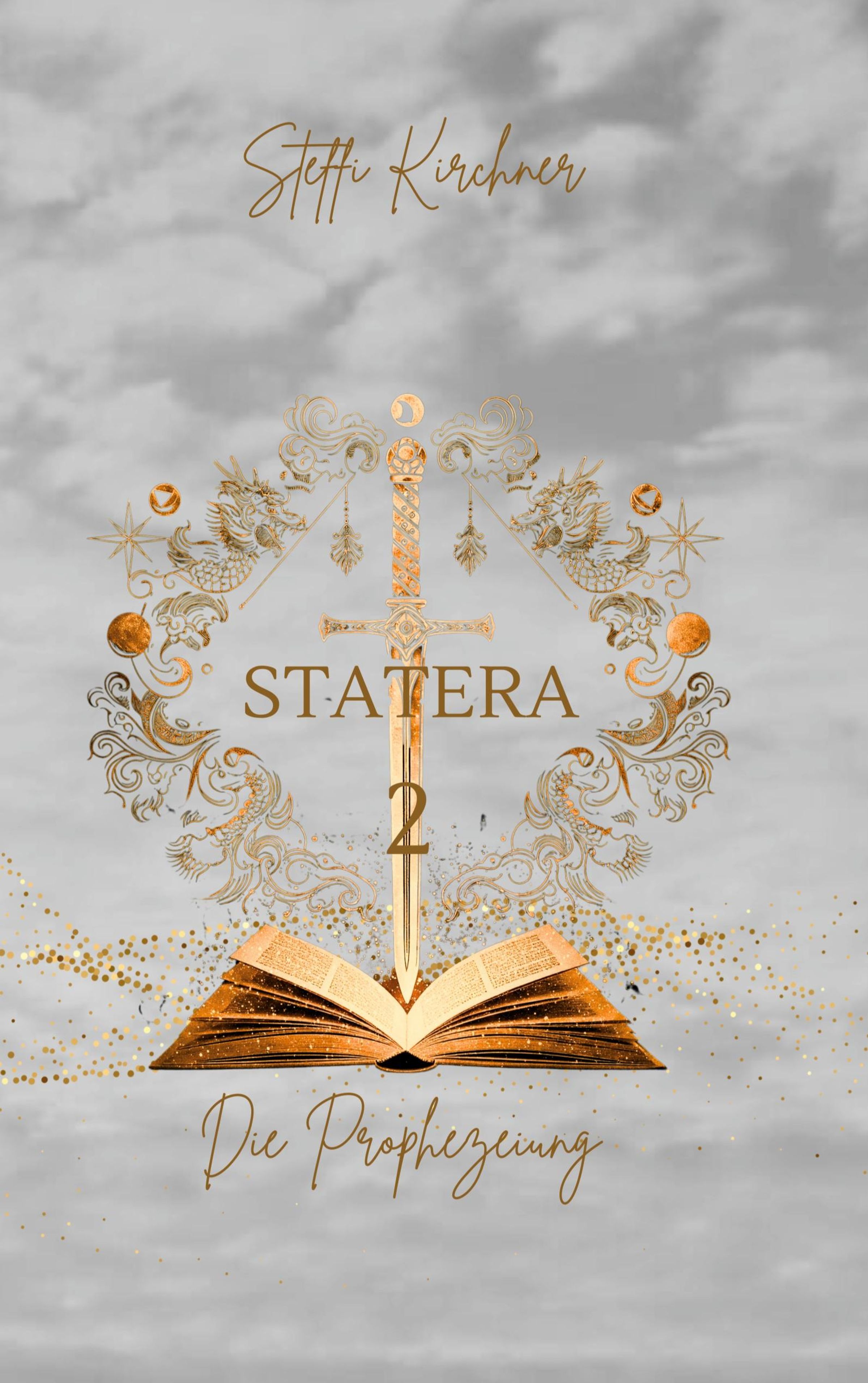 "Statera 2, Die Prophezeiung, Steffi Kirchner" in goldener Schrift auf grauem Hintergrund, mit Buch und Schwert., Buch