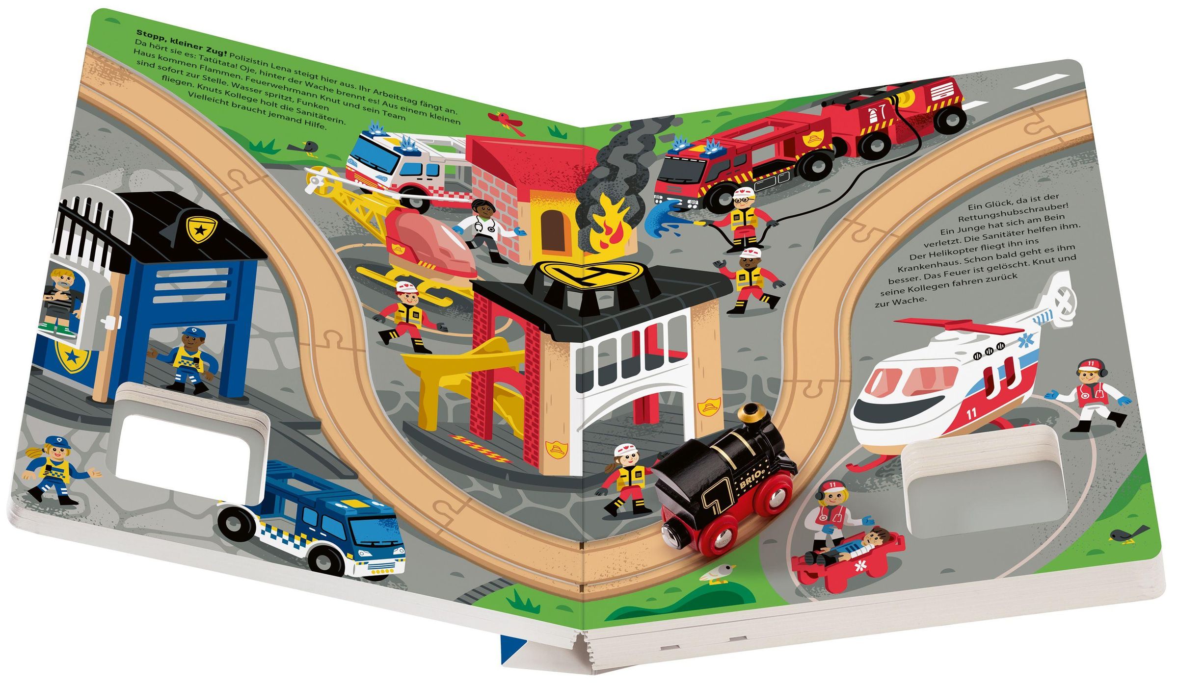 Buch aufklappen, Zug auf die Gleisspuren im Buch setzen und schon beginnt der BRIO-Zug seine Fahrt! Es geht durch die Stadt, wo am Bahnhof schon Menschen warten, vorbei an der Polizeiwache und der Feuerwehr, die gerade einen Brand löscht; weiter entlang des Bauernhofs, wo Feuerwehrmann Nick Erdbeeren kauft und über die Brücke, unter der gerade eine Großbaustelle ist. Letzte Station des Zuges ist der Hafen. Dort warten das Fracht-Flugzeug und der Güterzug bereits auf die Verladung der Container.