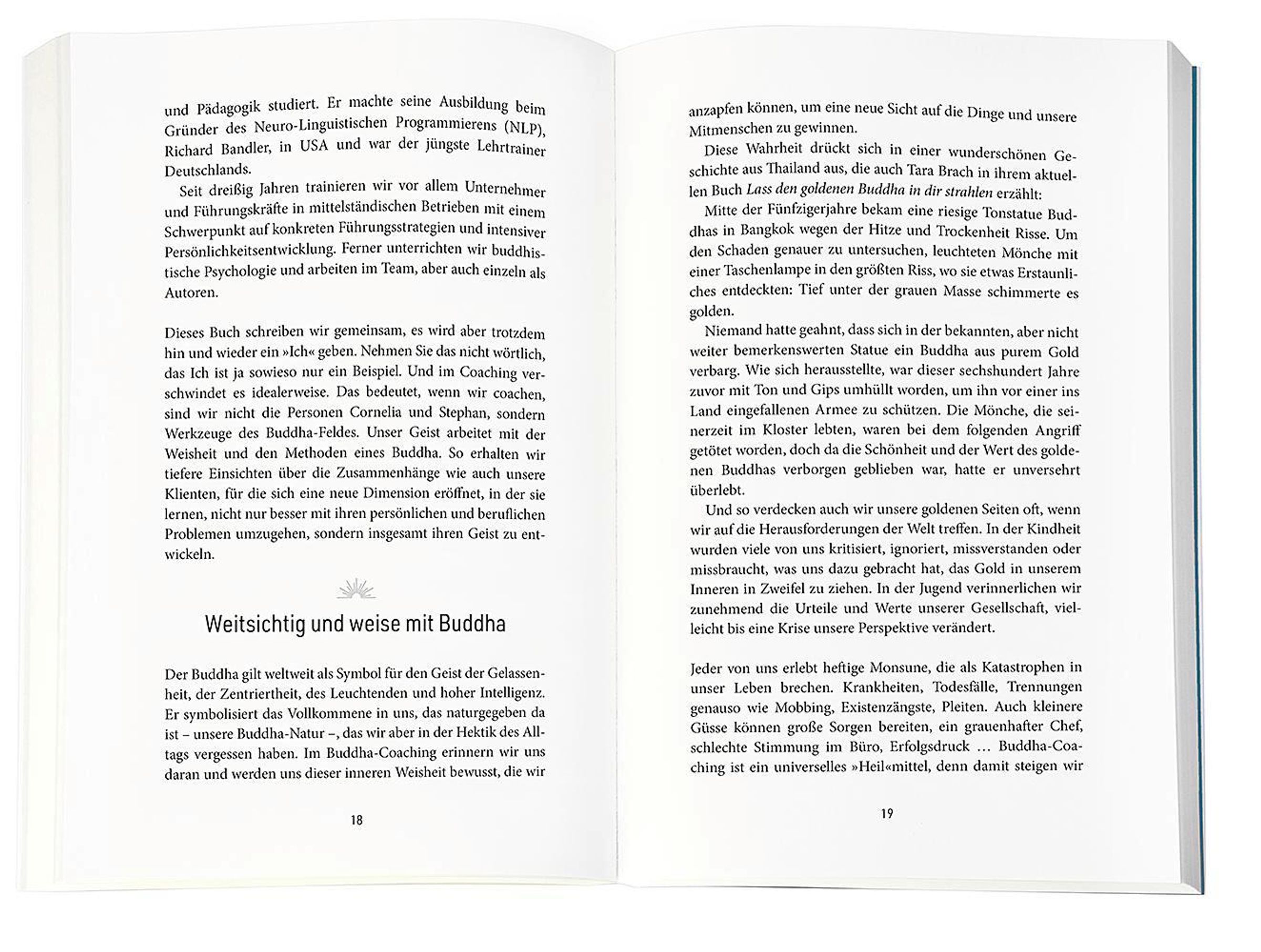 Dass es auch anders geht, zeigen die beiden Leadership-Expert*innen in ihrem neuen praktischen Ratgeber. In "Buddha-Coaching" verbinden Cornelia und Stephan Schwarz die Grundlagen buddhistischer Psychologie mit ihrer über 30-jährigen Erfahrung im Führungskräfte-Training.