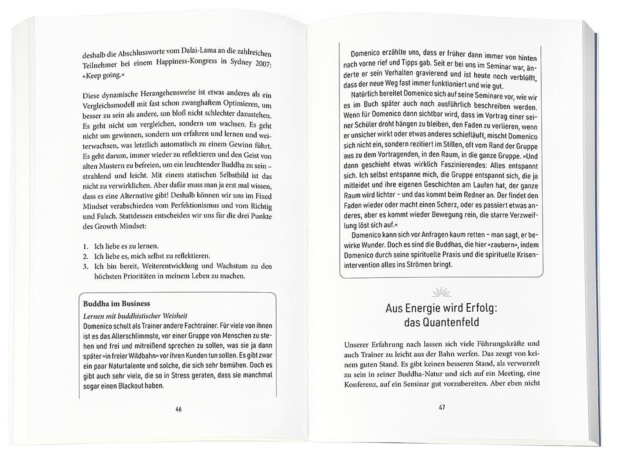 Sie zeigen u. a. wie man den Geist trainieren kann, um charismatisch auch schwierige Meetings zu leiten, wie echter Team-Spirit mit Achtsamkeit ganz natürlich entsteht und wie Meditation Entspannung und Ruhe bringt und den Blick aufs Wesentliche schärft.