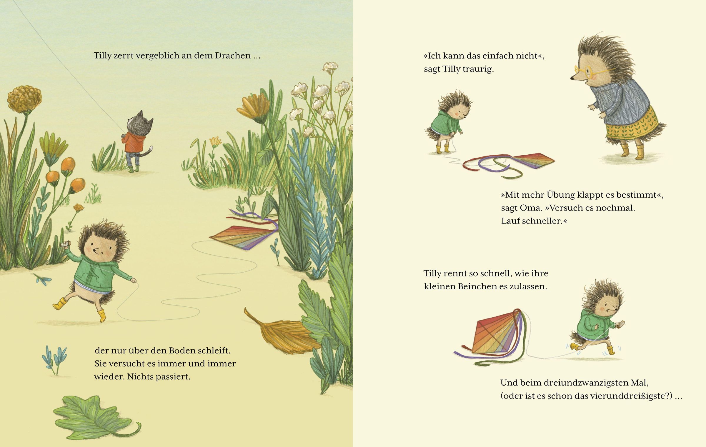 An einem stürmischen Tag lassen die beiden einen Drachen steigen, der Tilly ein bisschen abheben lässt.