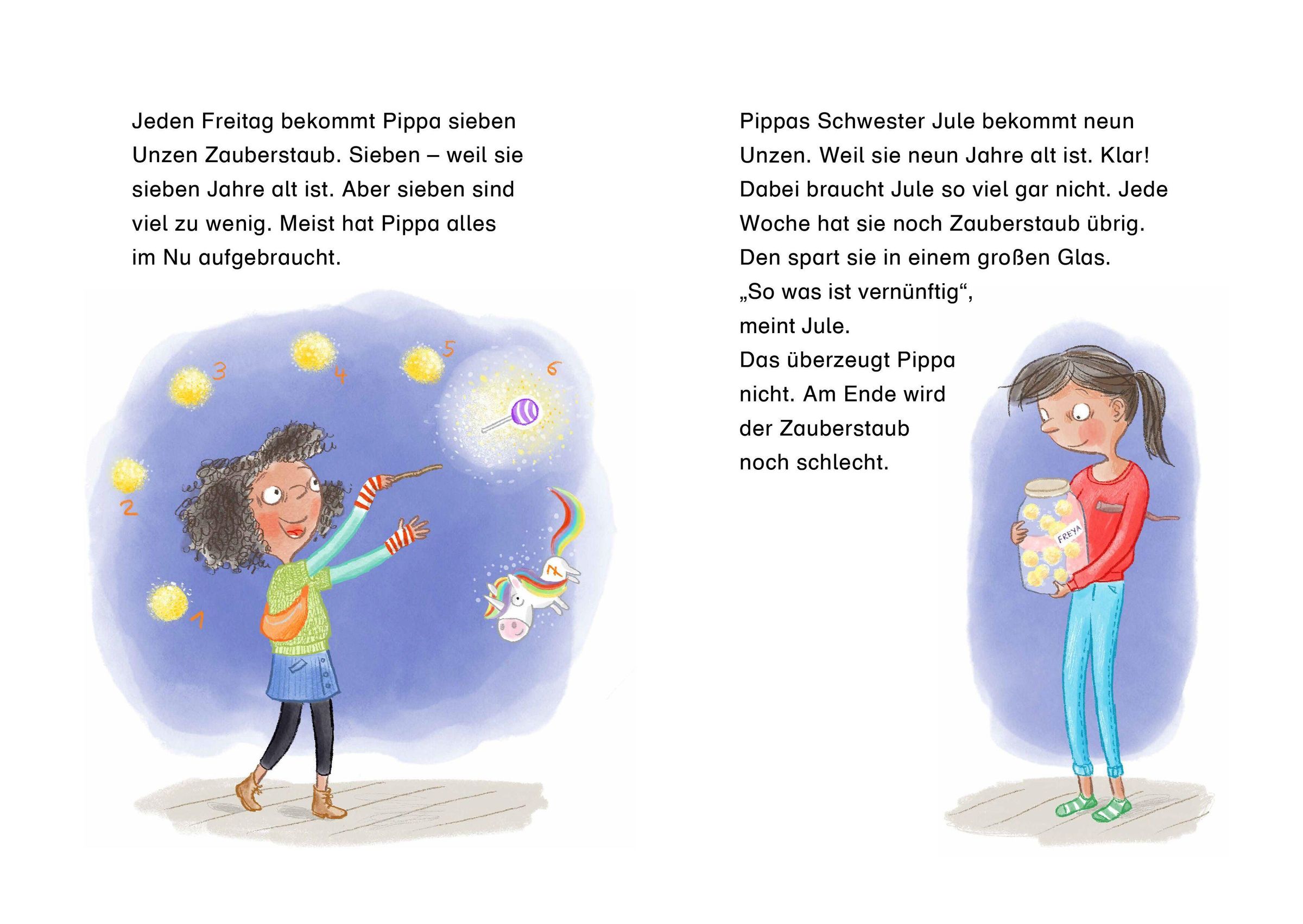 Normale Kinder bekommen Taschengeld. Pippa nicht - sie ist eine kleine Hexe! Statt Münzen gibts Zauberstaub: sieben Unzen pro Woche. Damit erfüllt sich Pippa jeden Wunsch: Kiba-Lollis, Mini-Einhörner, Welpen mit rosa Schlappohren ... Doch ehe sie sichs versieht, ist alles aufgebraucht. Dabei steht der Geburtstag ihrer Schwester Freya vor der Tür und sie hat noch kein Geschenk!