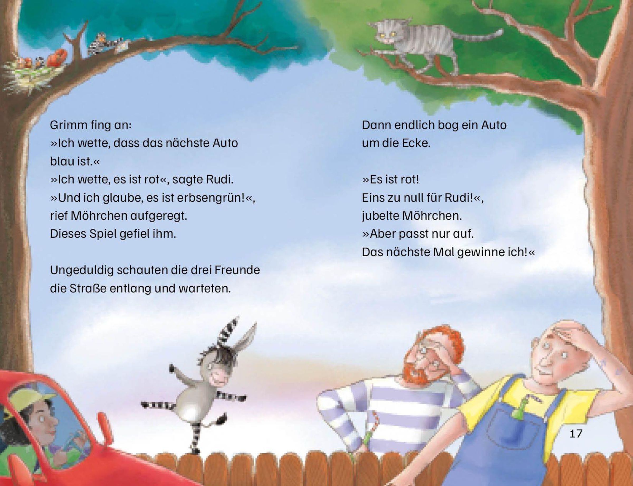 "Grimm und Möhrchen düsen los" steht auf dem Cover mit grünen Bäumen. Ein Esel und ein Tier im roten Auto, Blumen am Weg., Buch