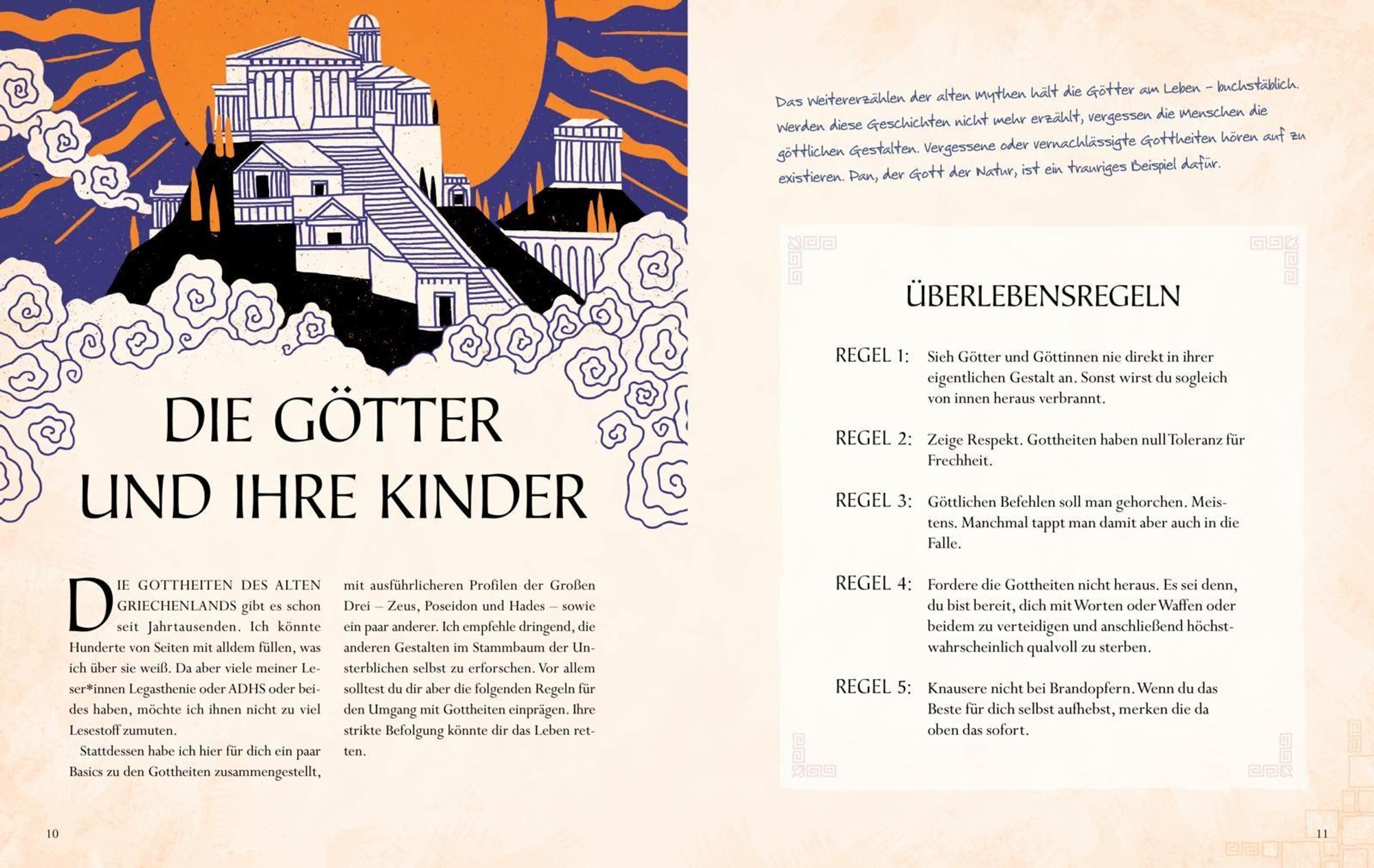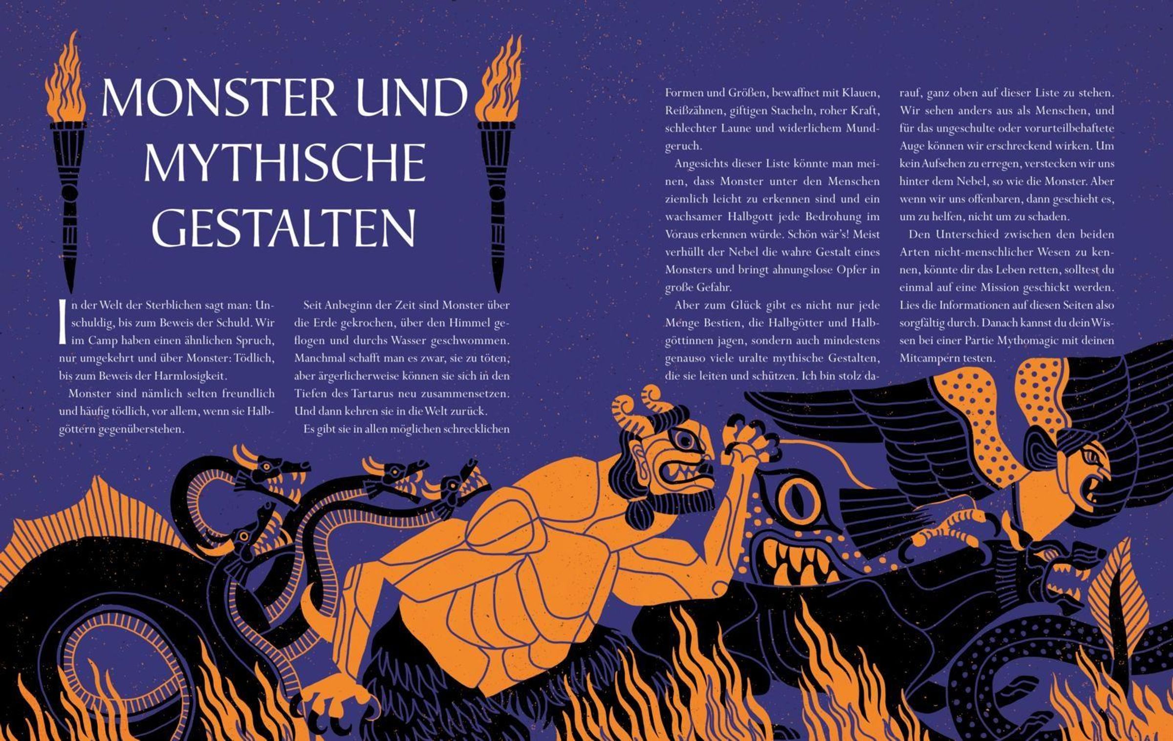 Ein Glück also, dass es in der Bibliothek von Camp Half-Blood dieses reich illustrierte Handbuch zur griechischen Mythologie gibt. Es erzählt die wichtigsten Mythen und enthält Kurzporträts der mächtigsten Götter, dazu werden die gefährlichsten Monster wie die Medusa und der Minotaurus vorgestellt und mögliche Verteidigungstechniken erläutert. Auch die beliebten Halbgott-Helden aus dem Camp dürfen bei den Porträts natürlich nicht fehlen.