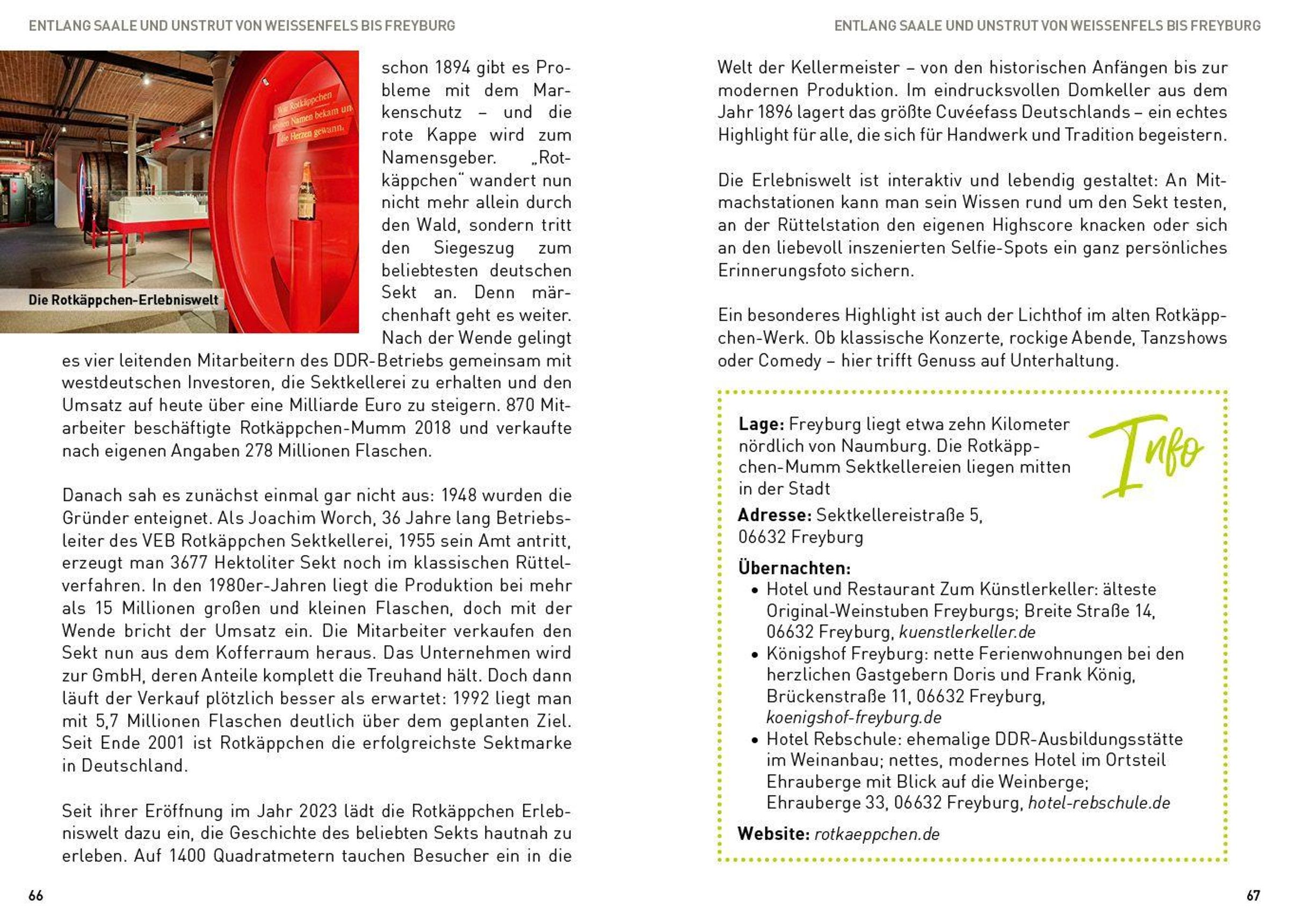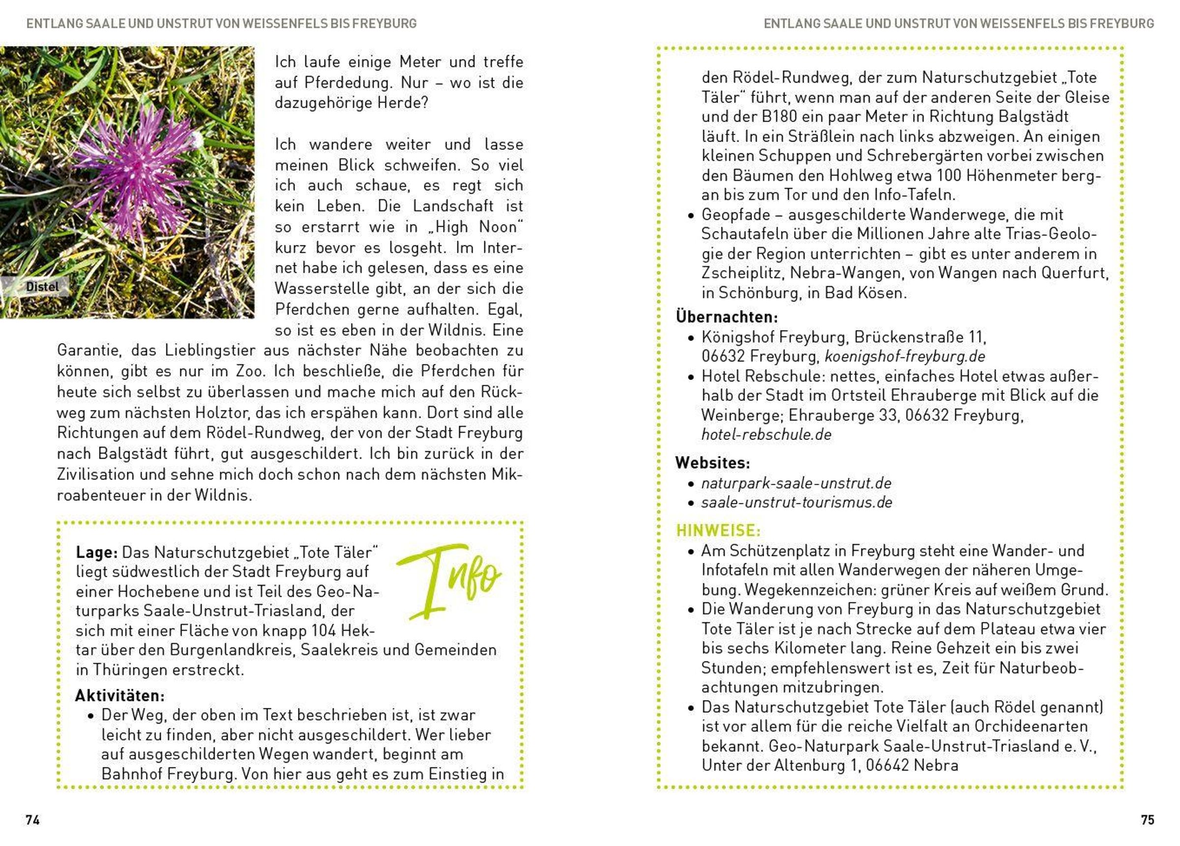 In 50 Mikroabenteuern erkunden die beiden Autorinnen Weinberge und Naturparks aus ganz persönlicher Sicht und mit besonderem Fokus auf Outdoor und Aktivsein. Entdecken Sie Wasserwanderrouten und Waldwanderungen, die besten Fotospots entlang der Steilufer und treffen Sie die engagierten jungen Winzer des Anbaugebiets. Lassen Sie sich auf weniger bekannten Pfaden durch die großen Kulturdenkmäler wie den Naumburger Dom, UNESCO-Weltkulturerbe seit 2018, führen, entspannen Sie sich in den Kurorten Bad Dürrenberg, Bad Sulza oder auch Bad Lauchstädt. Auch wenn Sie die Region schon kennen: Sie werden überrascht sein, wie viel Abenteuer es direkt vor der Haustür gibt!