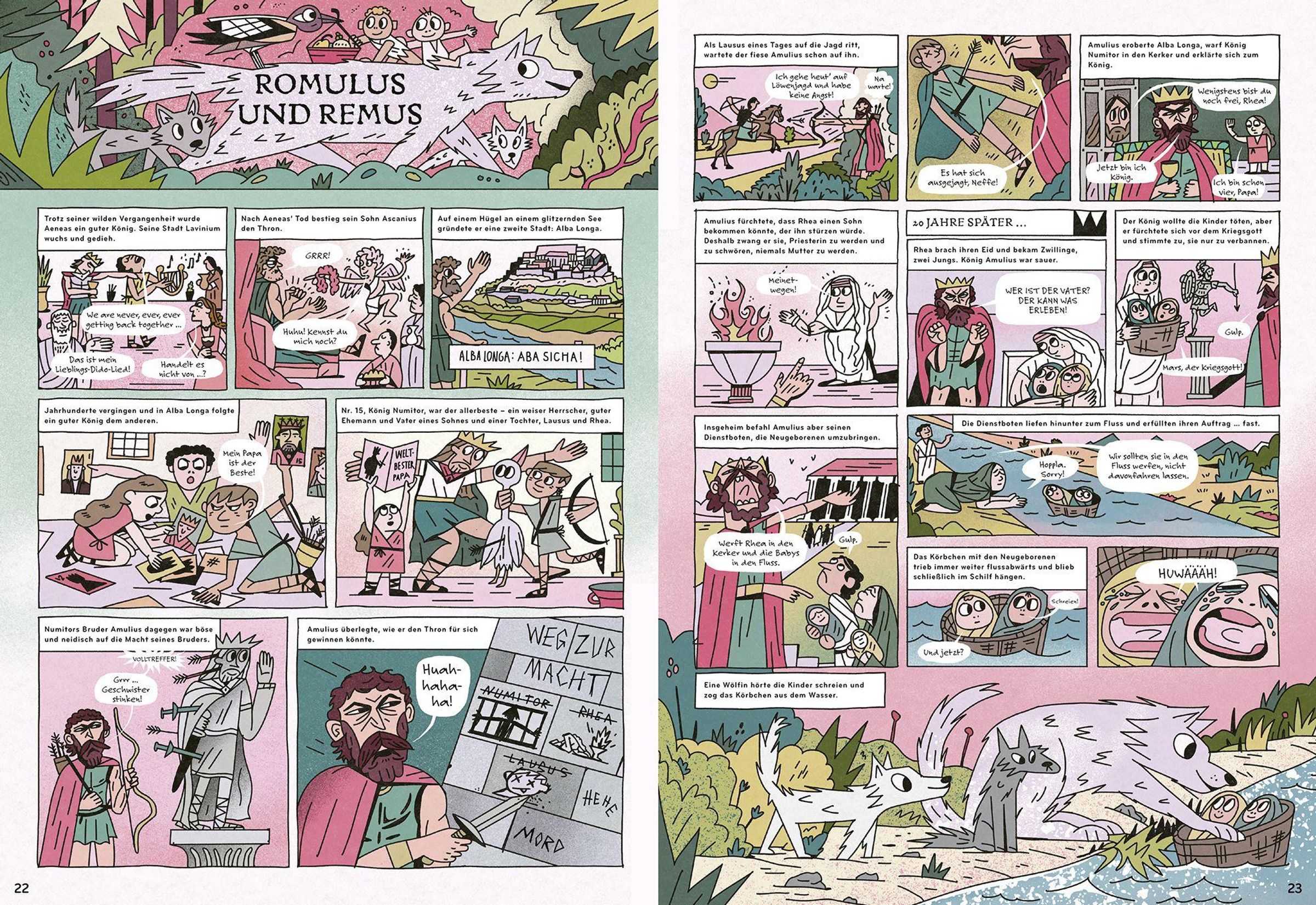 Witzig, bunt und voller Wissen: In diesem rasanten Comic-Band nimmt uns Stephen Davies wieder einmal mit in die Welt der Mythen, Sagen und Legenden. Diesmal dreht sich alles um die römische Antike. In humorvoll gezeichneten Comic-Panels erfahren Kinder nicht nur die abenteuerlichen Geschichten, die man sich über Jupiter, Merkur und Co. erzählte, sondern auch, wie Rom der Legende nach gegründet wurde, wer über das Römische Reich herrschte und wie man dort eigentlich lebte. Von Aeneas über Romulus und Remus bis hin zu Julius Caesar trifft man auf die spannendsten Figuren der römischen Antike. Die perfekte Einführung in die Sagenwelt des Alten Roms für Comic-Fans ab 8 Jahren!