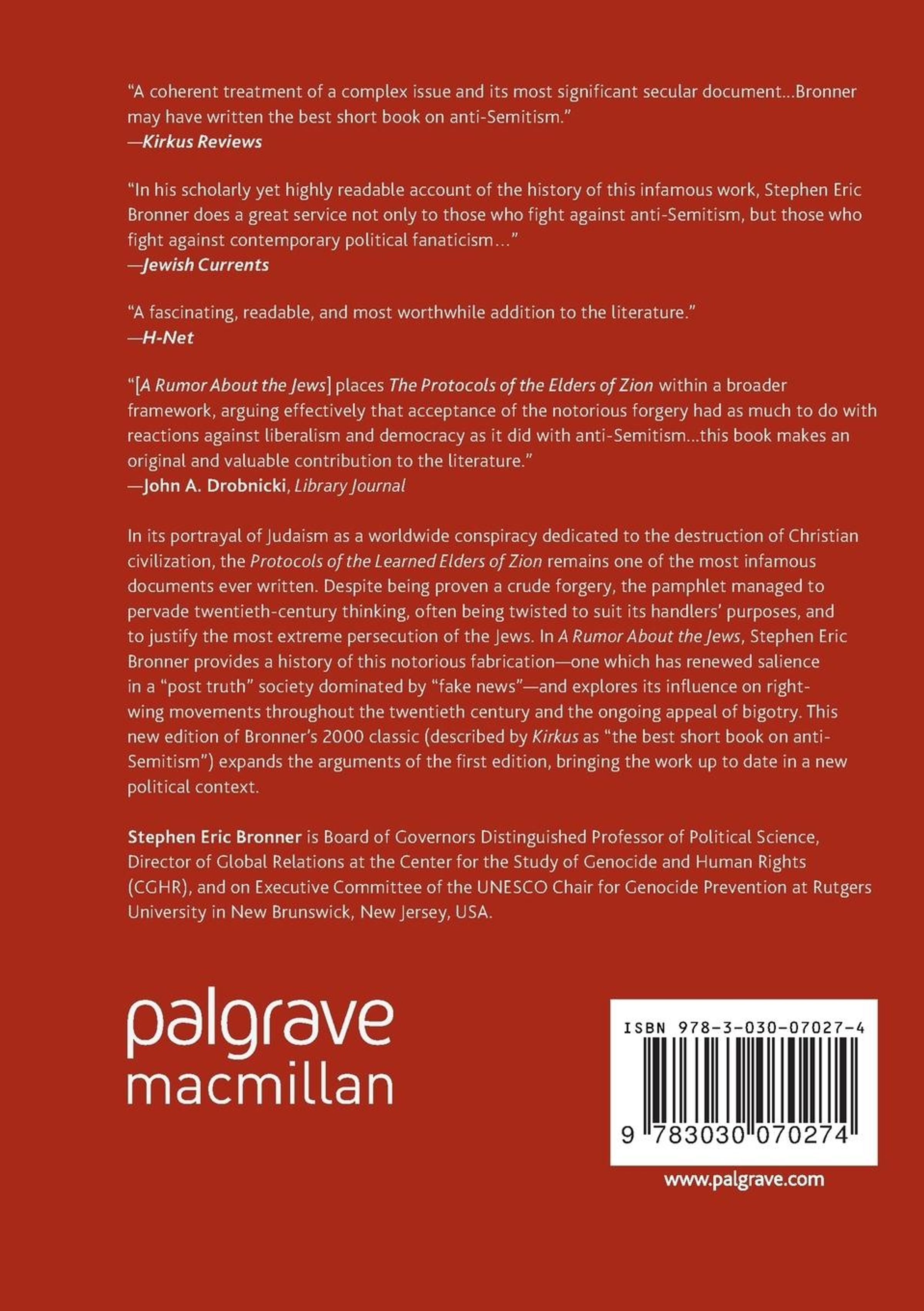 In its portrayal of Judaism as a worldwide conspiracy dedicated to the destruction of Christian civilization, the Protocols of the Learned Elders of Zion remains one of the most infamous documents ever written. Despite being proven a crude forgery, the pamphlet managed to pervade twentieth-century thinking, often being twisted to suit its handlers' purposes, and to justify the most extreme persecution of the Jews. In A Rumor About the Jews, Stephen Eric Bronner provides a history of this notorious fabrication-one which has renewed salience in a "post truth" society dominated by "fake news"-and explores its influence on right-wing movements throughout the twentieth century and the ongoing appeal of bigotry. This new edition of Bronner's 2000 classic (described by Kirkus as "the best short book on anti-Semitism") expands the arguments of the first edition, bringing the work up to date in a new political context.