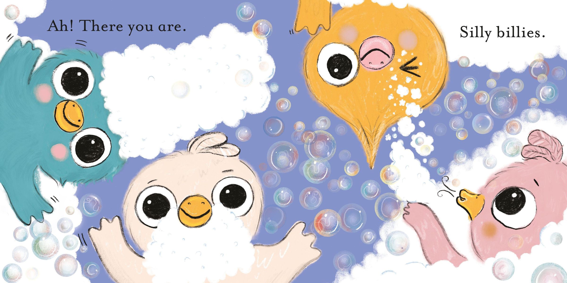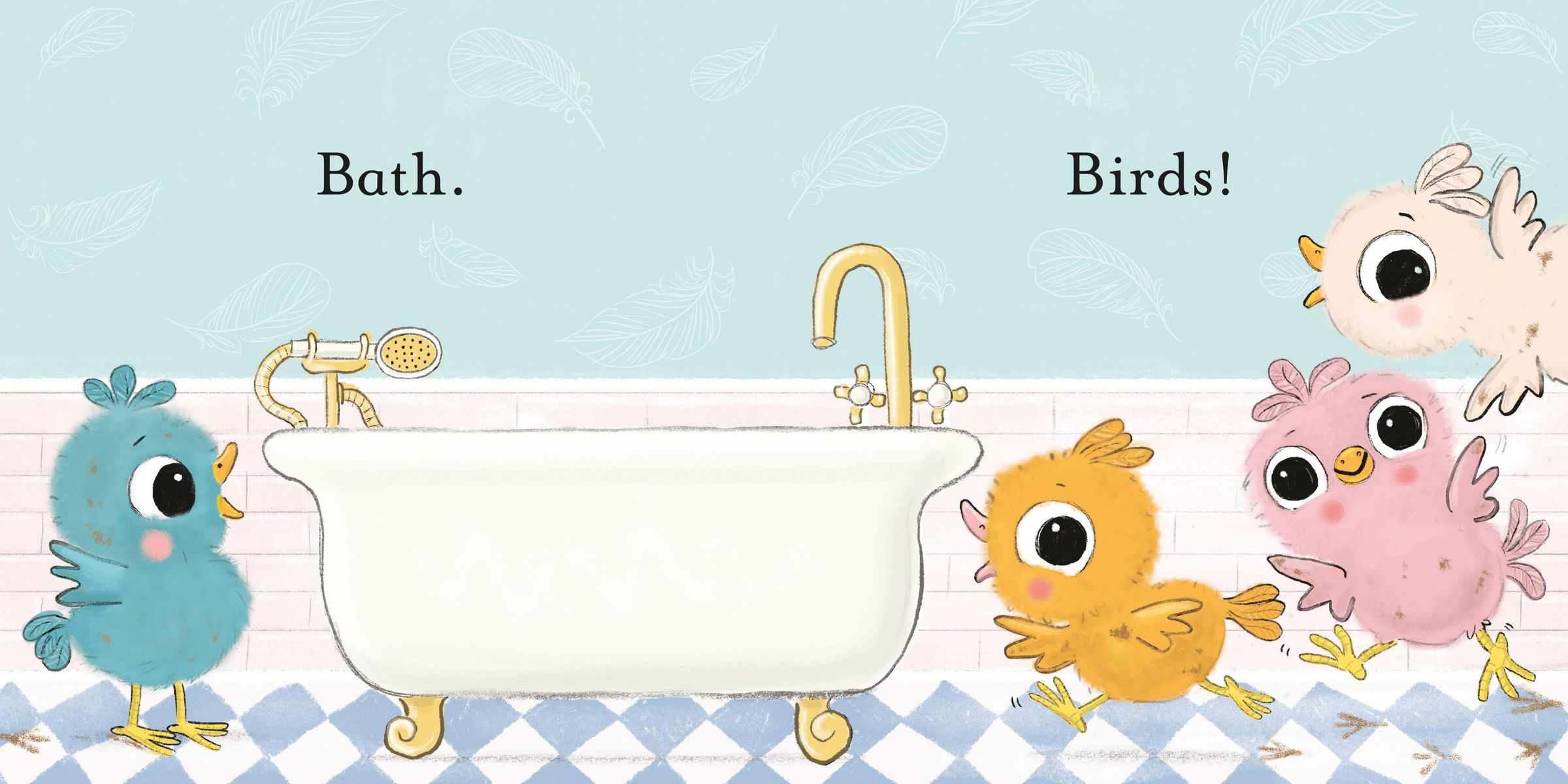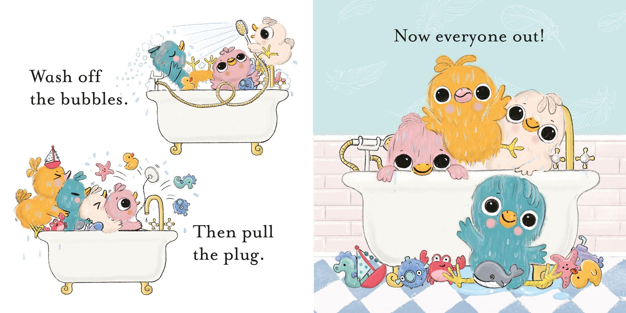 Meet four mucky birds in need of a good bath. They've got soap, shampoo and a big bottle of bubble bath, but can they be trusted not to use it all? And will they keep the water inside the tub? No, probably not, but at least they'll be squeaky clean!