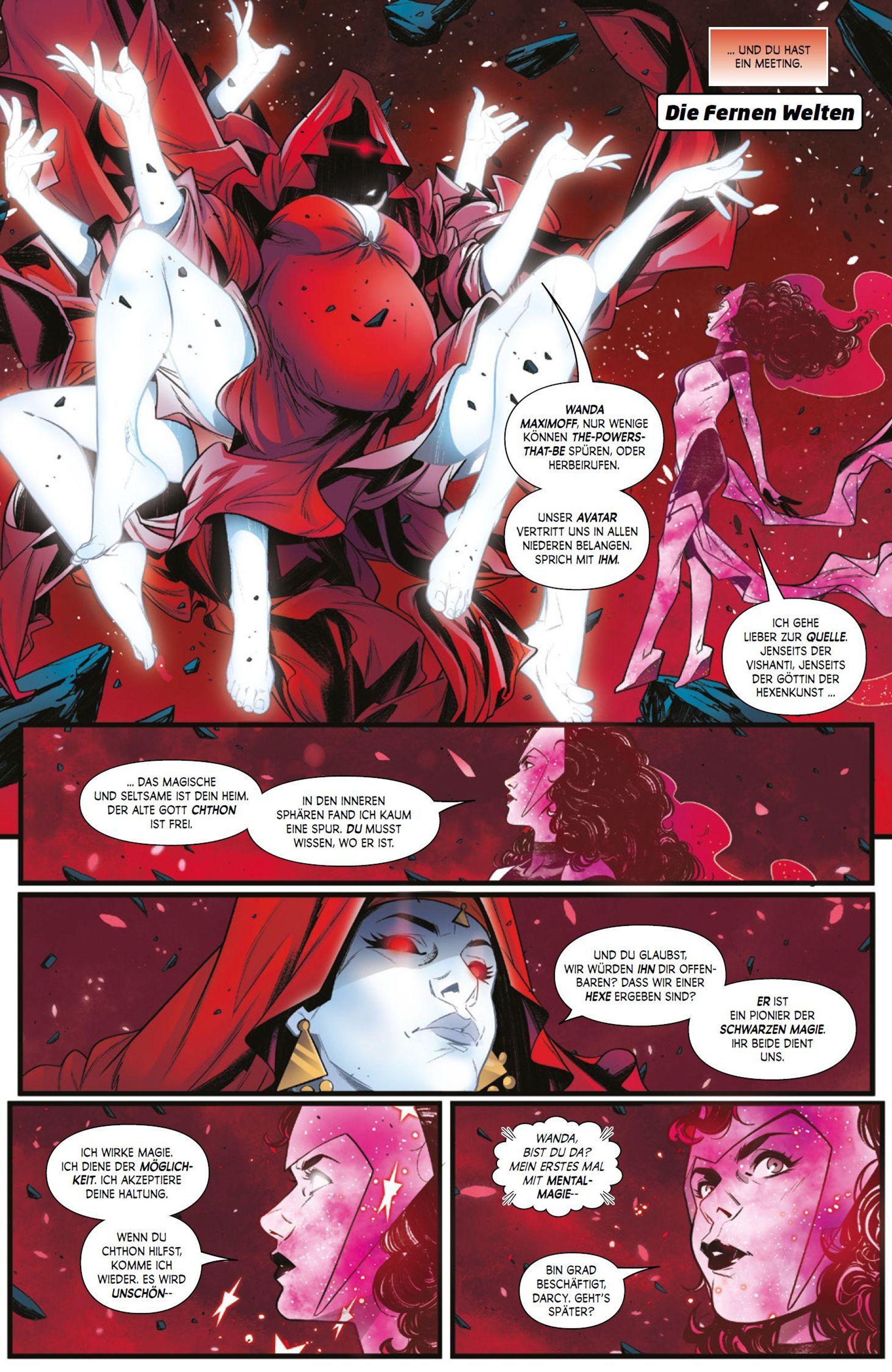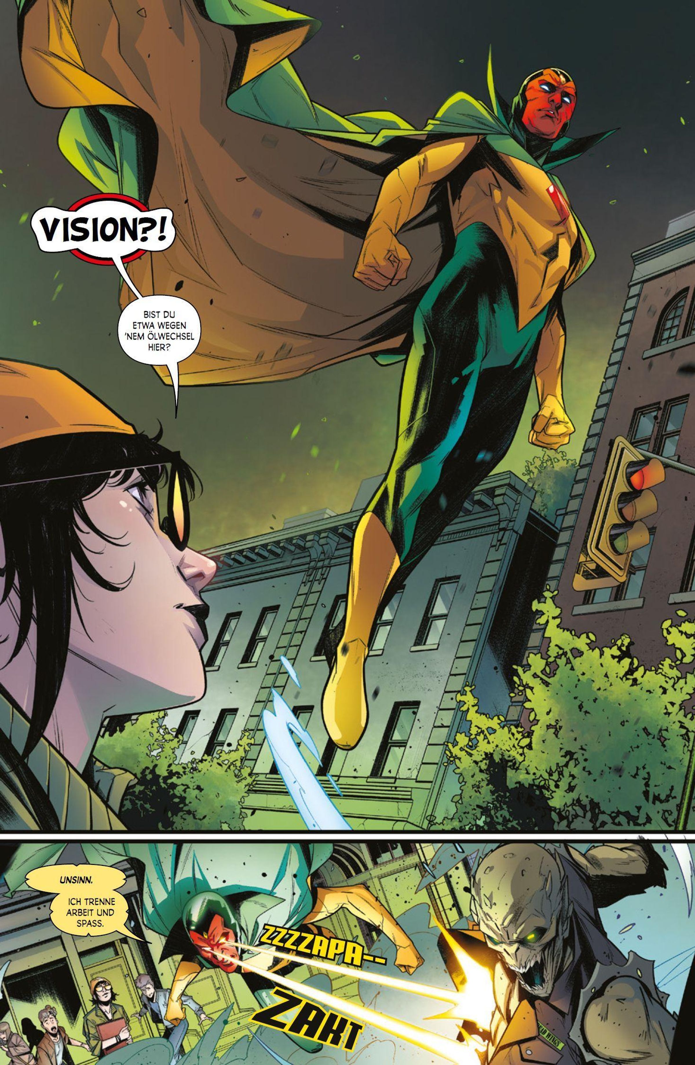 GEMEINSAM IN DEN TOD Auf der ganzen Welt tauchen mysteriöse Türen auf, die Passanten mit wundersamen Versprechen anlocken. Allen, die über die Schwelle treten, soll ein Wiedersehen mit ihren verstorbenen Liebsten winken. Aber niemand kehrte je aus dem Inneren zurück. Als Vision dem Phänomen auf den Grund geht, trifft er auf einen alten Gegner, der ihn mit dem Tod konfrontiert. Um das Leben ihres Ex-Gatten zu retten, muss Wanda sämtliche Register ziehen. Doch ihre Hilfe hat unerwartete Folgen.