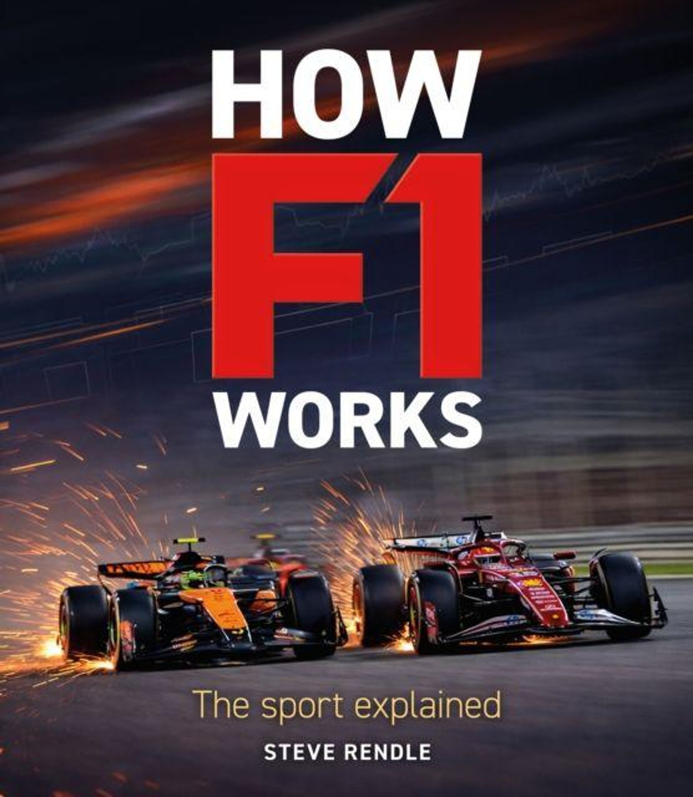 "HOW F1 WORKS" steht groß über zwei Rennwagen im Drift, unter Funkenflug. Darunter: "The sport explained" und "Steve Rendle"., Buch