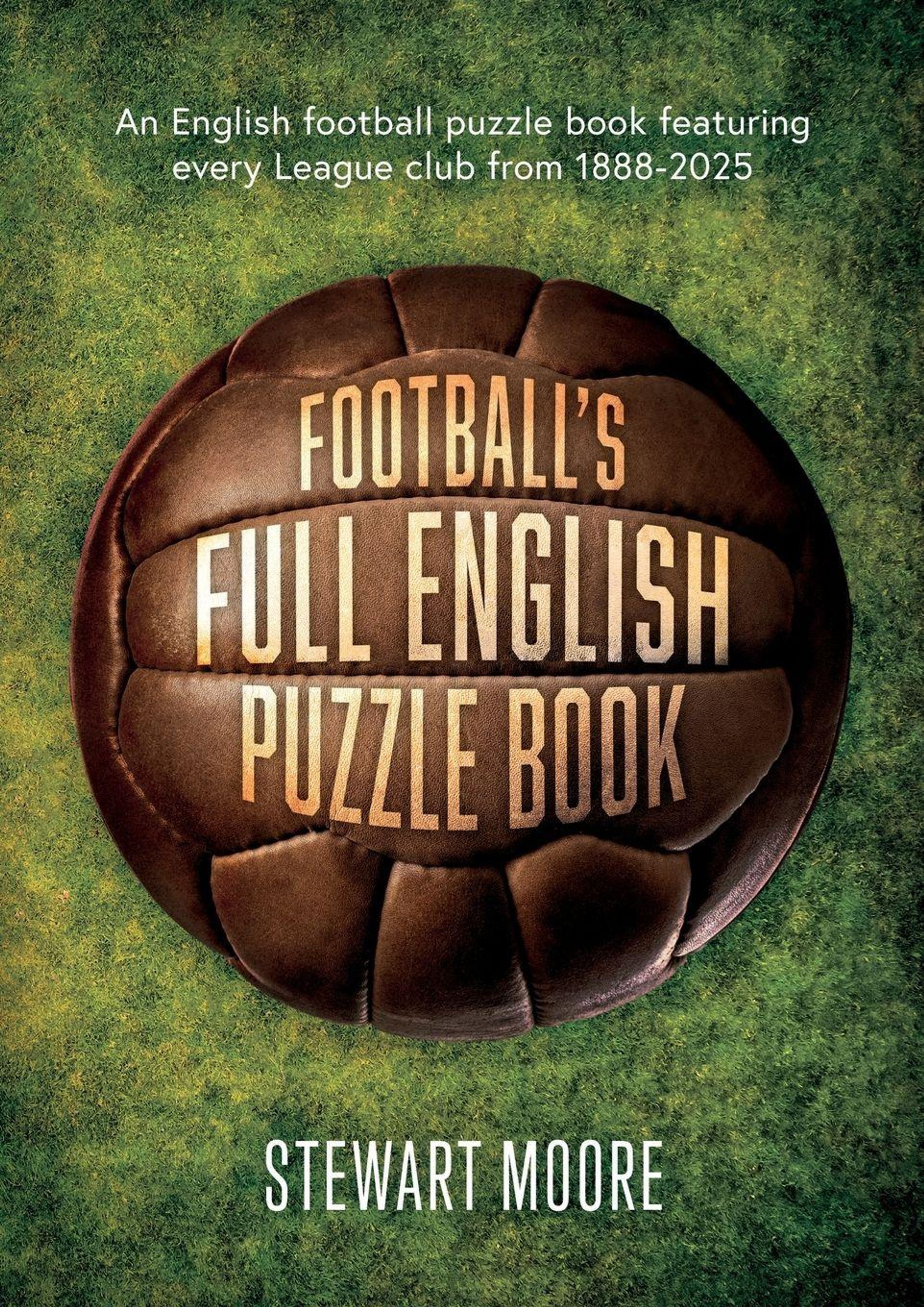 Text oben: "An English football puzzle book featuring every League club from 1888-2025." Fußball im Hintergrund., Buch