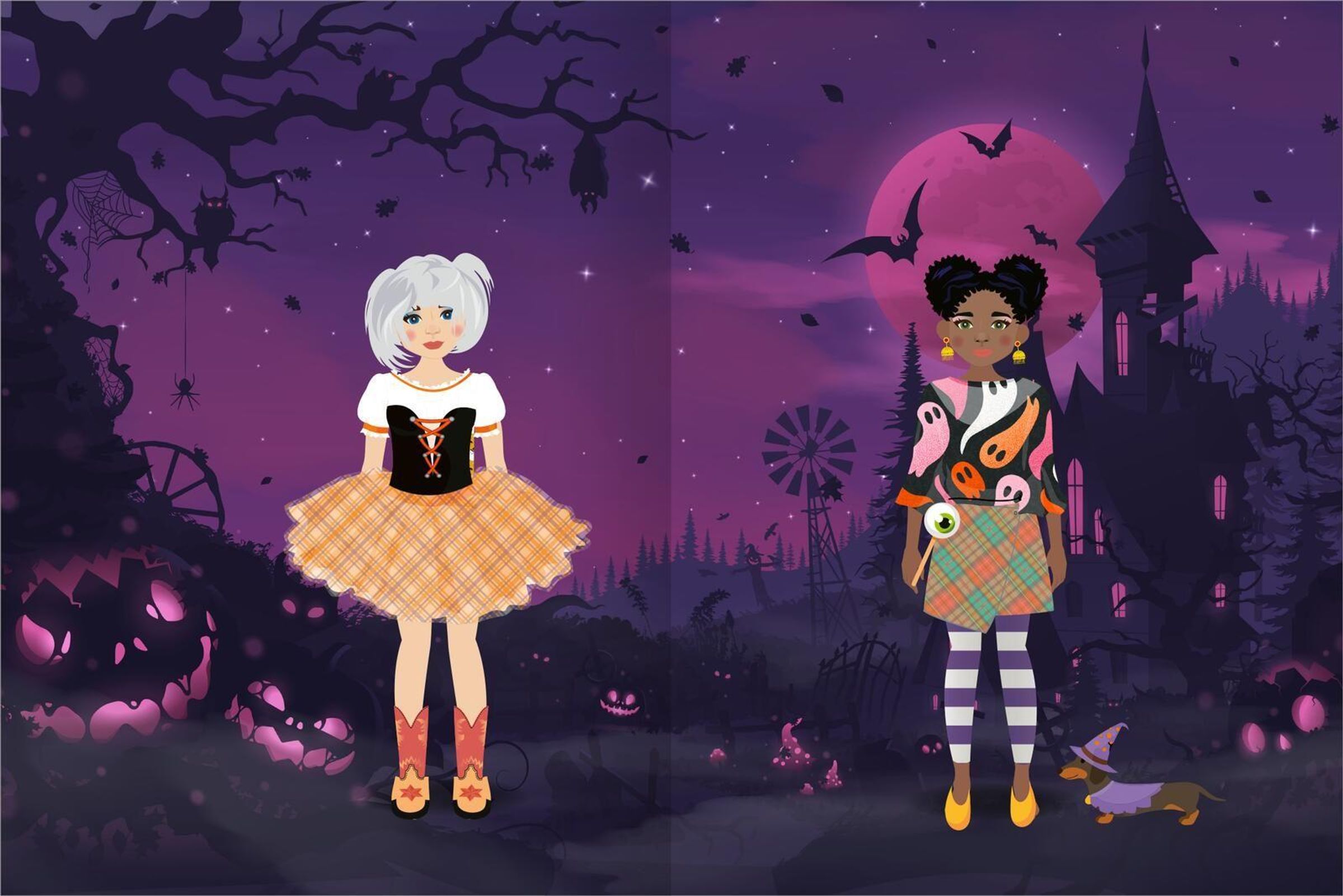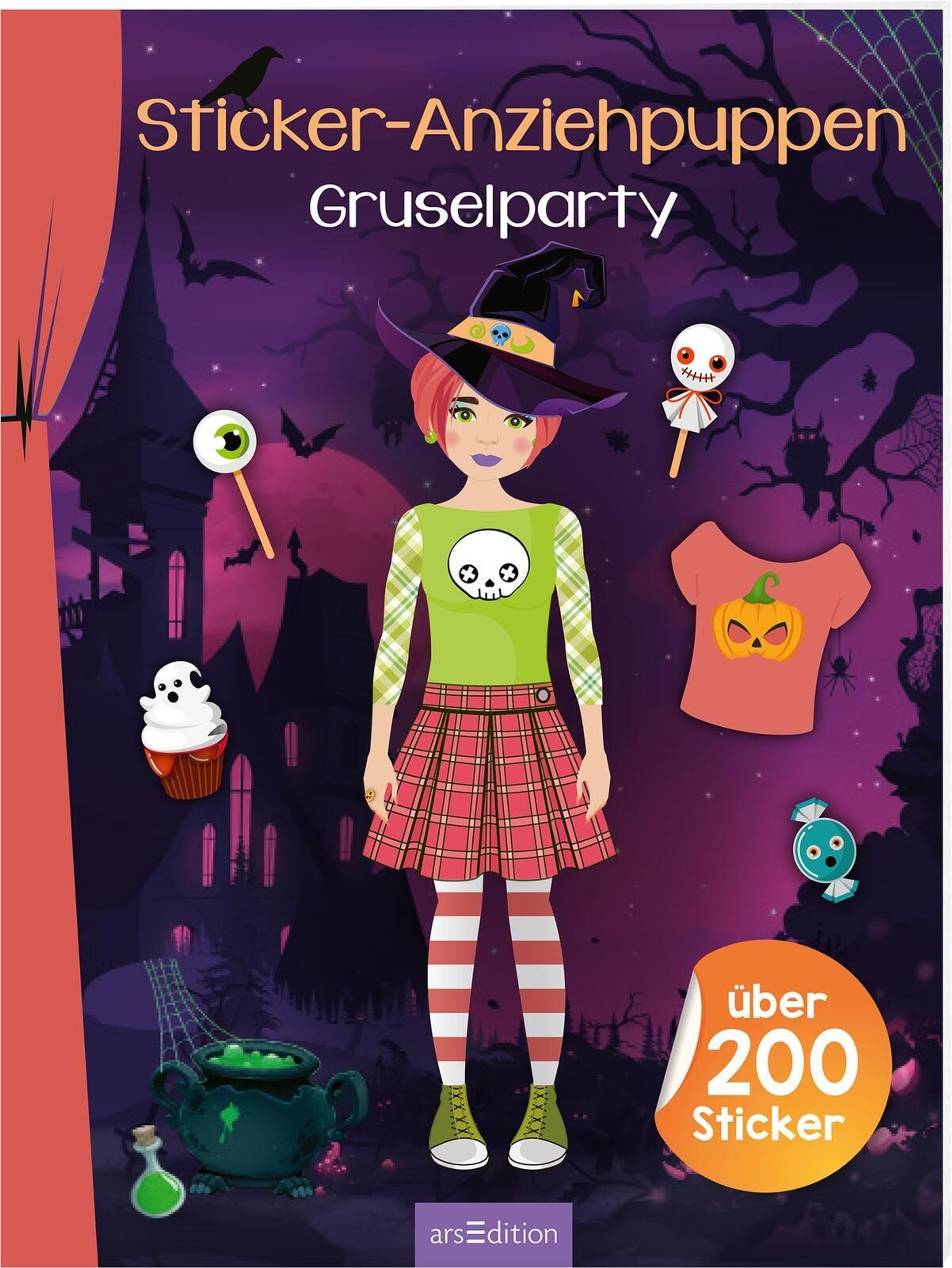 Entwirf traumhafte Styles und verwandle die Anziehpuppen in Halloweenparty-Gäste. Ob auf dem Dachboden oder im Gruselschloss: Mit vielen kunterbunten Kleiderstickern und Accessoires kannst du die Kinder in Szene setzen und ihnen zu einem funkelnden Auftritt verhelfen.