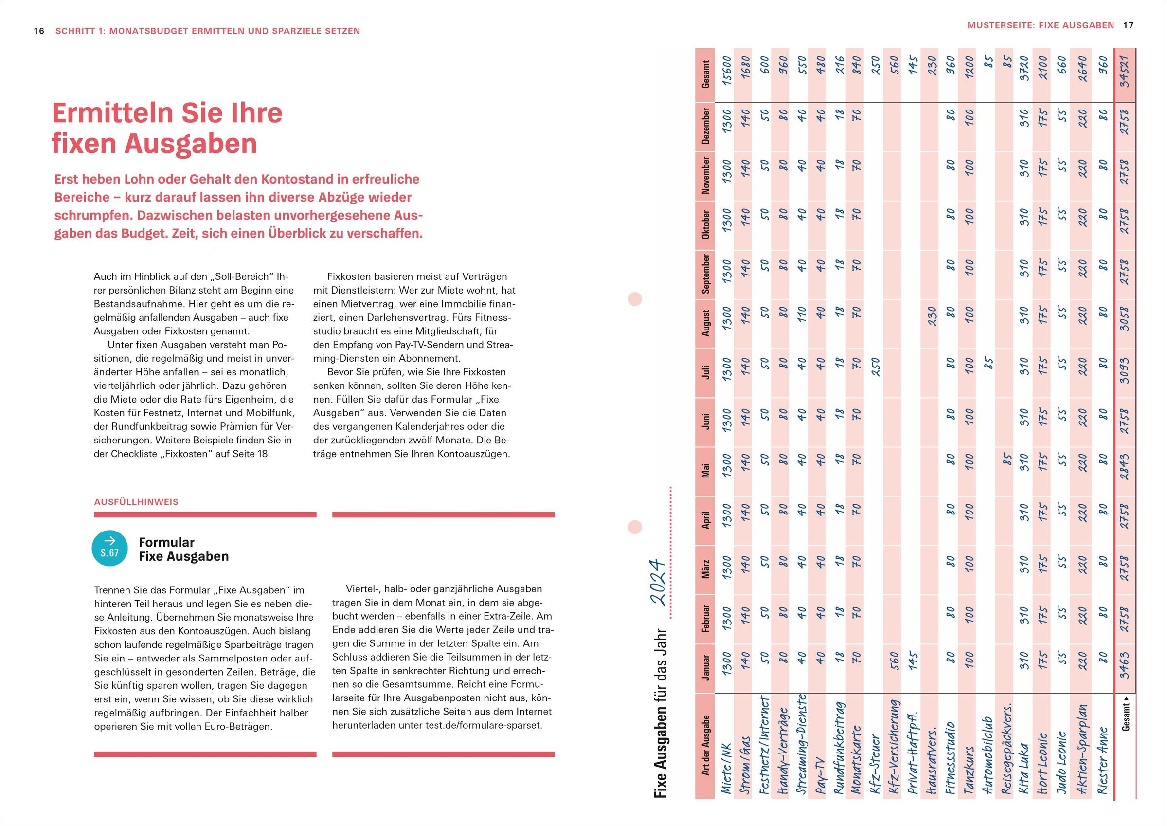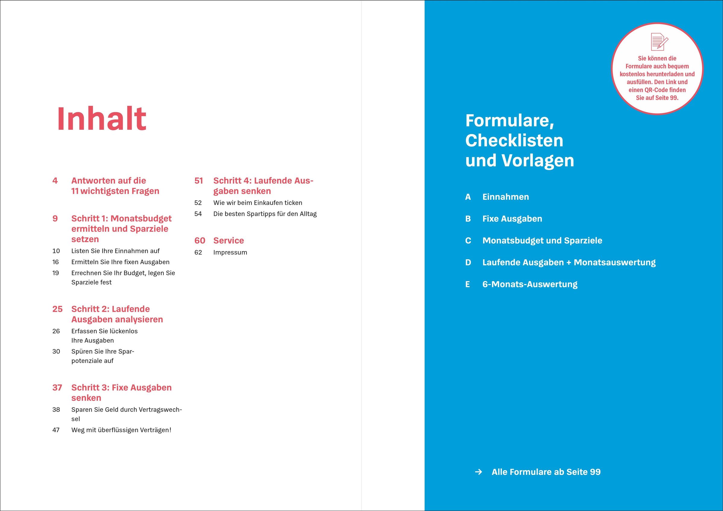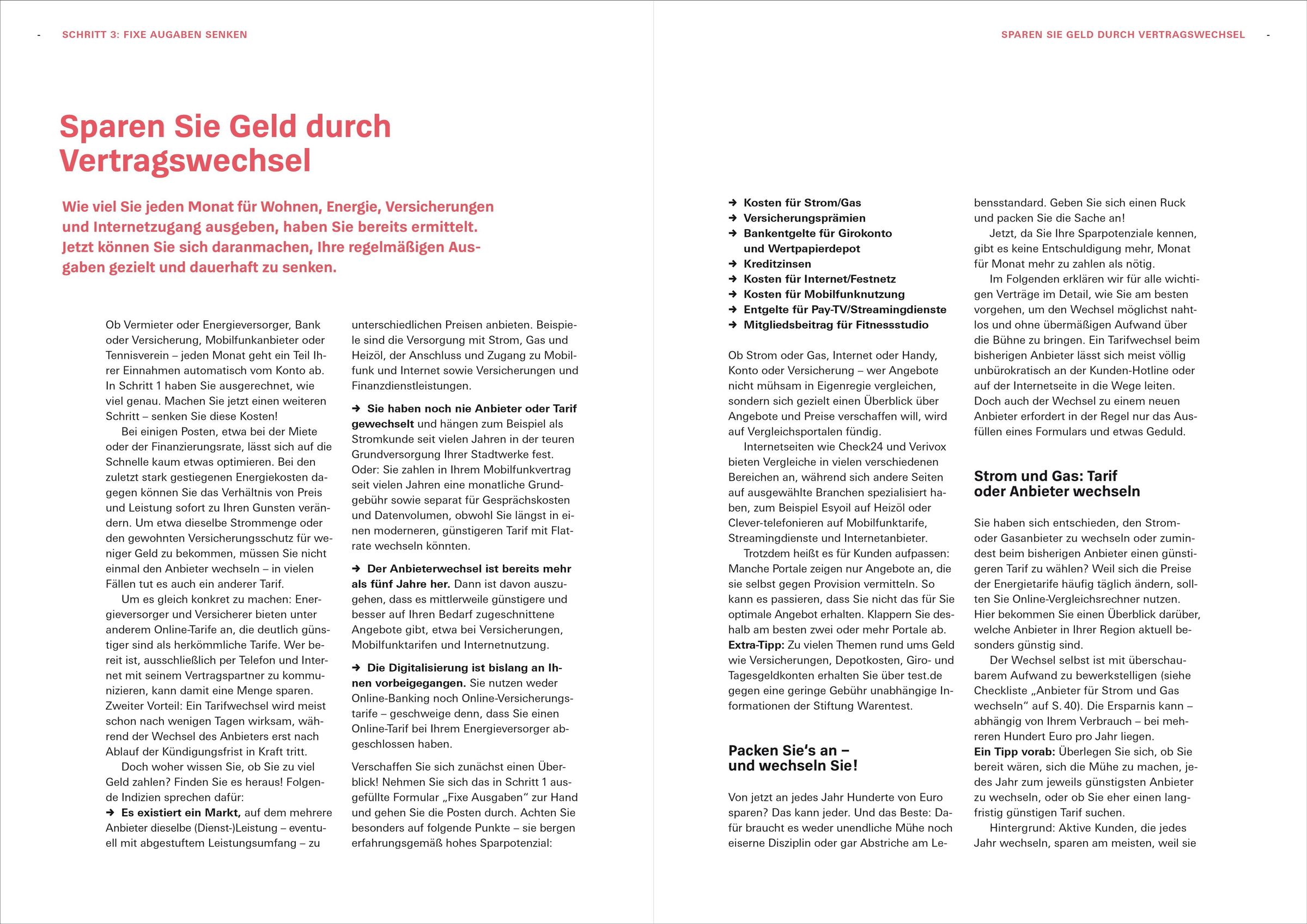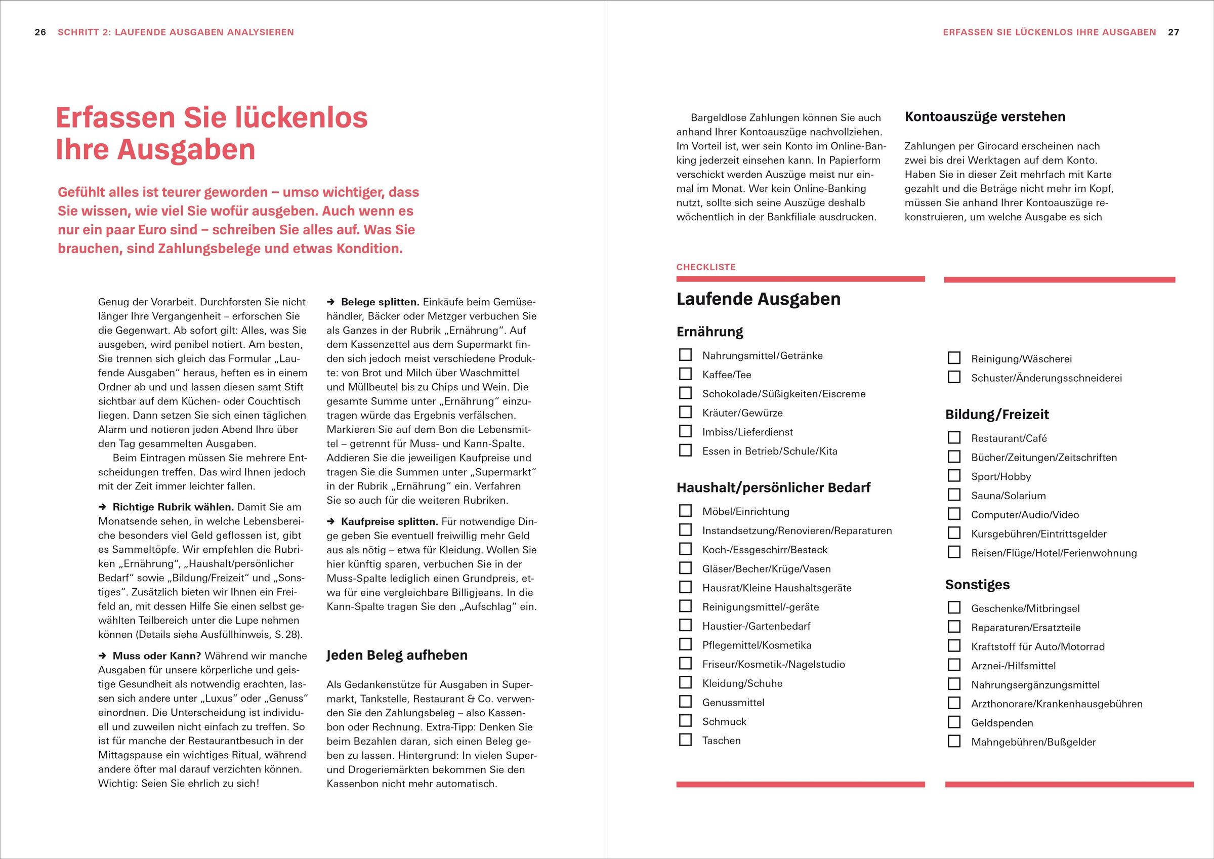 Das Haushaltsbuch führt in vier Schritten durch alle relevanten Bereiche: Sparziele und Monatsbudget setzen, fixe und variable Ausgaben analysieren, konkrete Sparpotenziale erkennen und verlockende Spontan- und Impulskäufe vermeiden.