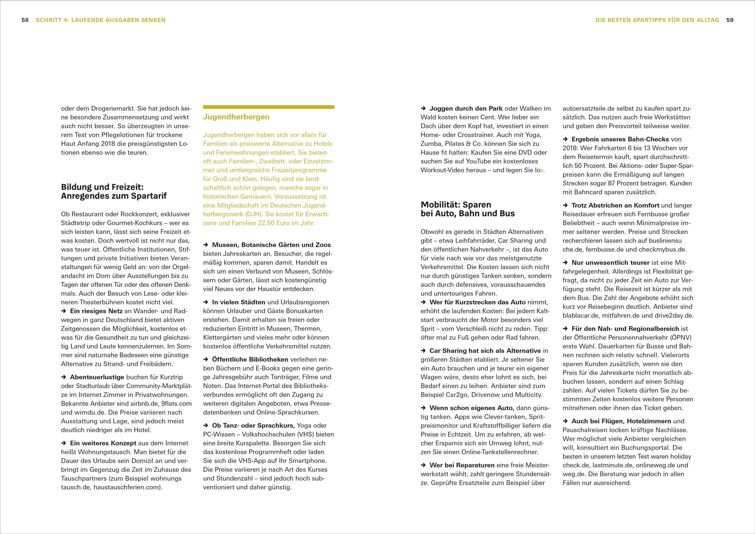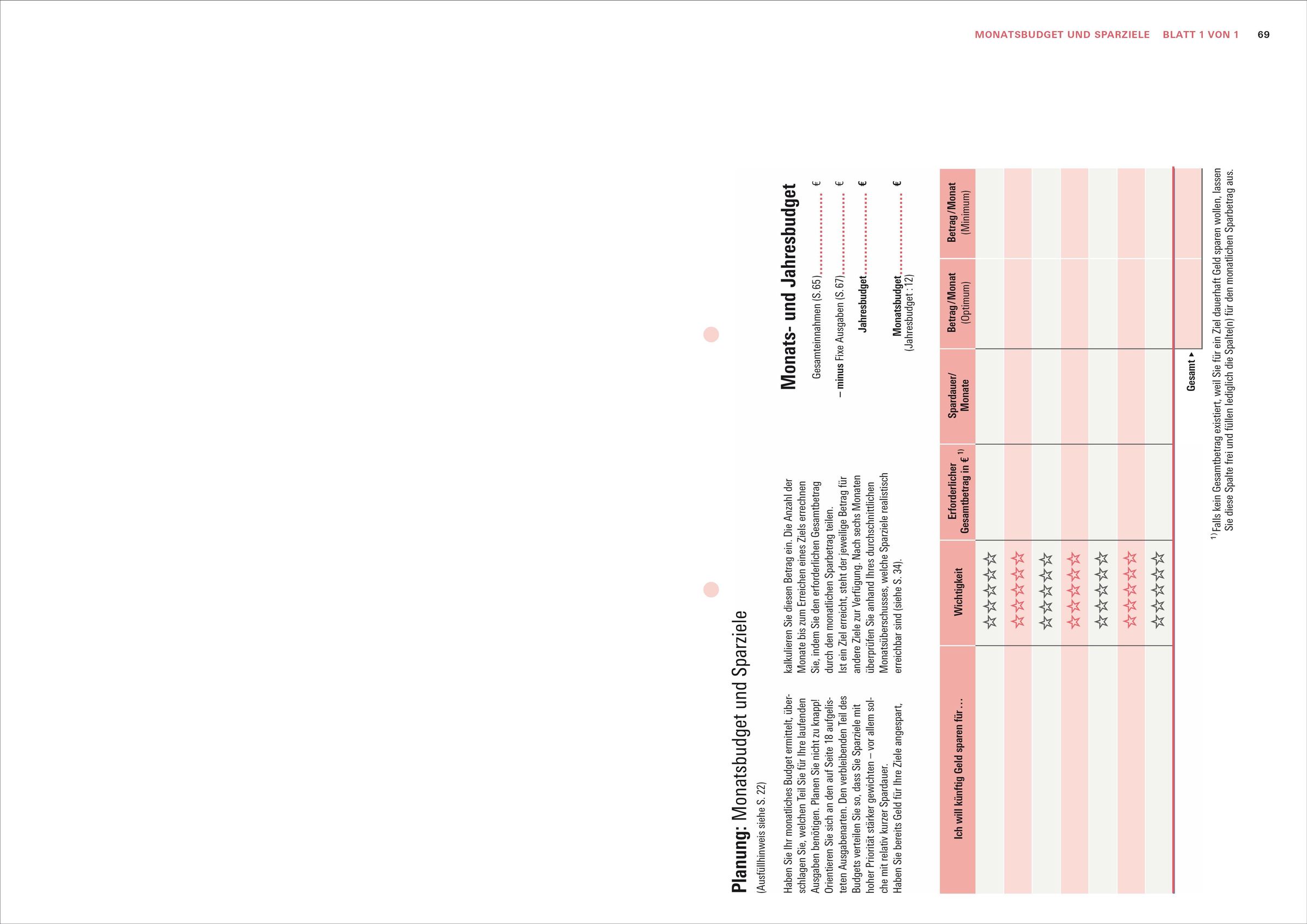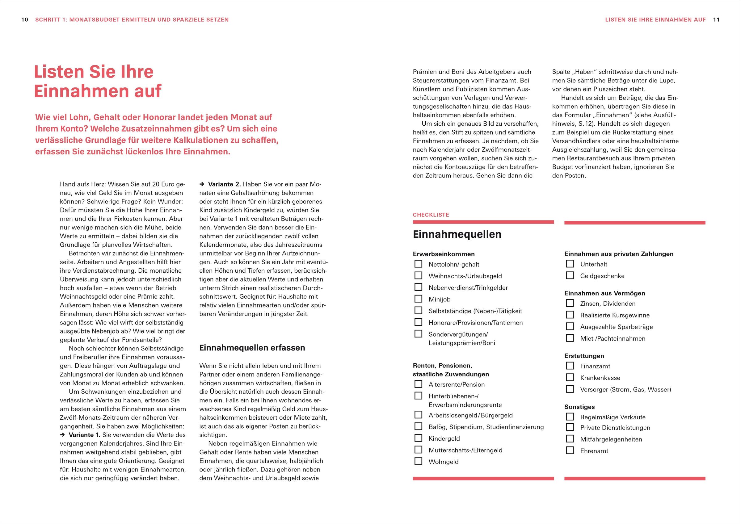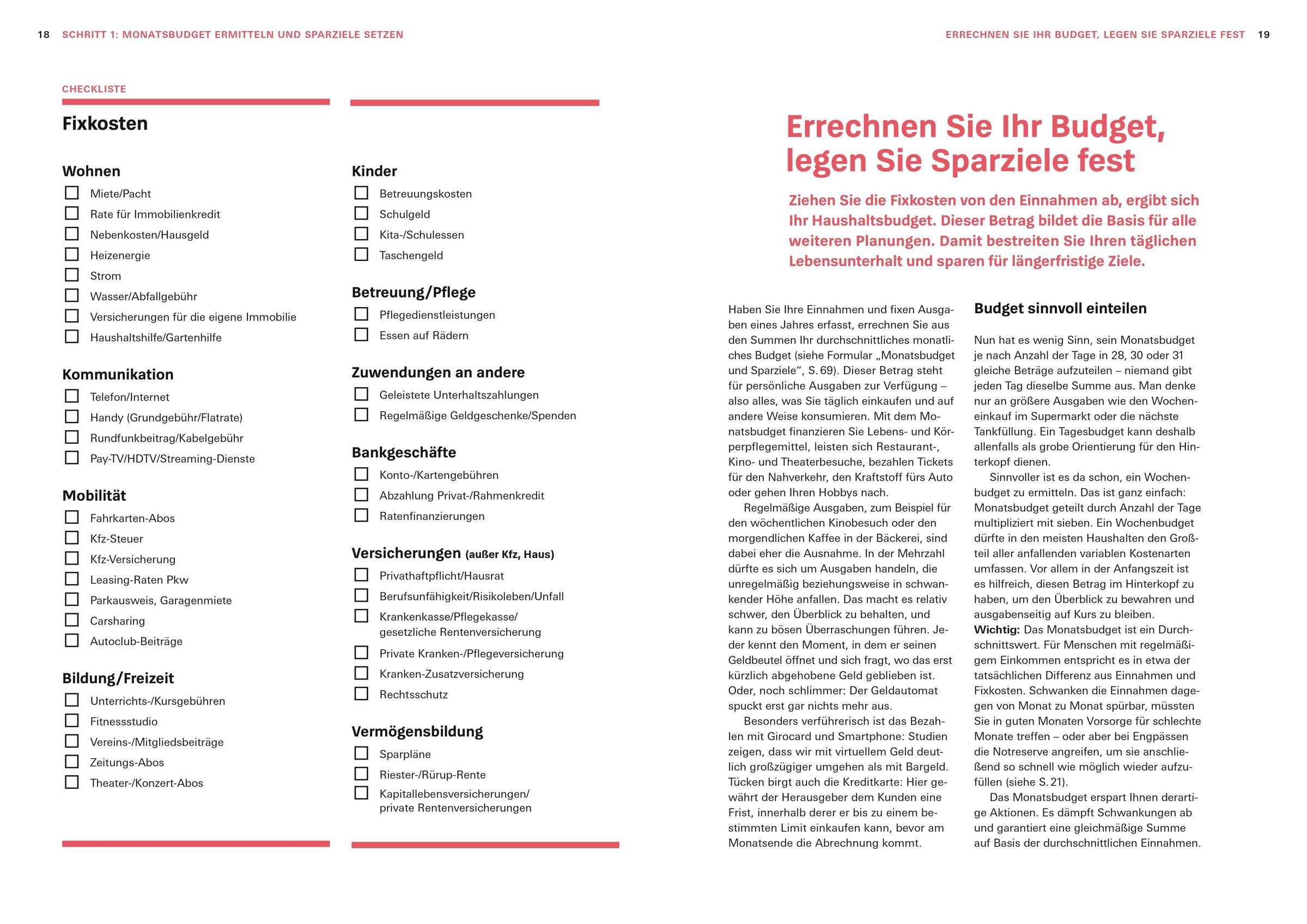 Das Haushaltsbuch führt in vier Schritten durch alle relevanten Bereiche: Sparziele und Monatsbudget setzen, fixe und variable Ausgaben analysieren, konkrete Sparpotenziale erkennen und verlockende Spontan- und Impulskäufe vermeiden.