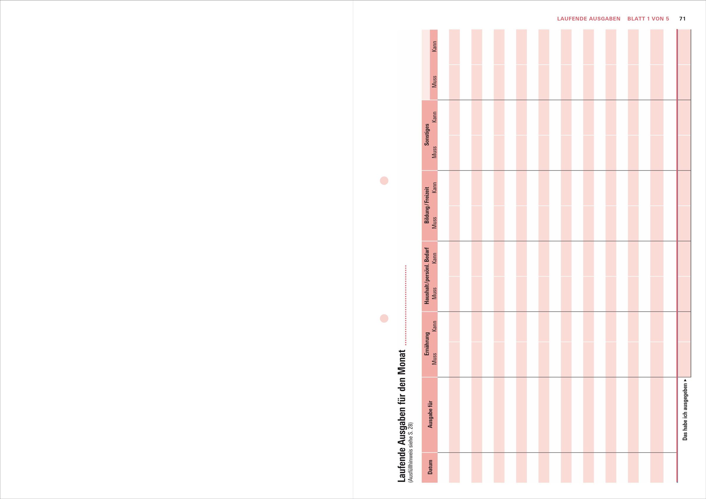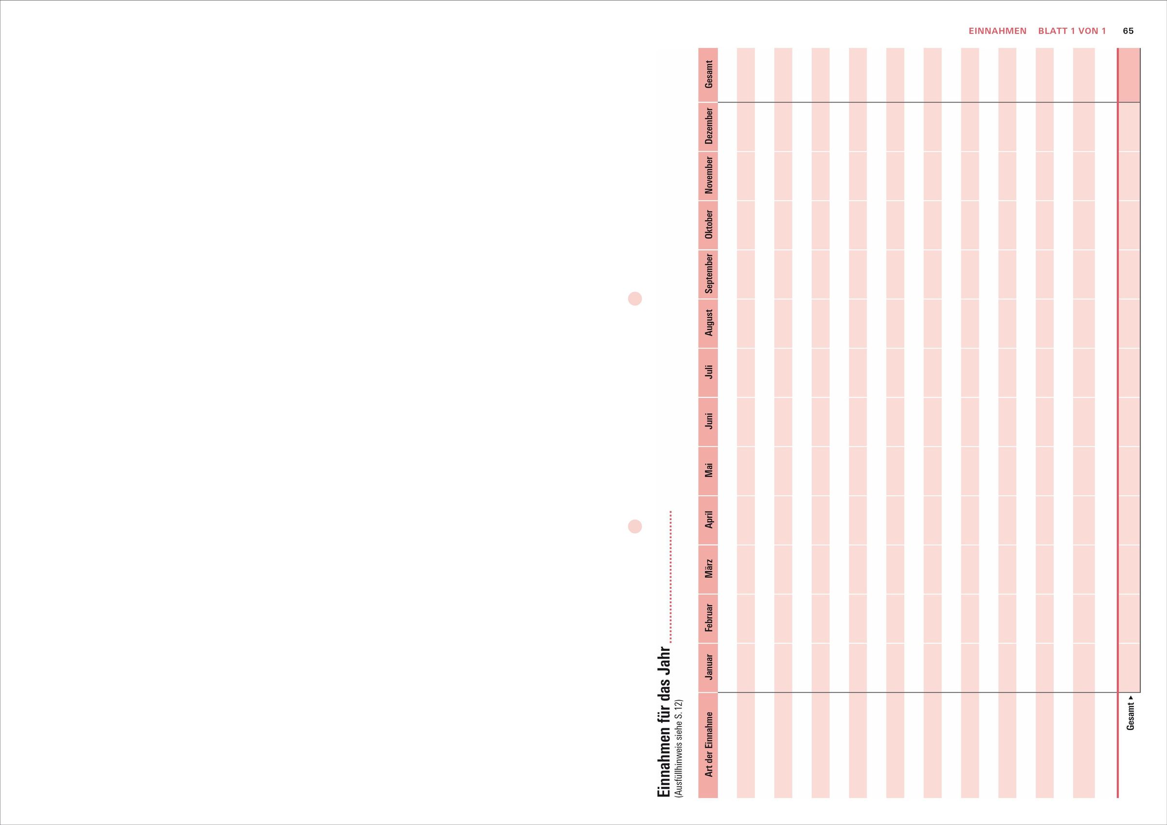 Selbstrechnende Tabellen mit Übersichten für variable Ausgaben sowie für Einnahmen und fixe Kosten. Anschauliche Ausfüllbeispiele erleichtern den Einstieg - und der kann jederzeit beginnen, nicht nur im Januar.