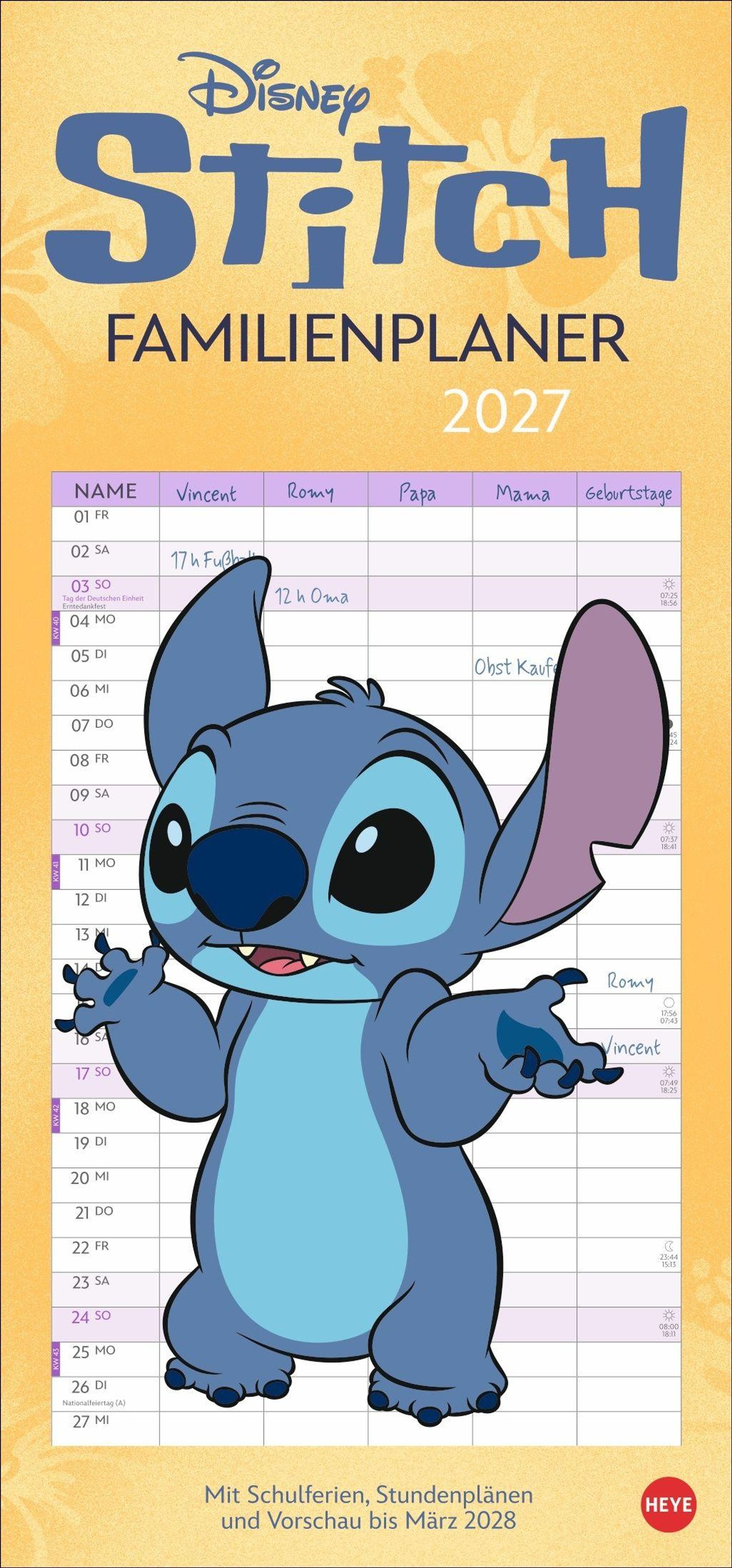 "Disney Stitch Familienplaner 2027. Mit Schulferien, Stundenplänen und Vorschau bis März 2028. Illustration von Stitch.", Kalender