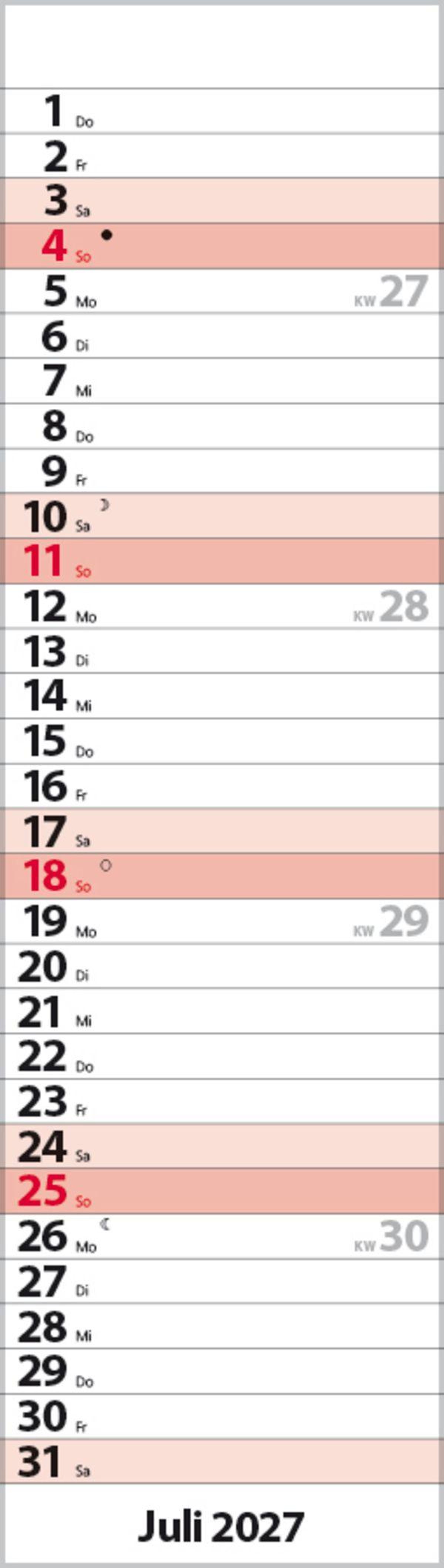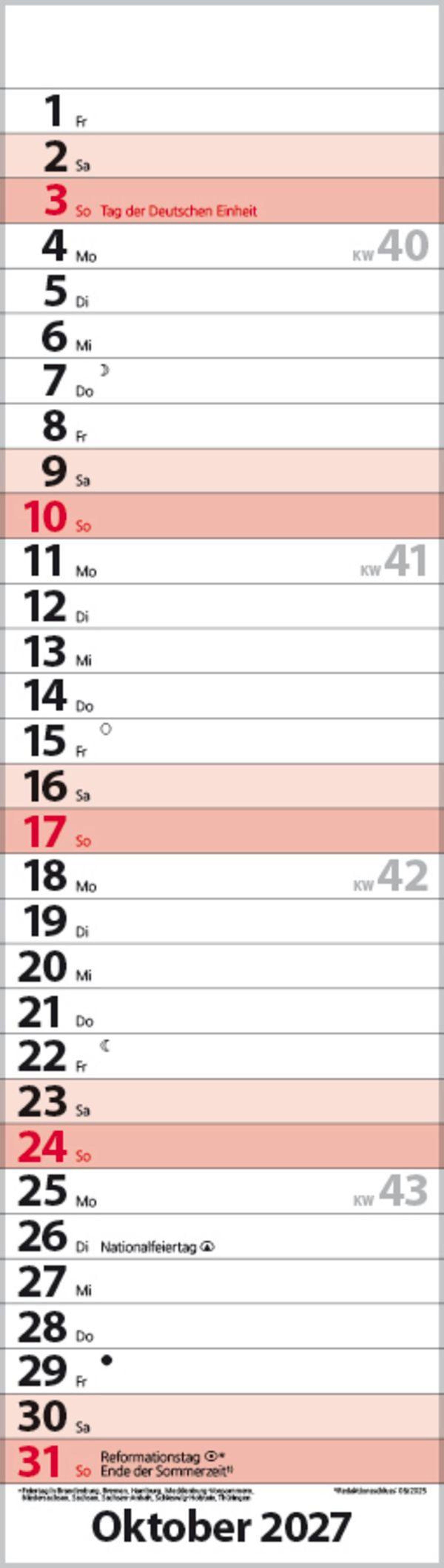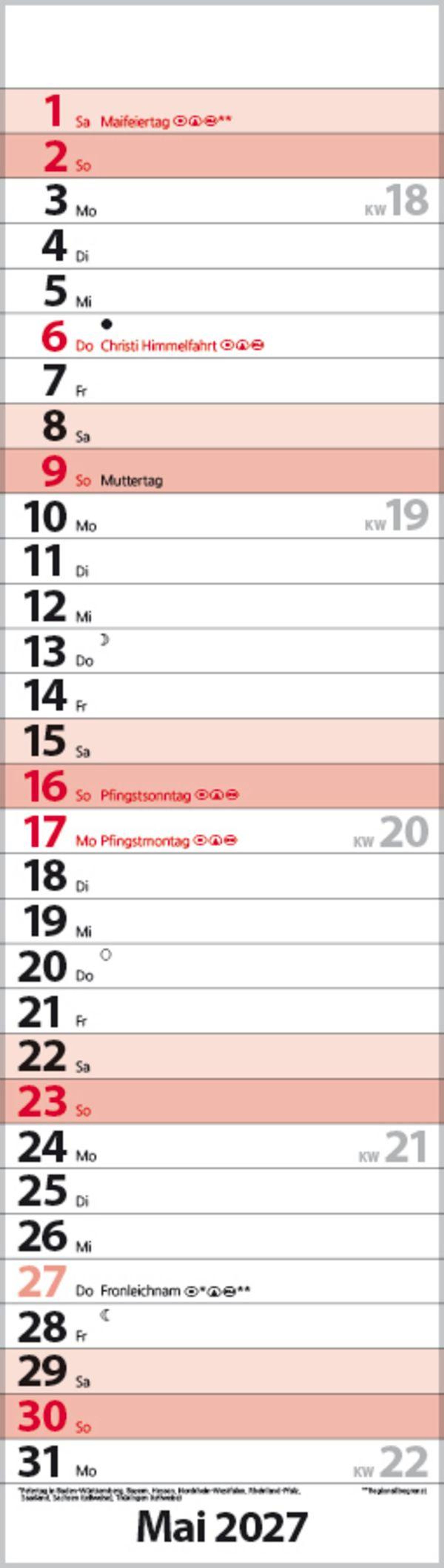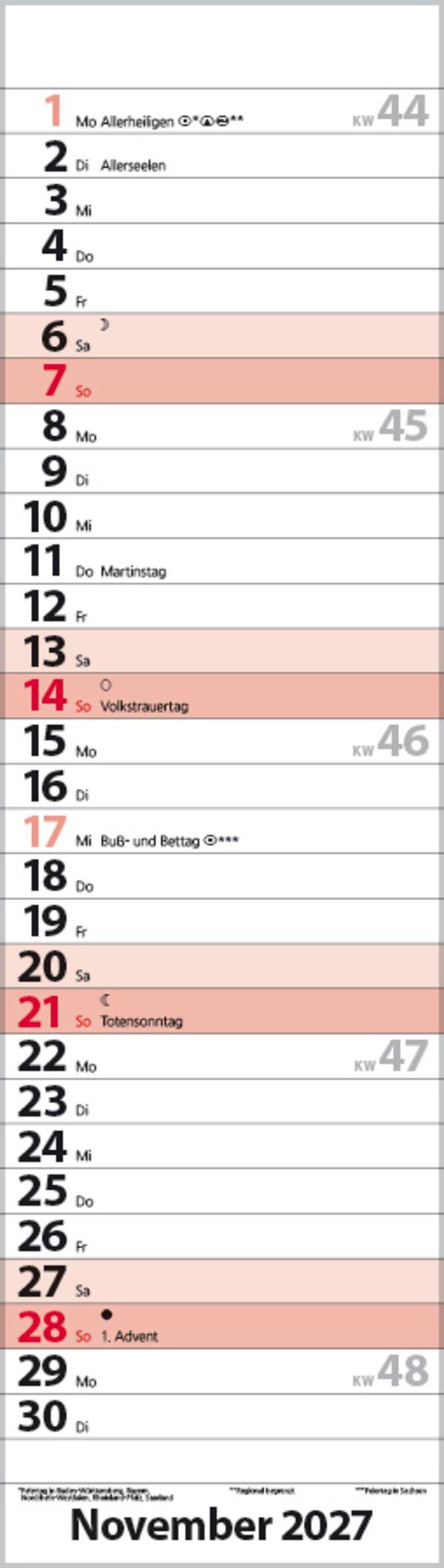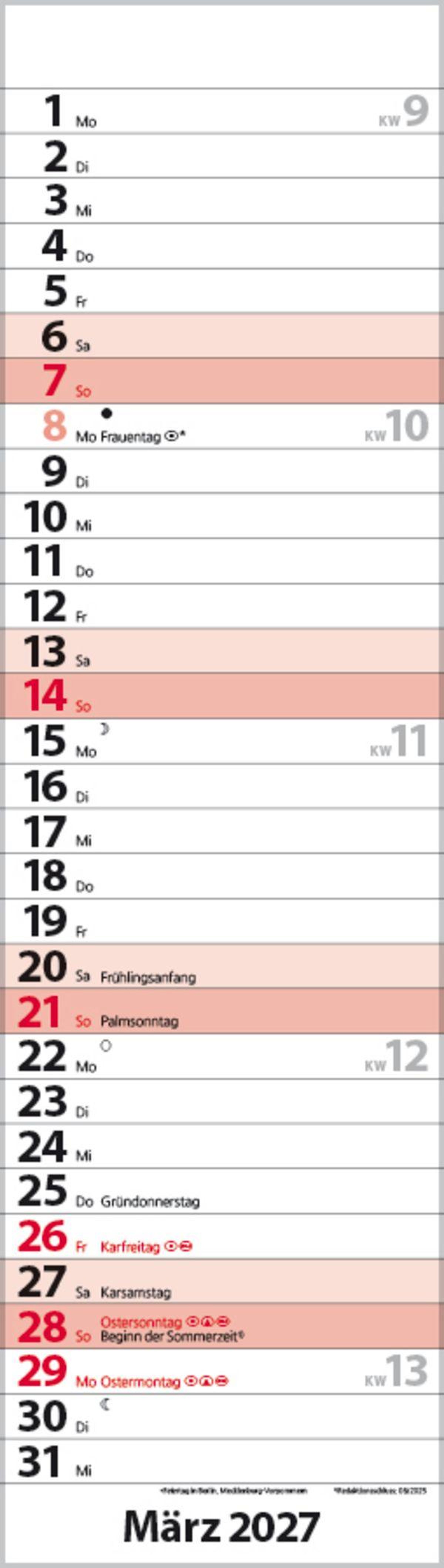 Produktmerkmale Format: 8, 5 x 30 cm; schmaler Wandkalender mit viel Platz für Termine Kalendarium auf Deutsch mit hervorgehobenen Sonn- und Feiertagen für D, A und CH Gedruckt auf umweltfreundlichem FSC Papier