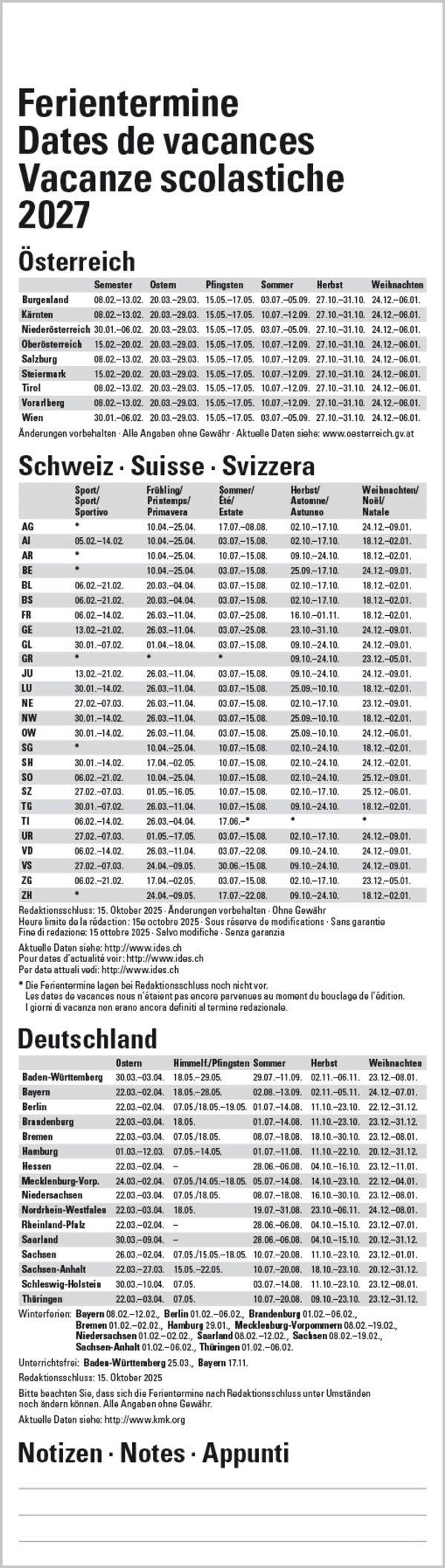 Attraktiver Streifenplaner in kleinen Format mit Spiralbindung, Feiertagen für D/A/CH und Sonn- und Feiertage in Rot. Kalendarium in deutscher Sprache.