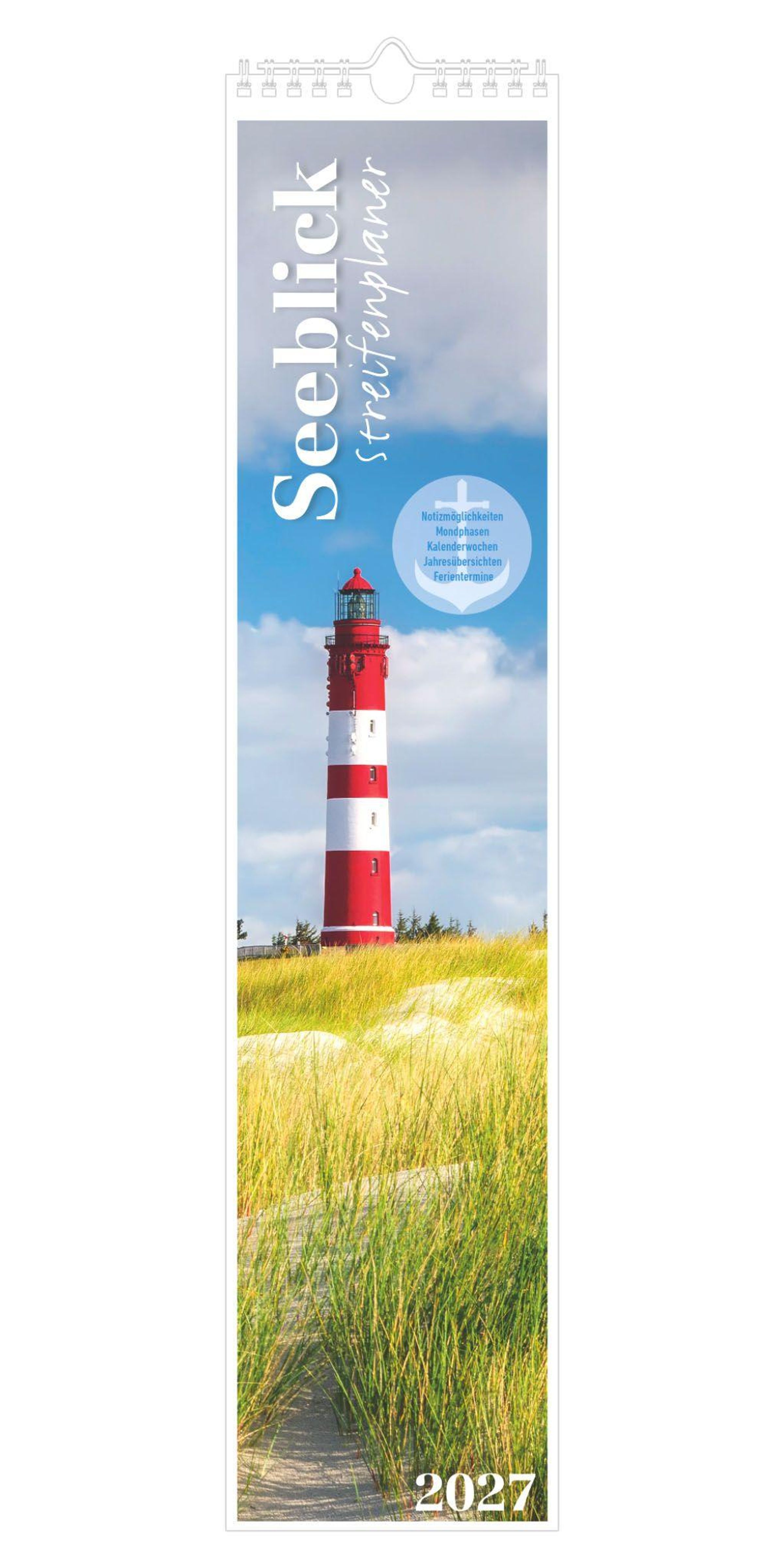 "Seeblick Streifenplaner" steht oben. Ein rot-weißer Leuchtturm steht hinter grünen Dünen, unten ist "2027" zu sehen., Kalender