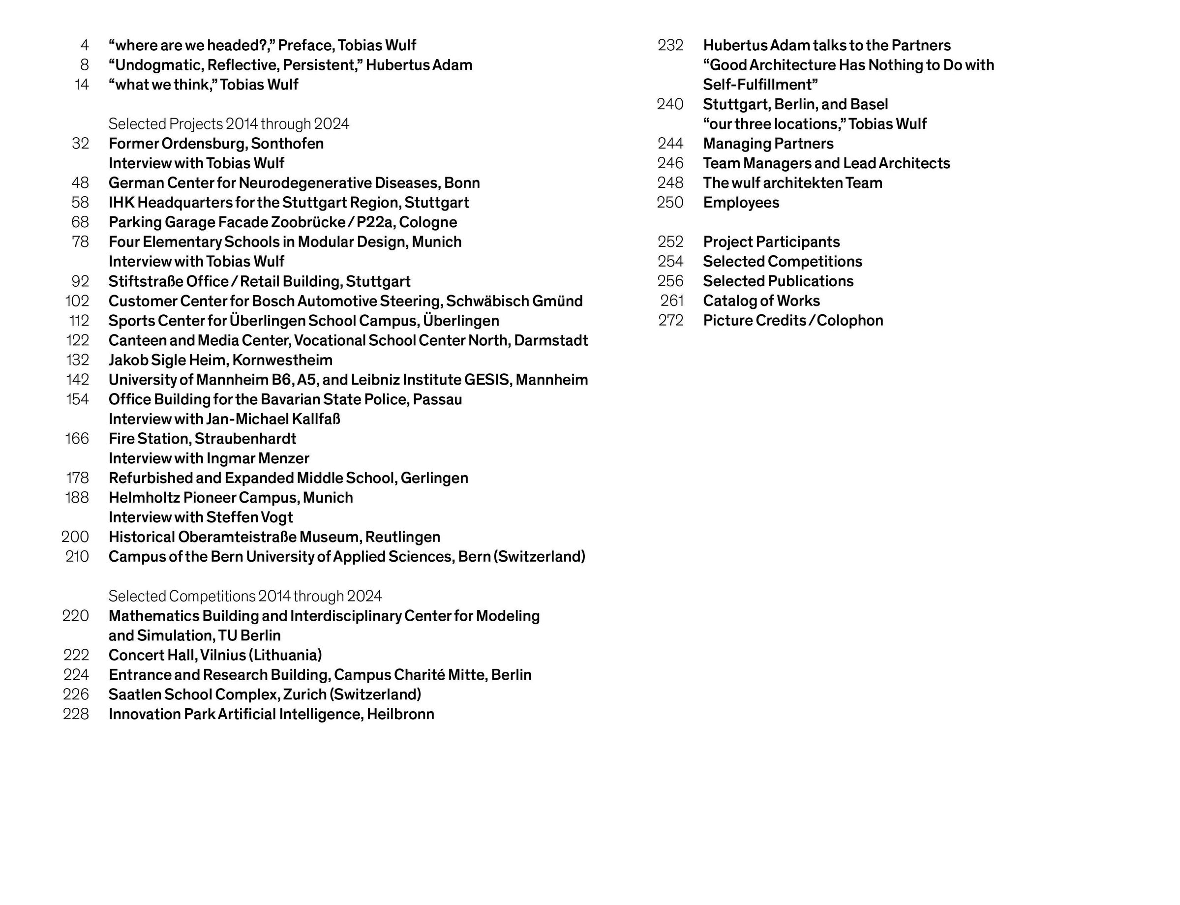 Form, Raum und Konstruktion sind als Dreiklang untrennbar miteinander verbunden. Für das in Stuttgart, Berlin und Basel ansässige Architekturbüro wulf architekten spielt insbesondere der kreative Impuls eine besondere Rolle. Er ermöglicht es, Tragwerke raumprägend zu interpretieren und eine atmosphärische Wirkung der Architektur zu entfalten. Mit dem Begriffspaar Struktur und Typus werden Grundlagen und Ziele dieser Haltung untermauert. Dies zeigt sich an zukunftsweisenden Projekten in den Bereichen Bildung, Forschung, Kultur und Sicherheit. In ihrem neuen Buch stellt das Büro 17 realisierte Bauten vor, die in den Jahren 2014 bis heute fertig gestellt wurden. Dazu diskutiert wulf architekten im Dialog mit dem renommierten Architekturkritiker Hubertus Adam Fragen, die den aktuellen baukulturellen Diskurs bestimmen.