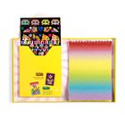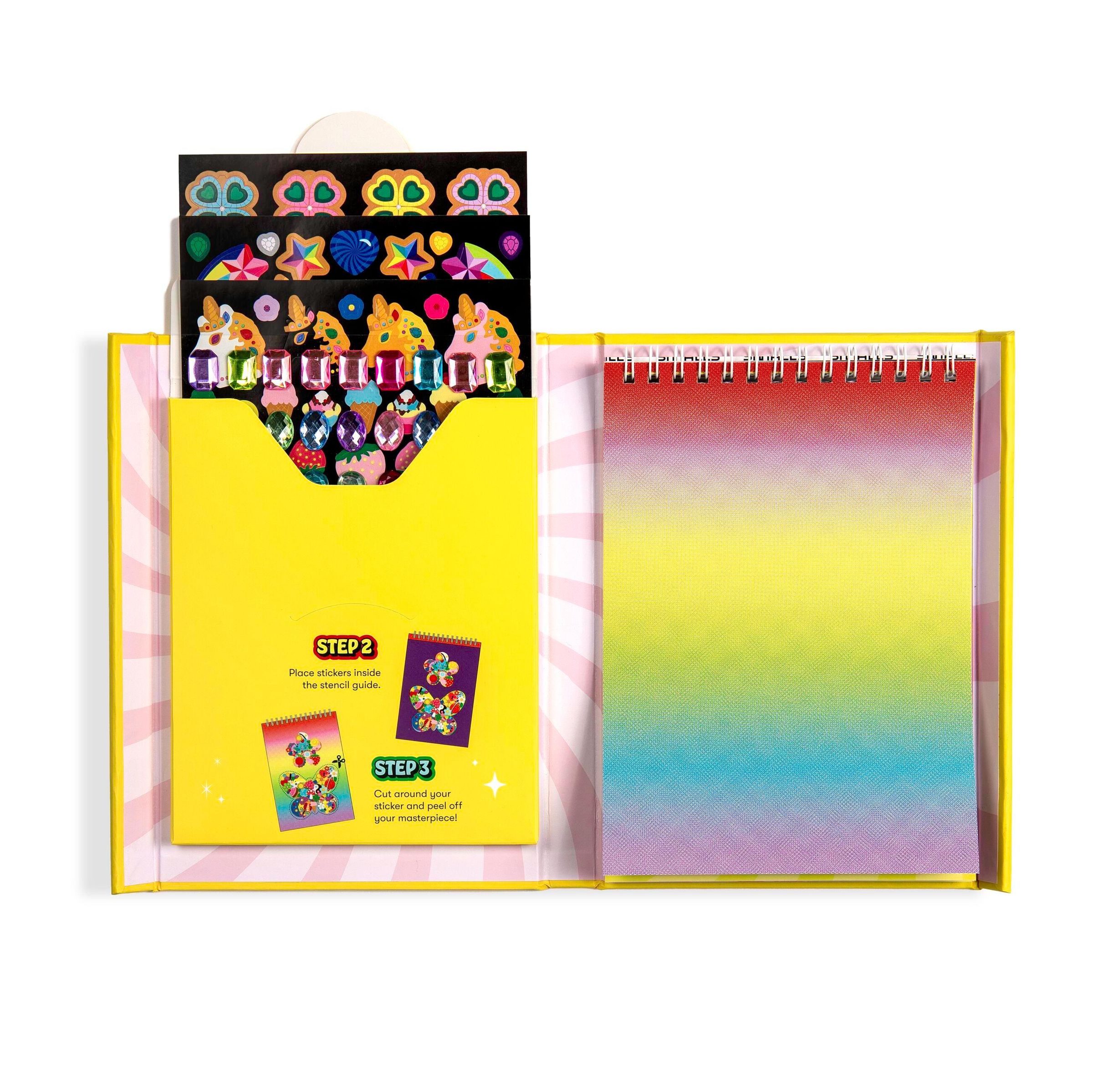 Gelbe Verpackung mit Texten: "SUPER STICKER Creations", "DIY STICKER COLLAGE KIT", "SUPER SMALLS", "200+ STICKERS!", bunte Sticker., Diverse