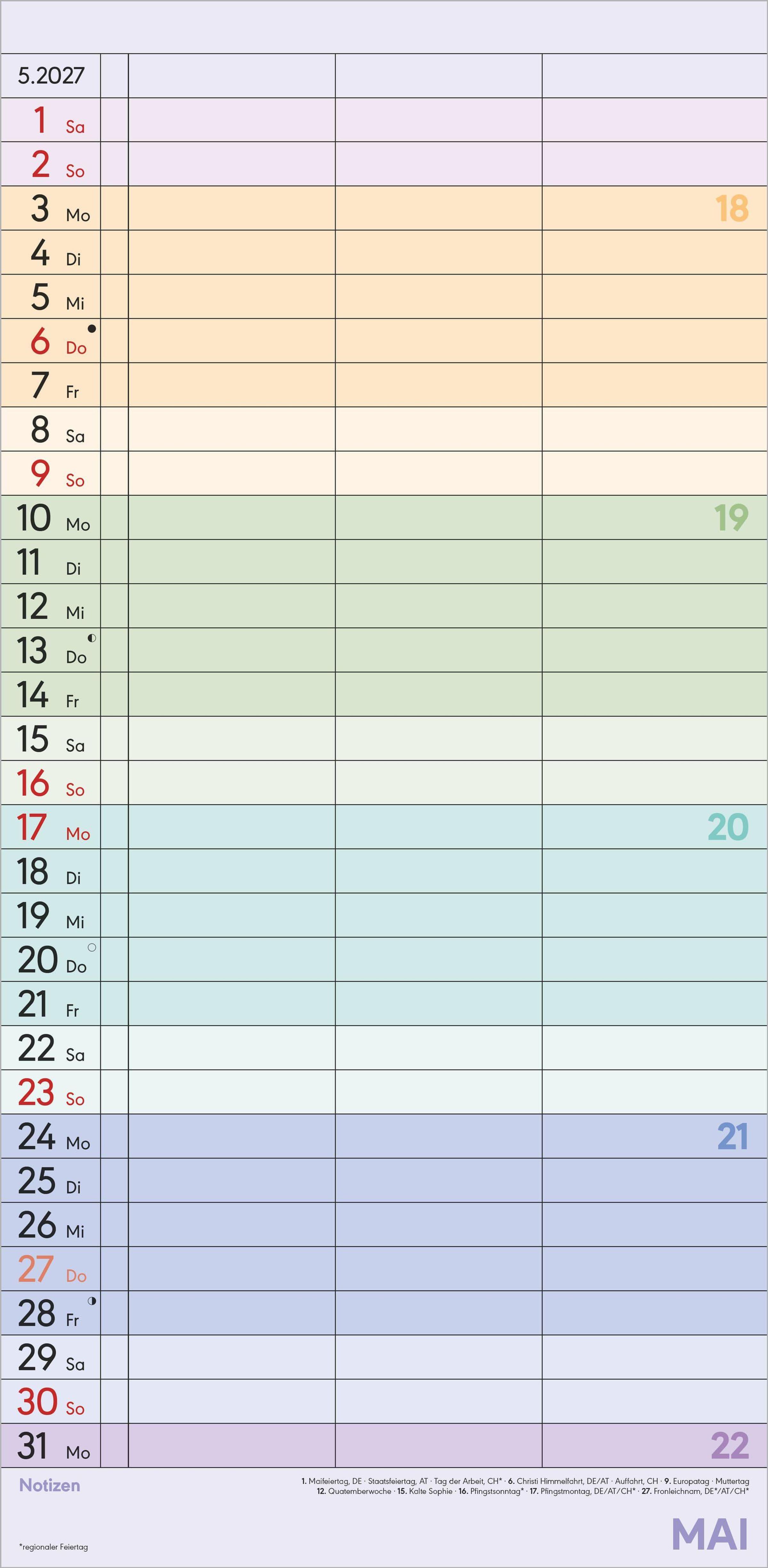 Deutschsprachiges Kalendarium: Mit Feiertagen für DE/AT/CH/FR/IT