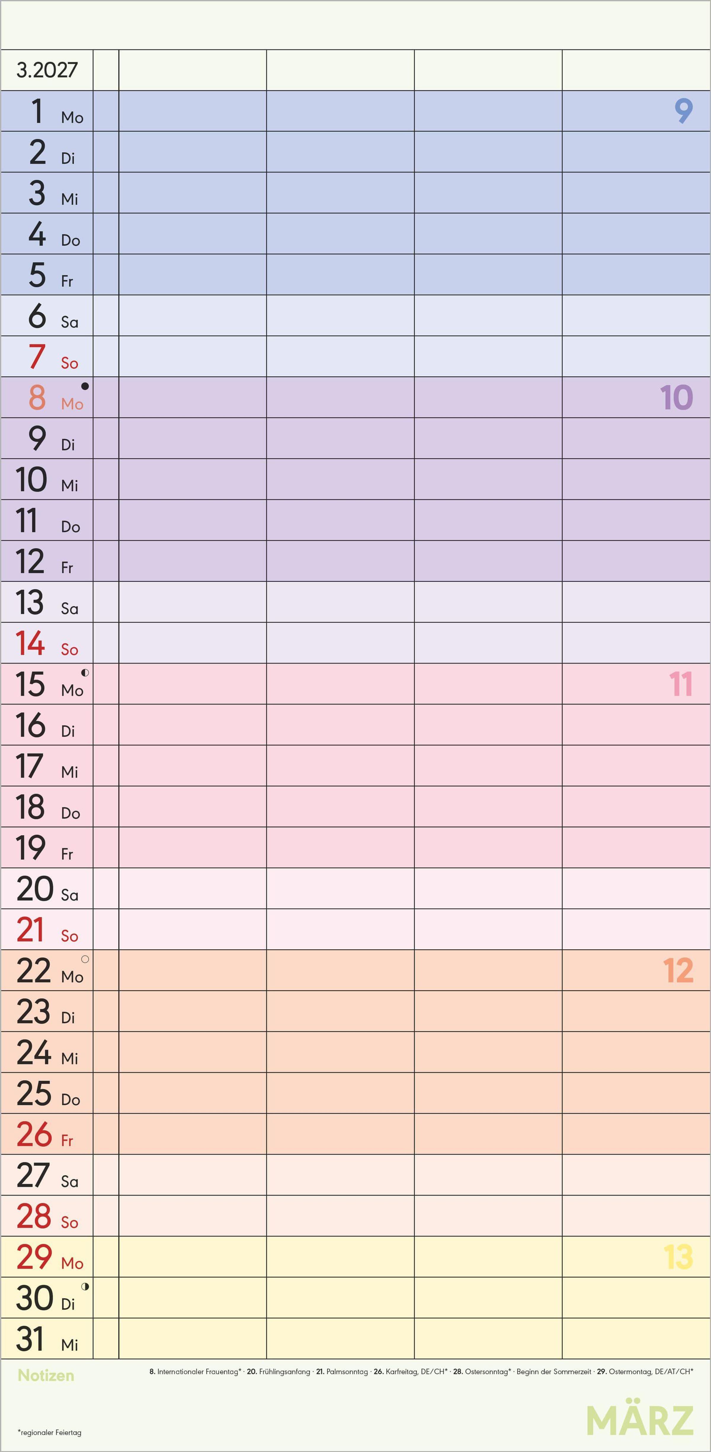 Kalenderblatt für März 2027. Titel: "Superplaner Farbenfroh 2027". Details zu Terminen und Notizen. Enthält 4 Spalten., Kalender