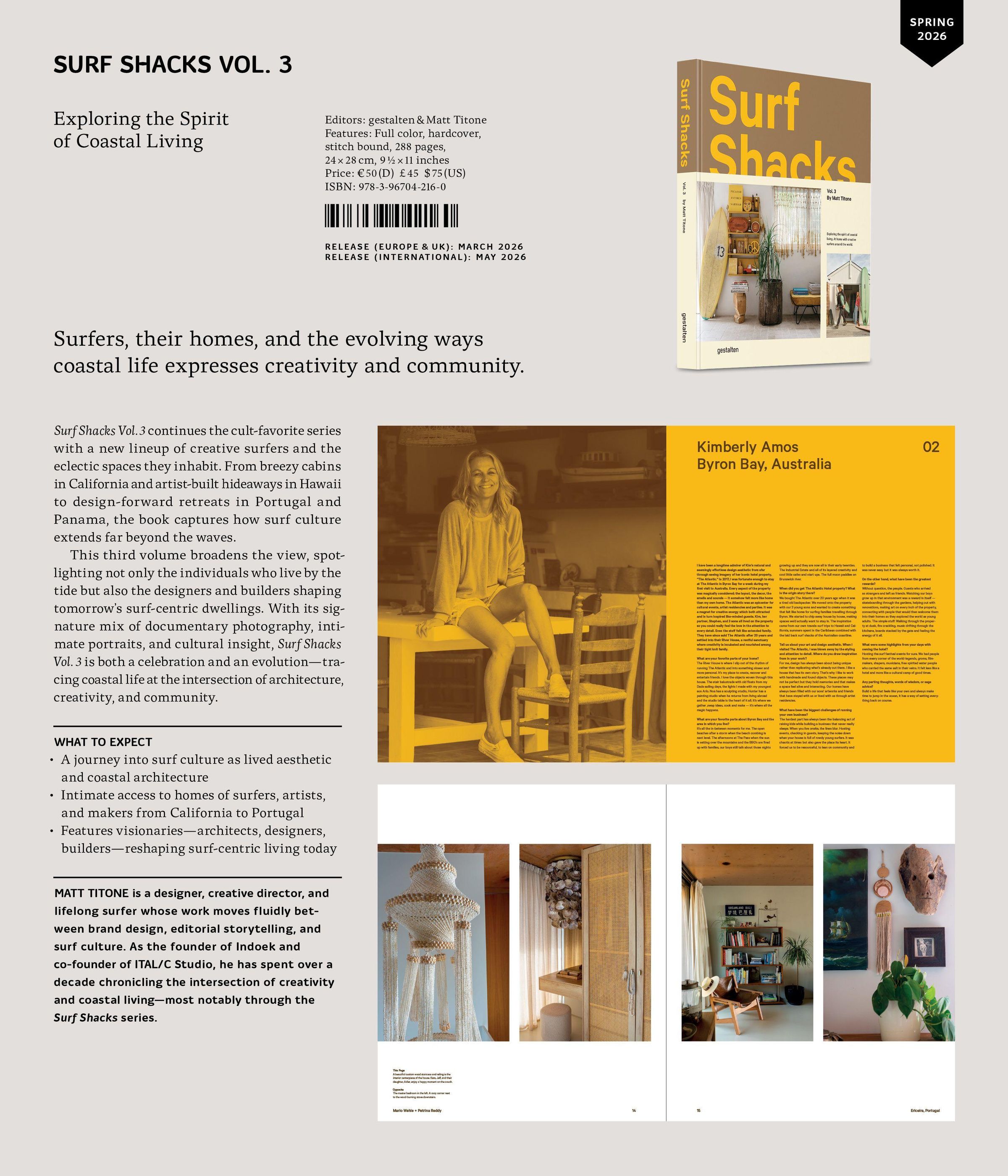Surf Shacks Vol. 3 setzt die Kultreihe fort - mit neuen Porträts kreativer Surfer: innen und der Räume, die sie bewohnen. Von luftigen Lodges in Kalifornien über handgebaute Hideaways auf Hawaii bis zu stilvollen Strandhäusern in Portugal und Panama zeigt das Buch, wie Surfkultur auch an Land Ausdruck findet. Dieser neue Band porträtiert nicht nur die Surfer: innen, sondern auch Architekt: innen, Designer: innen und Macher: innen, die neue Ideen für das Leben an der Küste entwickeln. Authentische Einblicke und kultureller Kontext machen Surf Shacks Vol. 3 zu einem Panorama von Architektur, Kreativität und Gemeinschaft.