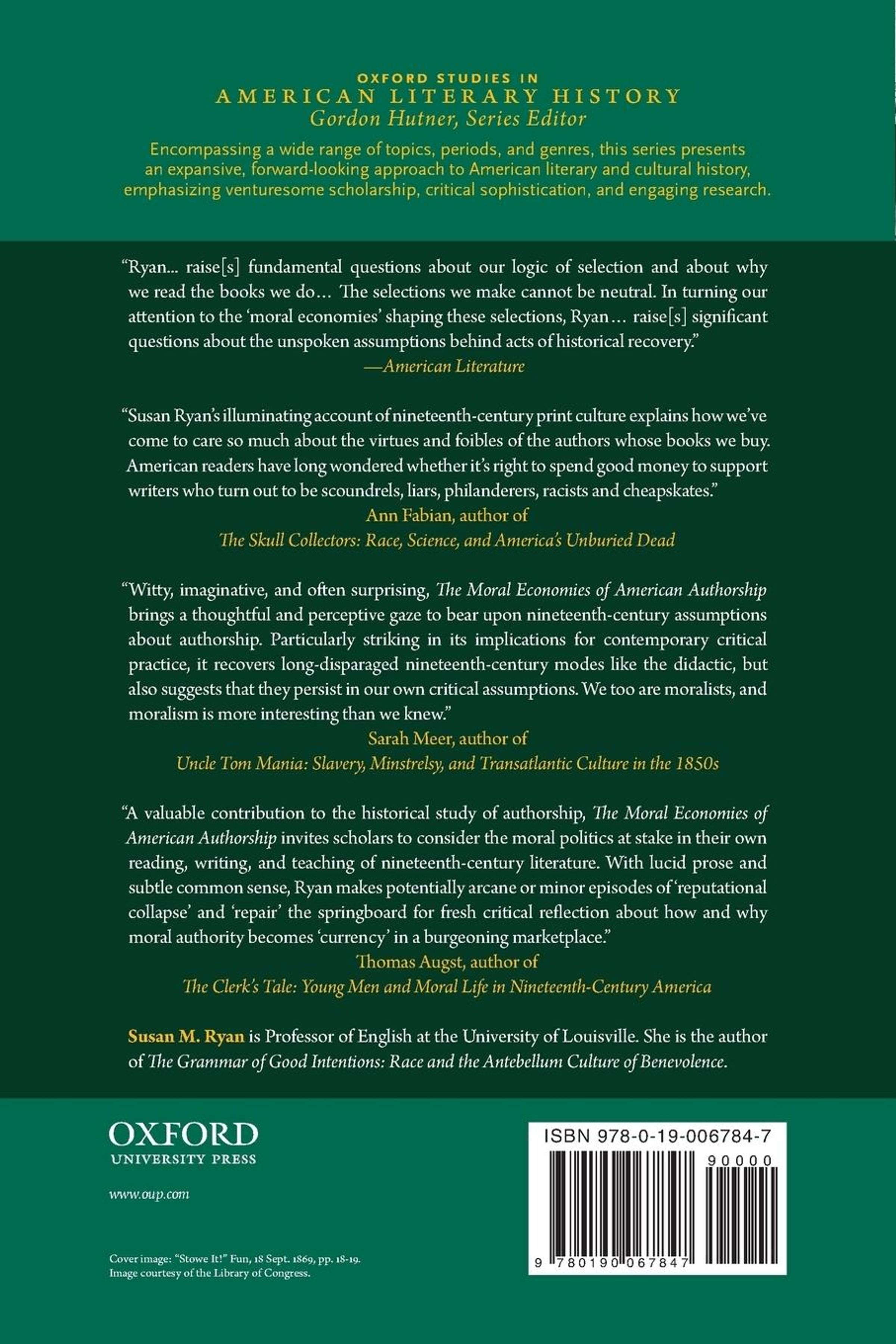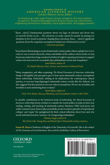 The Moral Economies of American Authorship argues that the moral character of authors became a kind of literary property within mid-nineteenth-century America's expanding print marketplace, shaping the construction, promotion, and reception of texts as well as of literary reputations. Using a wide range of printed materials--prefaces, dedications, and other paratexts as well as book reviews, advertisements, and editorials that appeared in the era's magazines and newspapers--The Moral Economies of American Authorship recovers and analyzes the circulation of authors' moral currency, attending not only to the marketing of apparently ironclad status but also to the period's not-infrequent author scandals and ensuing attempts at recuperation. These preoccupations prove to be more than a historical curiosity--they prefigure the complex (if often disavowed) interdependence of authorial character and literary value in contemporary scholarship and pedagogy. Combining broad investigations into the marketing and reception of books with case studies that analyze the construction and repair of particular authors' reputations (e. g., James Fenimore Cooper, Mary Prince, Elizabeth Keckley, Frederick Douglass, Harriet Beecher Stowe, and E. D.E. N. Southworth), the book constructs a genealogy of the field's investments in and uses of authorial character. In the nineteenth century's deployment of moral character as a signal element in the marketing, reception, and canonization of books and authors, we see how biography both vexed and created literary status, adumbrating our own preoccupations while demonstrating how malleable--and how recuperable--moral authority could be.