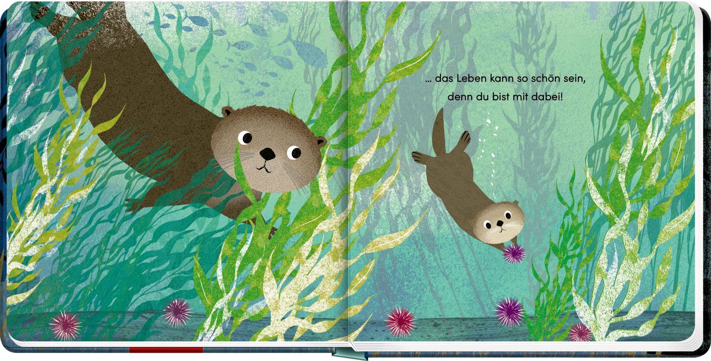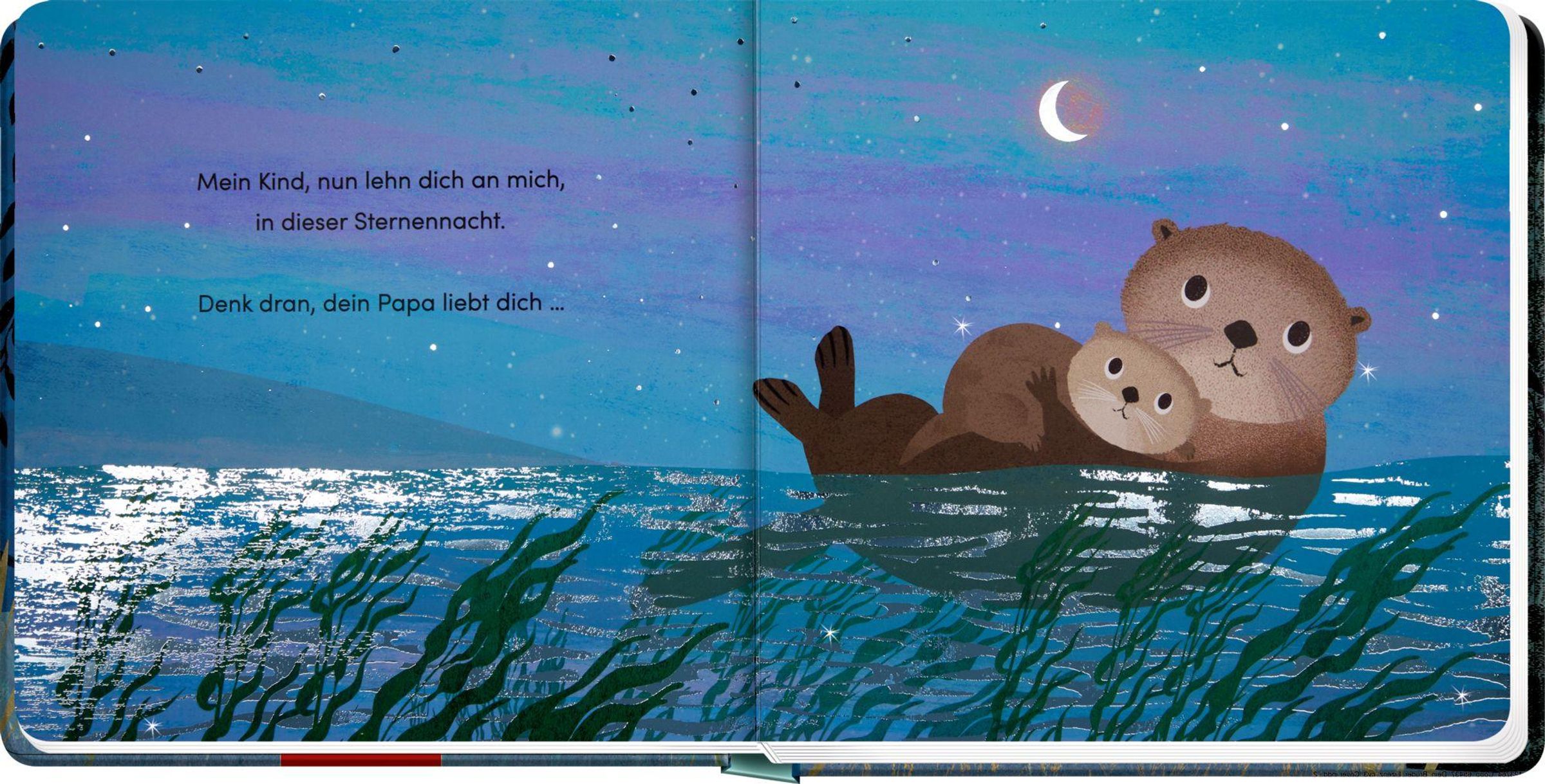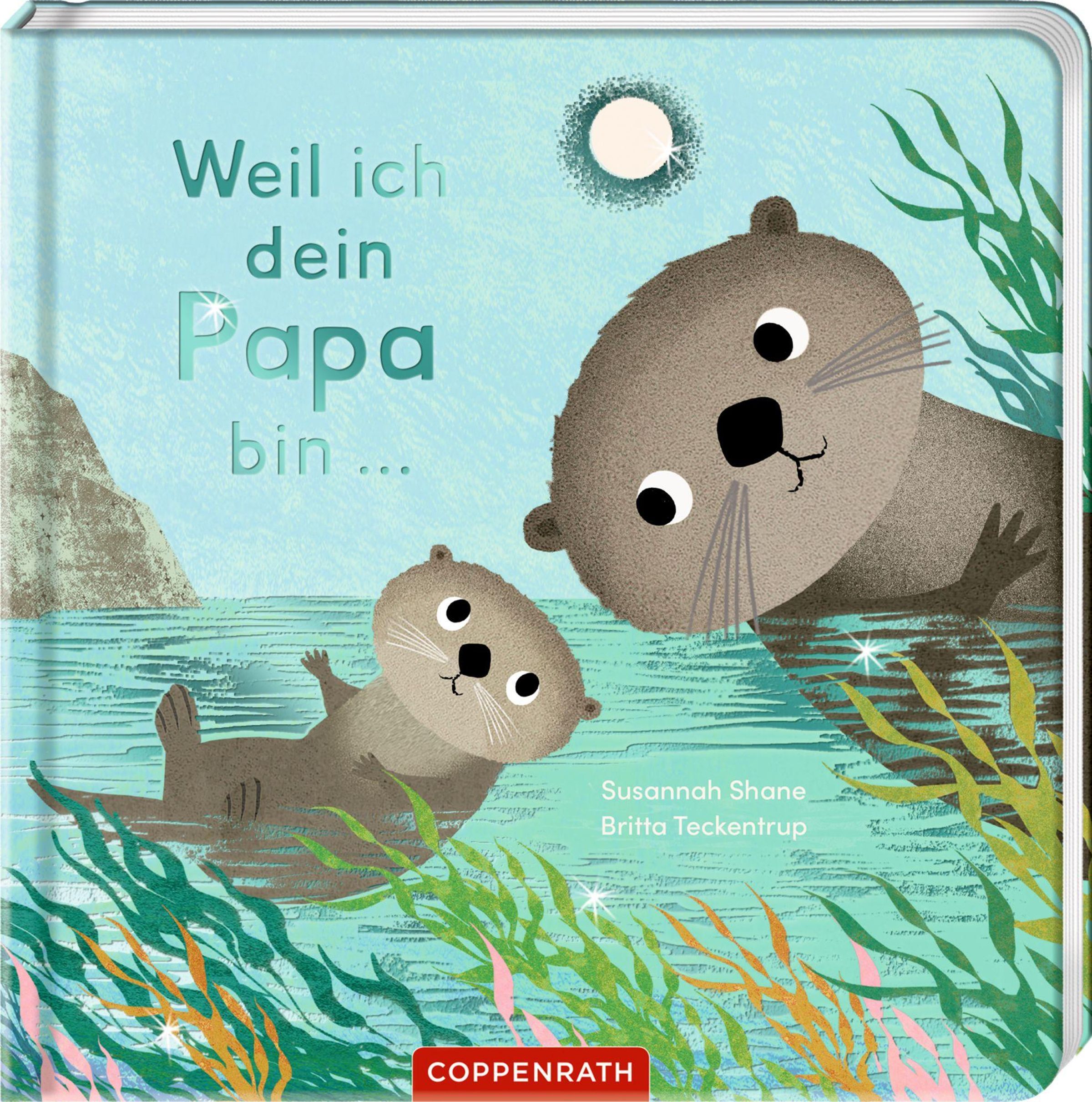 Text: "Weil ich dein Papa bin...", Autoren: Susannah Shane, Britta Teckentrup. Illustration von zwei Ottern im Wasser., Buch
