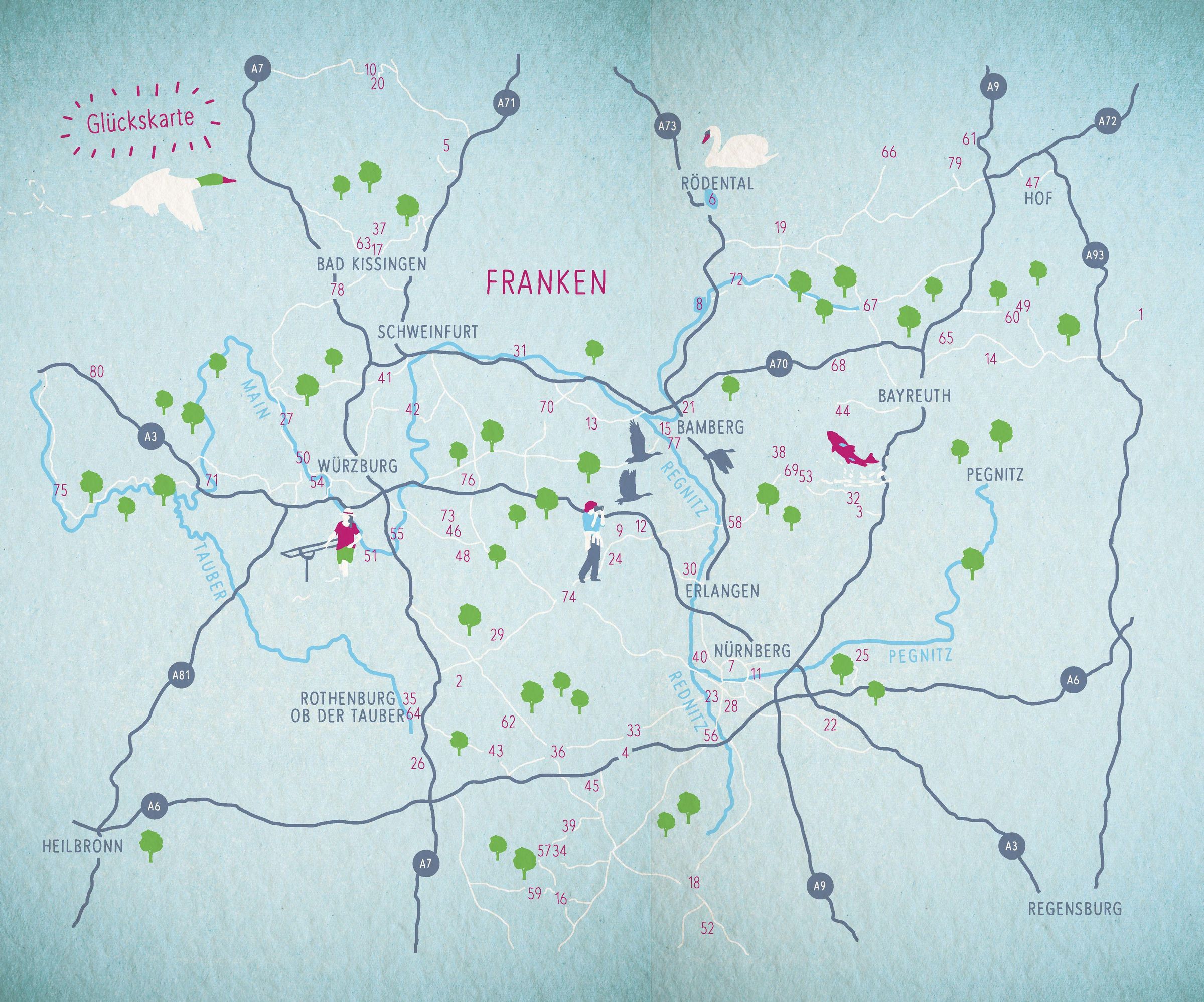 Versteckte Quellen, glitzernde Seen und plätschernde Brunnen - Franken ist eine zauberhafte Wasserwelt voller Wunder. Kultur, Tradition und Naturschätze gibt es an den 80 blauen Glücksorten im Herzen fränkischer Gemütlichkeit zu entdecken, von malerischen Flüssen mit bewegenden Geschichten bis zu mediterranen Oasen purer Entspannung. Willkommen in einer Region, wo Wasser die Seele berührt und jede Entdeckung zu einem unvergesslichen Glücksmoment wird!
