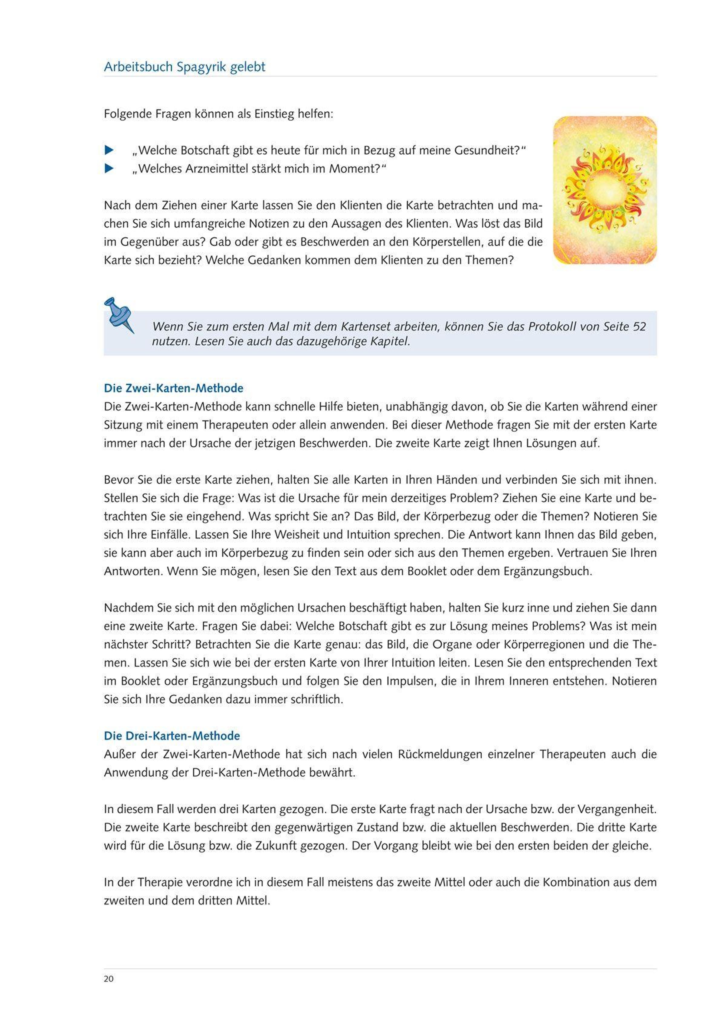 In diesem Workbook liegt der Schwerpunkt darauf, die inhaltliche Arbeit mit dem Kartenset weiterzuentwickeln. Während das Kartenset Impulse sowohl für die Anamnese als auch für die Therapie liefert, die dann vom Therapeuten gemeinsam mit dem Klienten besprochen und geplant werden kann, enthält das Arbeitsbuch konkrete Handlungsanleitungen für die Arbeit mit dem Kartenset und dem Buch.