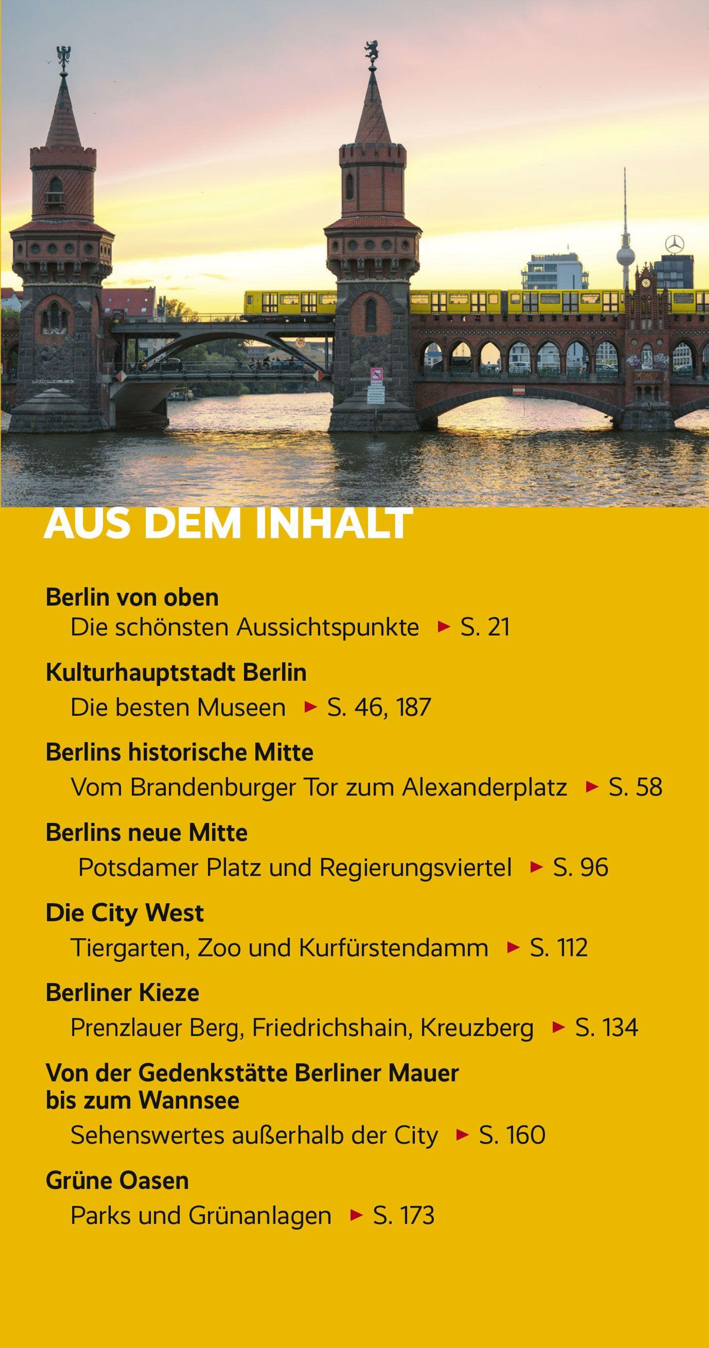 Berlin ist immer eine Reise wert - auch eine kurze. Die abwechslungsreiche Museumslandschaft, ein buntes Nachtleben und der Charme des Unfertigen ziehen Menschen aus aller Welt in die Spree-Metropole. Spaziergänge führen zu den wichtigsten Sehenswürdigkeiten: vom Brandenburger Tor über die Museumsinsel zum Alexanderplatz, zum Potsdamer Platz und durch das Regierungsviertel. Die City West mit Ku'damm, Zoologischem Garten und Schloss Charlottenburg wird ebenso präsentiert wie die Kiez-Highlights in Prenzlauer Berg, Friedrichshain, Kreuzberg und Neukölln. Wer länger bleibt, findet Anregungen für Ausflüge in die Außenbezirke und ins nahe Potsdam. Und auch wer schon öfter in Berlin war, wird beim nächsten Besuch wieder Neues entdecken.