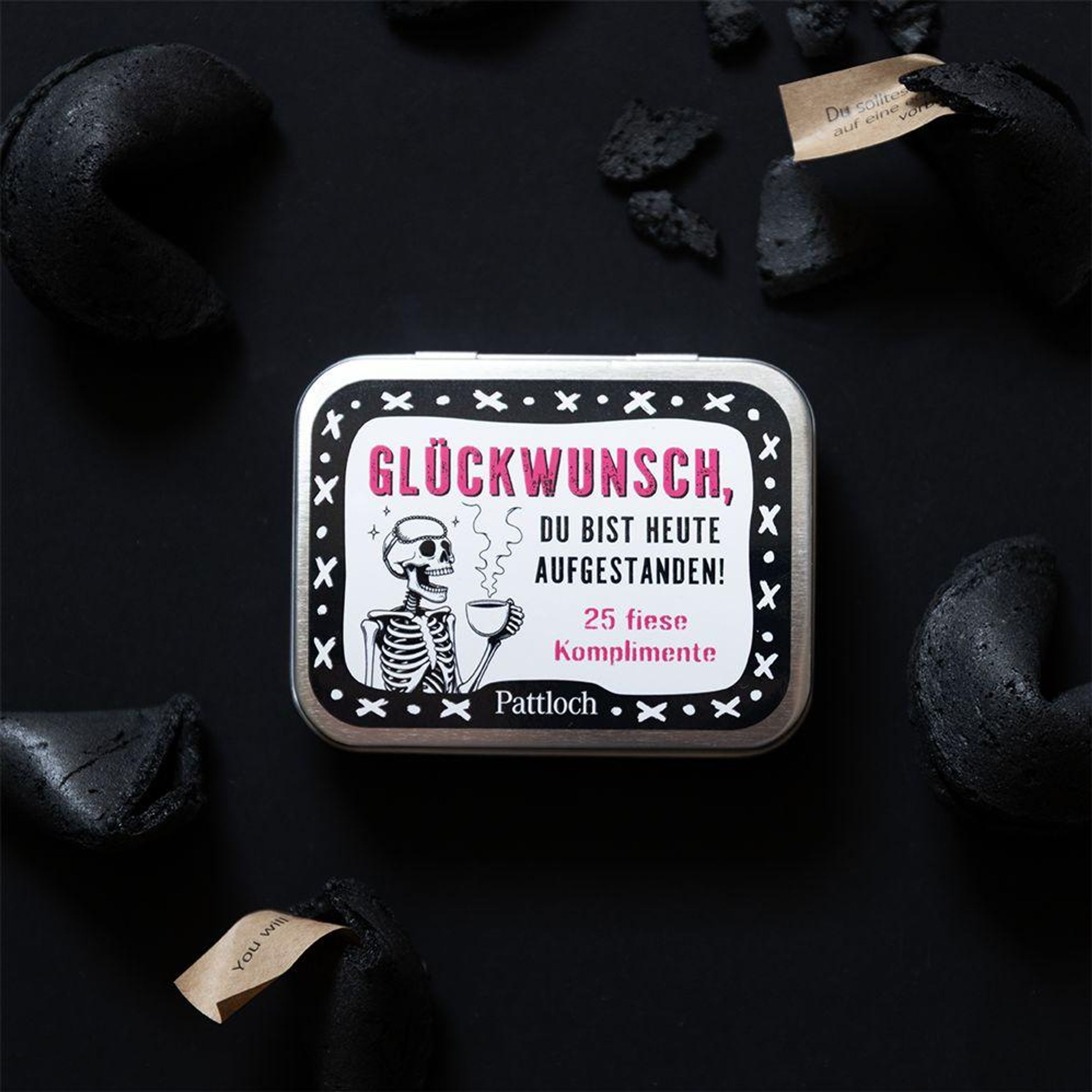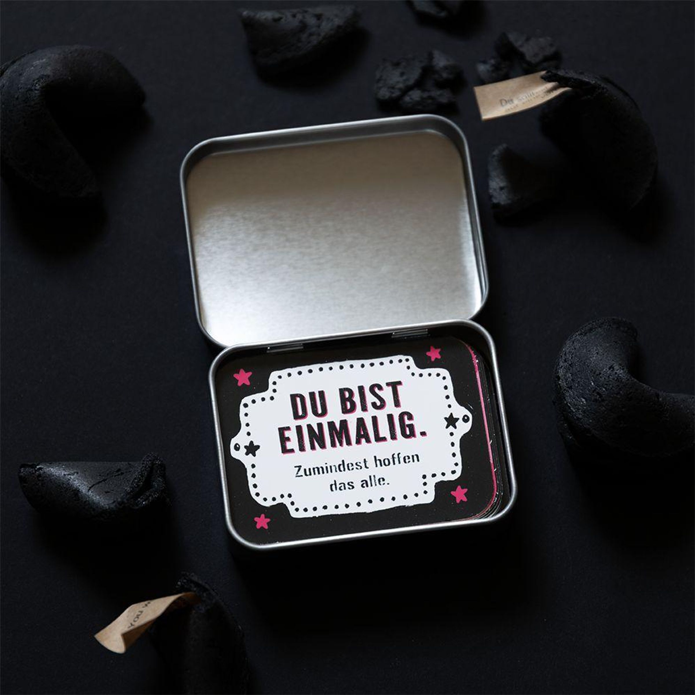 Manchmal lässt sich Zuneigung nicht besser ausdrücken als mit einer ordentlichen Prise schwarzem Humor. Dann kann diese Metalldose mit 25 fiesen Komplimenten gezückt und dein Gegenüber mit liebevollen Gemeinheiten überschüttet werden. Egal, ob es sich um die beste Freundin, den verpeilten Mitbewohner oder den Lieblingskollegen handelt - unter den witzig gestalteten Lobkärtchen findet sich für jede*n eine passende Beleidigung! Ein erfrischend böses Geschenk, das einen schmunzeln lässt und daran erinnert, das Leben nicht immer so ernst zu nehmen.