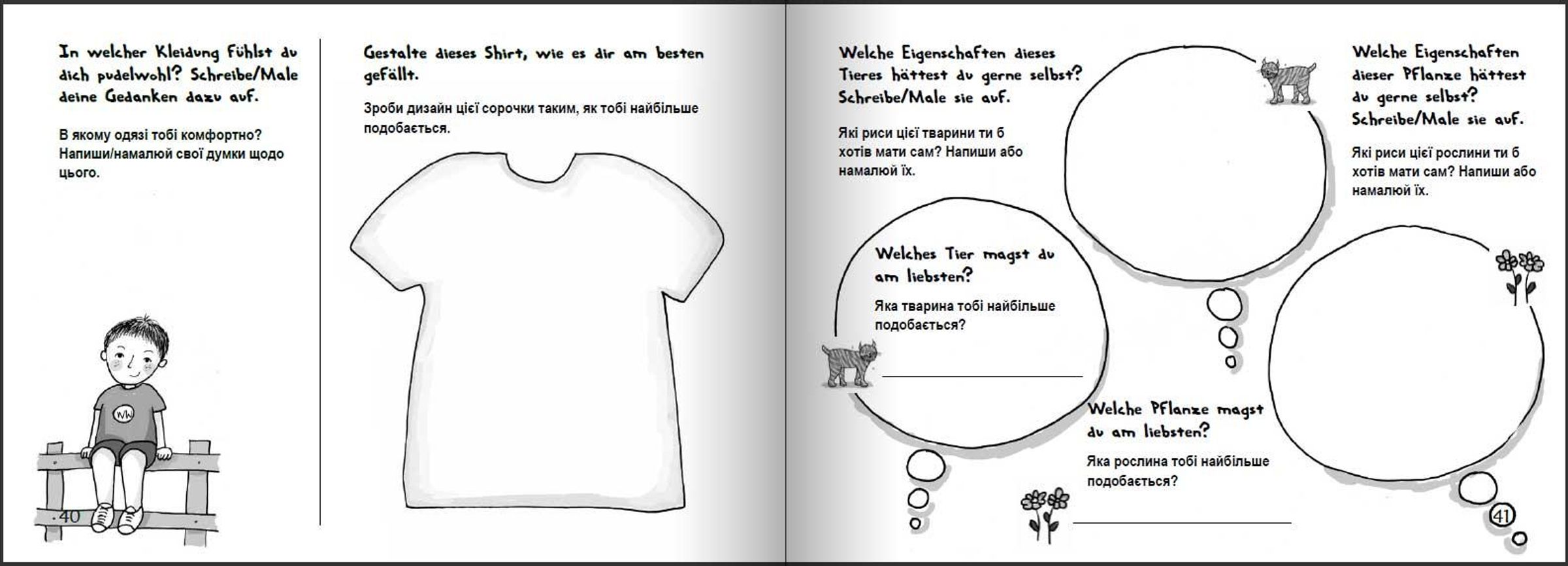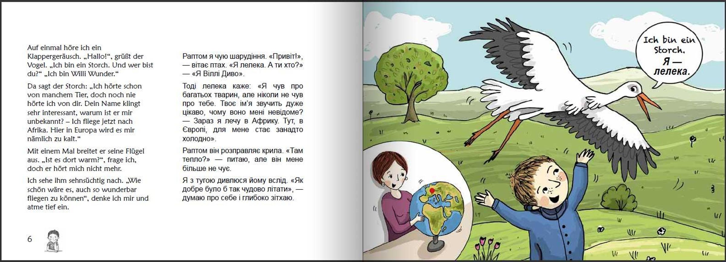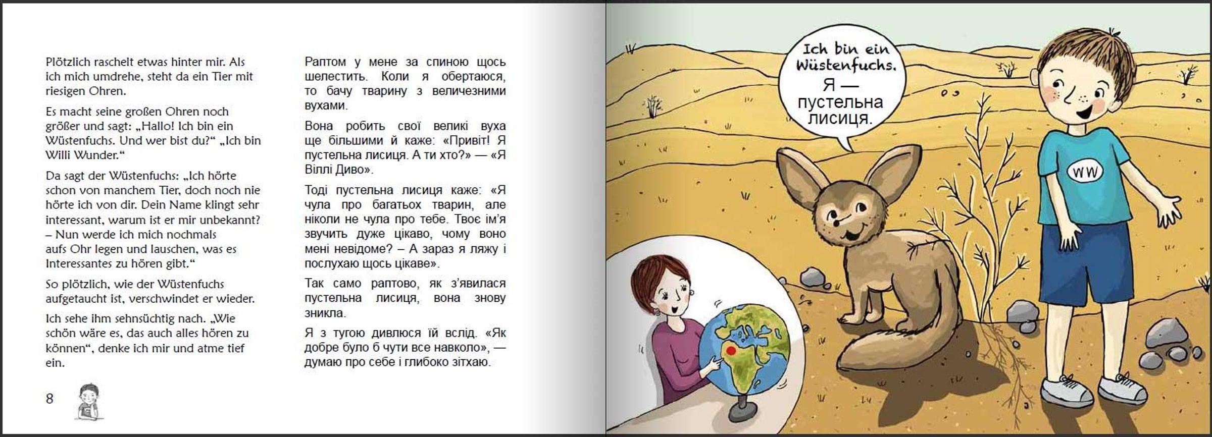 Etwas Wunderbares passiert eines Tages in Willi Wunders Leben: Aus einem Spaziergang wird eine Weltreise. Dabei trifft er die unterschiedlichsten Tiere. Sie alle verfügen über bestimmte Fähigkeiten. Willi Wunder fragt sich: "Wie wäre es, genau so zu sein wie diese Tiere? Wie wäre es, selbst zu fliegen, bis zum Meeresgrund zu tauchen und riesengroße Ohren zu haben?" Mama hilft ihm zu sehen, dass die Phantasie Träume wahr werden lässt und dass jedes Lebewesen einzigartig ist. Auch Willi Wunder, der sich darauf freuen darf, all die Wunder in sich selbst und um sich herum zu erkunden. "Willi Wunder - Das Bilder-Erzählbuch für alle Kinder, die ihre Einzigartigkeit entdecken wollen" ist fröhlich illustriert und unterstützt mit zahlreichen Mit-Mach-Seiten, eigene Stärken und Besonderheiten zu erkennen. Darüber hinaus werden Kinder zu einem achtsamen Umgang mit sich selbst und ihrer Umwelt eingeladen und erfahren, warum Tiere, Natur und Mutter Erde so wertvoll für uns sind. Odnoho razu v zhytti Villi Dyva vidbuvayet'sya shchos' dyvovyzhne: Prohulyanka peretvoryuyet'sya na navkolosvitnyu podorozh. Po dorozi vin zustrichaye vsilyakykh tvaryn. Usi vony mayut' pevni zdibnosti. Villi Dyvo zapytuye sebe: "Yak buty takym, yak tsi tvaryny? Yak shchodo toho, shchob samomu litaty, pirnaty na dno morya i maty velychezni vukha?" Mama dopomahaye yomu pobachyty, shcho uyava vtilyuye mriyi, y shcho kozhna zhyva istota unikal'na. Villi Dyvo z neterpinnyam chekaye na doslidzhennya vsikh chudes u sobi ta navkolo n'oho. "Villi Dyvo - knyzhka z kartynkamy dlya vsikh ditey, yaki khochut' vidkryty dlya sebe svoyu unikal'nist'". Knyha tsikavo ilyustrovana ta mistyt' bezlich praktychnykh storinok "Robymo razom", shchob diznatysya pro svoyi syl'ni storony ta osoblyvosti. Krim toho, dityam proponuyet'sya dbaylyvo stavytysya do sebe i svoho otochennya i diznatysya, chomu tvaryny, pryroda ta Maty-Zemlya taki tsinni dlya nas. *** Reihe SOWAS! für Kinder und Jugendliche * in einfacher Sprache geschrieben * zum Schulunterricht geeignet * für Beratungsstellen geeignet * alle Titel unter SOWAS-Buch. de * SOWAS!-Bücher gibt es seit 2008 * ***